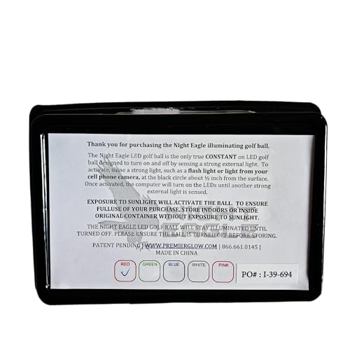 "The Night Eagle LIGHT-UP Golf Ball is a glowing golf ball whose built-in LEDs can be activated or deactivated by a strong light source (e.g. phone light). No more rushing while playing! The ball lights up until you deactivate it (timer-less). The glow lasts for a total of about 35 hours, equivalent to approximately 9 complete rounds of golf over 18 holes.