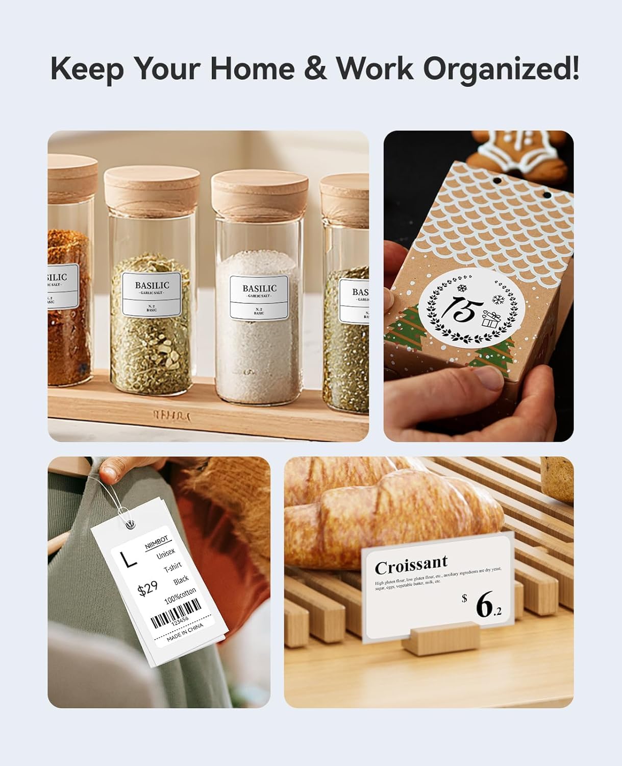 ["B1 Label Printer Kit: This kit includes 1 x upgraded B1 label printer and 3 rolls of labels (1*white 2x1.2in, 1*white 2x3.2in, 1*white round 2x2in). Compared to a regular label printer, this label printer kit can cover label needs in more situations and save money.","EASY TO USE: The B1 Bluetooth label maker supports iOS, Android, and PC. The app supports more than 30+ fonts/languages, 100+ frames, and 1500+ symbols. Just download the app, select the B1 printer model from the NIIMBOT APP, and connect, then have fun printing.","PORTABLE & SMALL: The B1 label printer comes with a 1500mAh lithium battery for convenient and fast printing. One battery charge can support 4 hours of work, so you don't need to buy batteries. The label printer automatically turns off if idle for 15 minutes to save power.","INK-FREE LABEL MAKER - BPA-free direct thermal technology. NIIMBOT B1 label printer with adhesive tape, 2x1.2in. B1 label printer supports label widths of 0.8-2in. Size of the mini label printer: 5.1 x 3.5 x 2.4in","B1 PORTABLE LABEL MAKER - Made of high-quality ABS with a fashionable appearance, widely used in supermarkets, stores, clothing, jewelry, small businesses, office, and home organizations. Ideal for Valentine's Day, Halloween, Thanksgiving, Christmas, and holiday gifts for your family and friends.","FREE REPLACEMENT SERVICE - You can adjust the content and position of the labels to create a label that meets all your requirements. If your label printer fails to start or is too faulty to repair, the NIIMBOT label printer supports a free replacement service for up to 12 months. You can enjoy our lifetime premium customer service, we provide technical support and answer all questions promptly."]