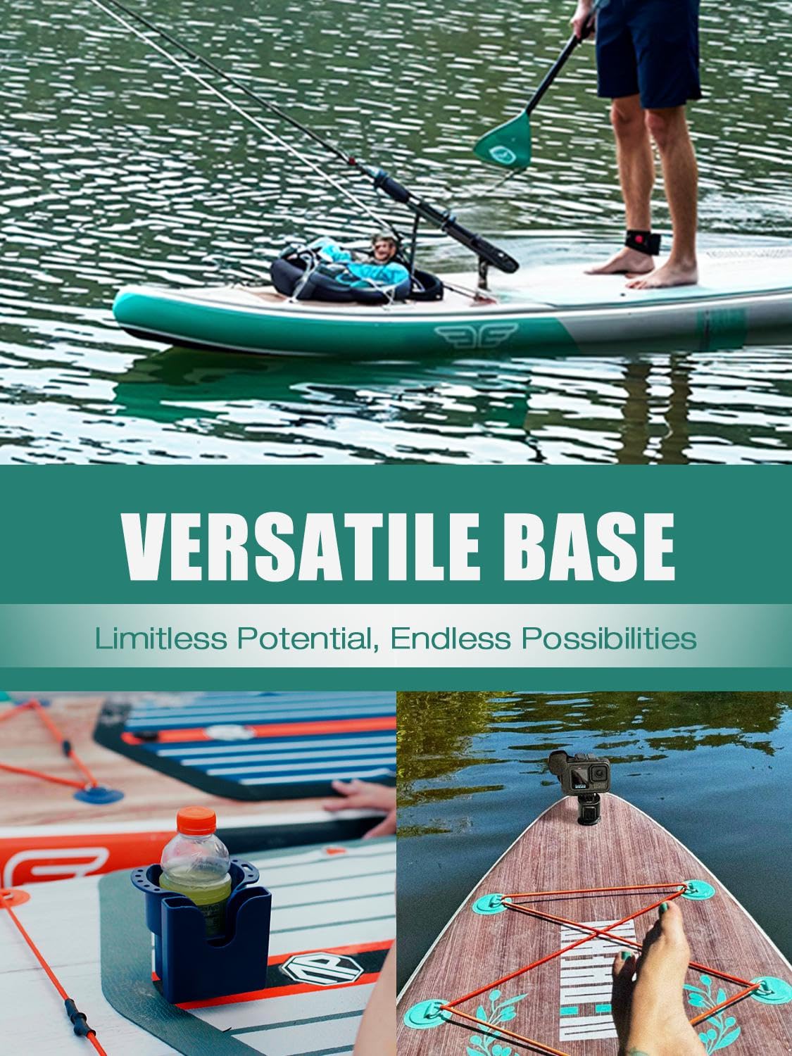 ["Versatility for Various Scenarios"]- The SUP Board is equipped with two multifunctional mounts to attach accessories such as camera mounts, cup holders, and fishing rod holders. The nose and tail of the board are equipped with bungee cords that offer customization options for different preferences. This paddleboard can be used in various waters such as the ocean, lake, and river, and is versatile enough for yoga, surfing, and fishing.