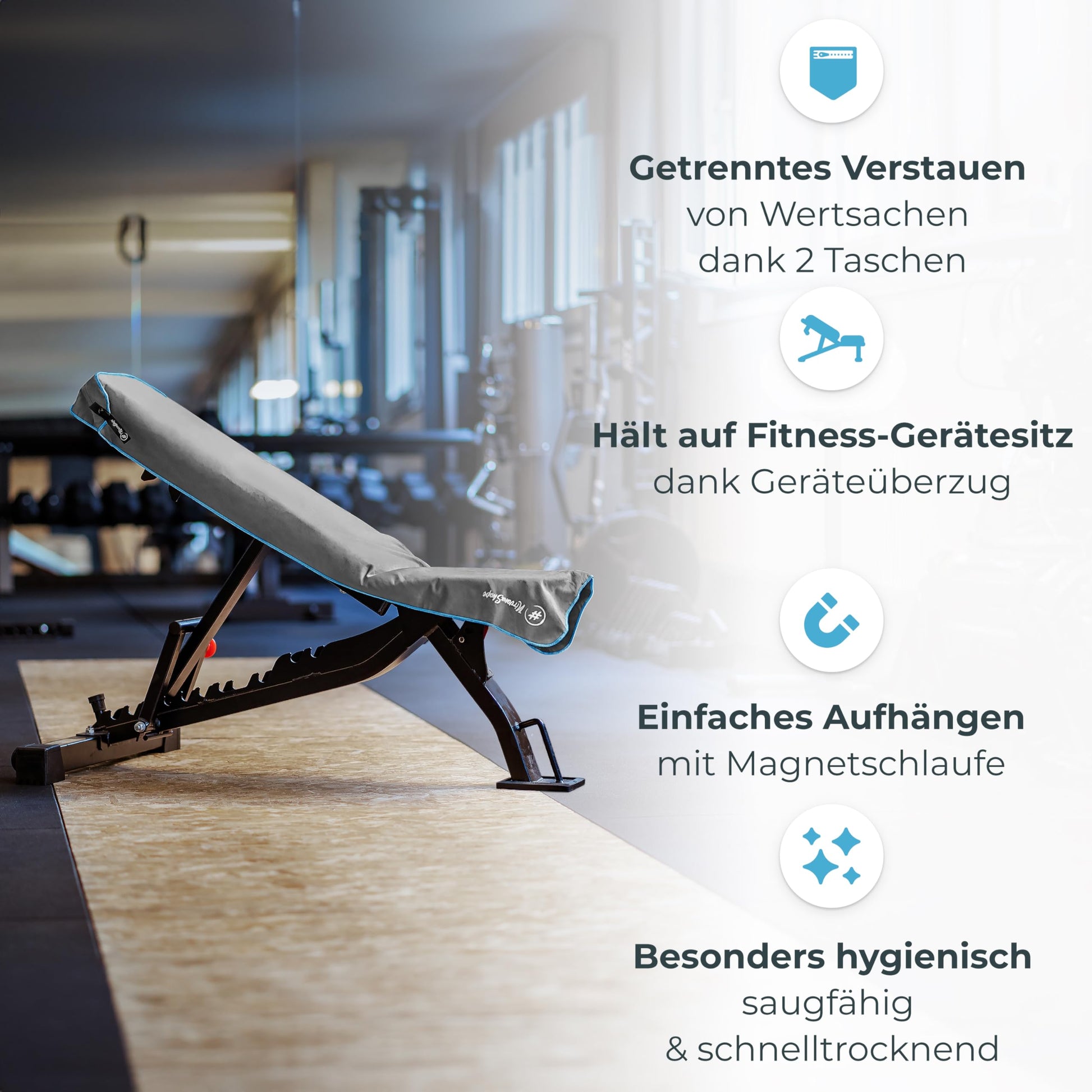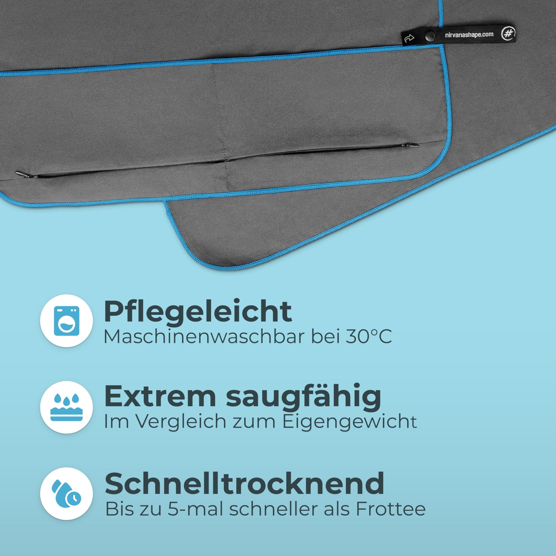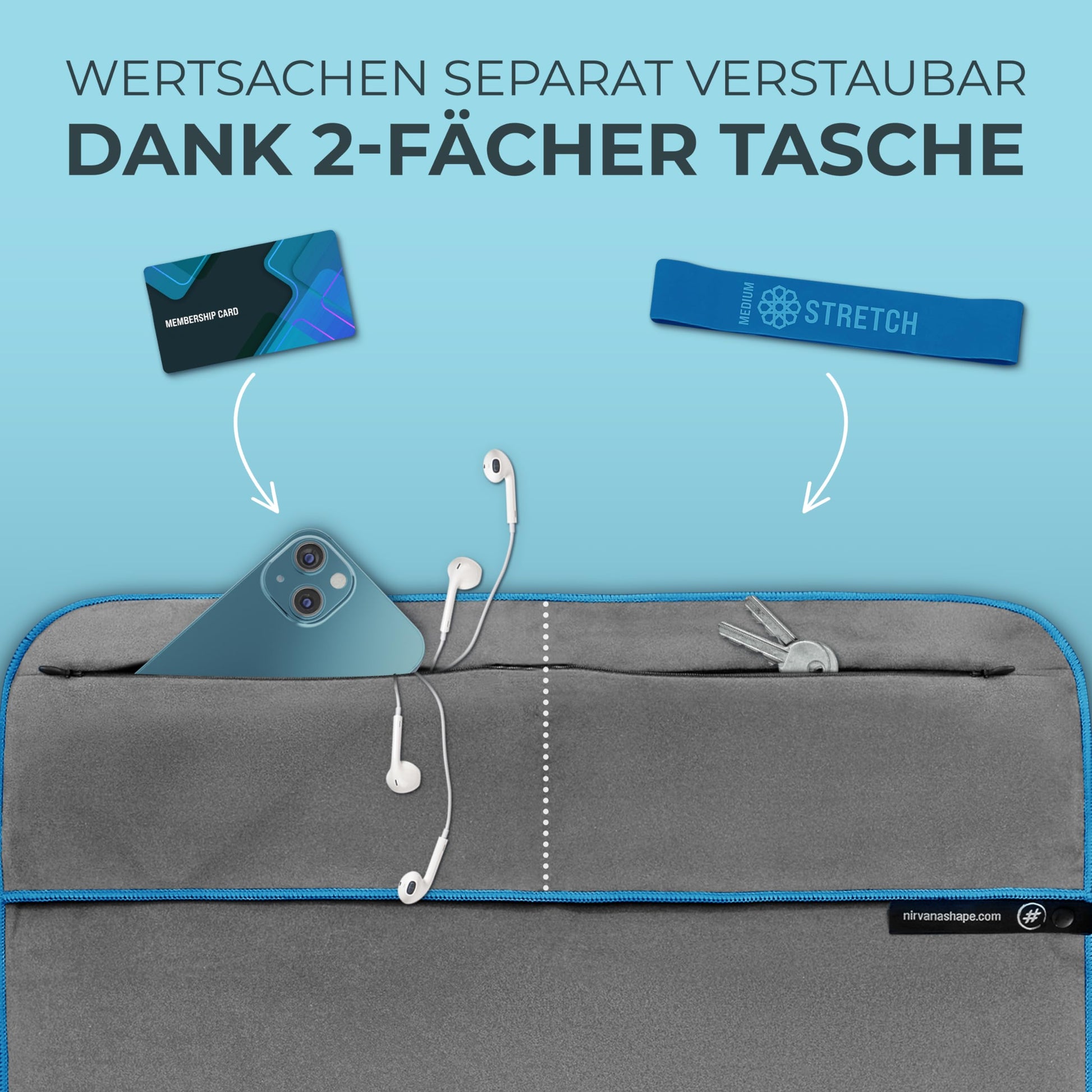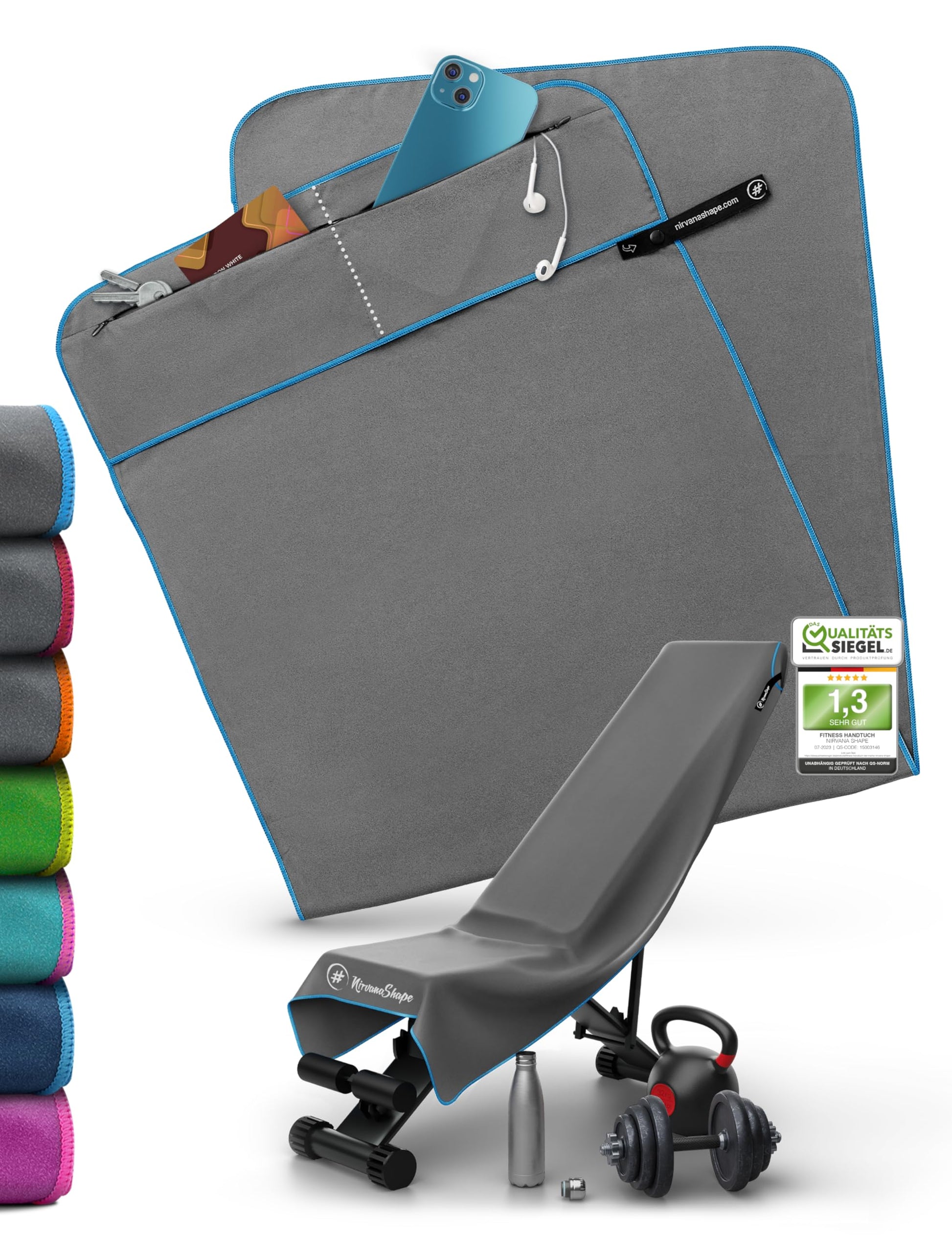 ["SMART FEATURES - Compact sports towel with 2-way zipper pocket and magnetic clip, for men and women. Functional device cover for optimal grip on the weight bench and all fitness equipment.", "ABSORBENT & QUICK-DRYING - The NirvanaShape fitness towel made of microfiber can absorb approximately 8 times more water and dries up to 5 times faster compared to a terry cloth towel. Therefore, it is also commonly used as a sports shower towel.", "2-COMPARTMENT POCKET with zipper - Securely store your valuables in your NirvanaShape sports towel. The 2 separate pockets prevent scratched phone screens and searching for your belongings.", "HYGIENE - Benefit from the visible equipment and body side of this gym towel. Additionally, the fitness towel is machine washable at 30°C with a removable magnetic clip.", "ECO-FRIENDLY - 100% CO2-neutral: We offset the transport of our microfiber gym towels with our partner atmosfair - awarded as the No. 1 winner in the category of 'compensation quality'.", "IDEAL FOR: Your workout at the gym, as a hygienic equipment bench mat, an essential gym accessory"]