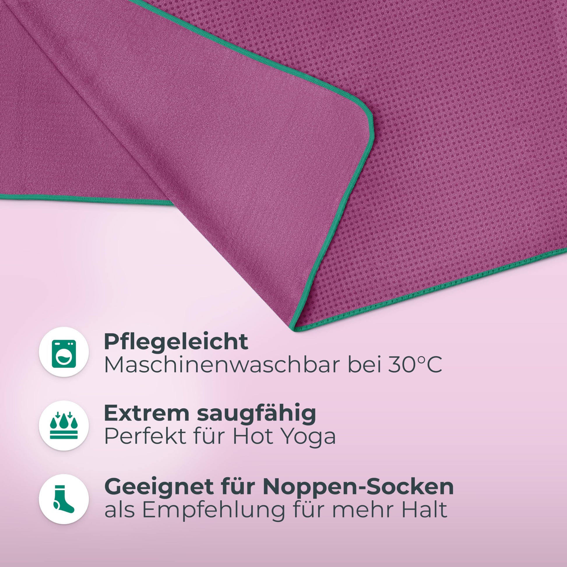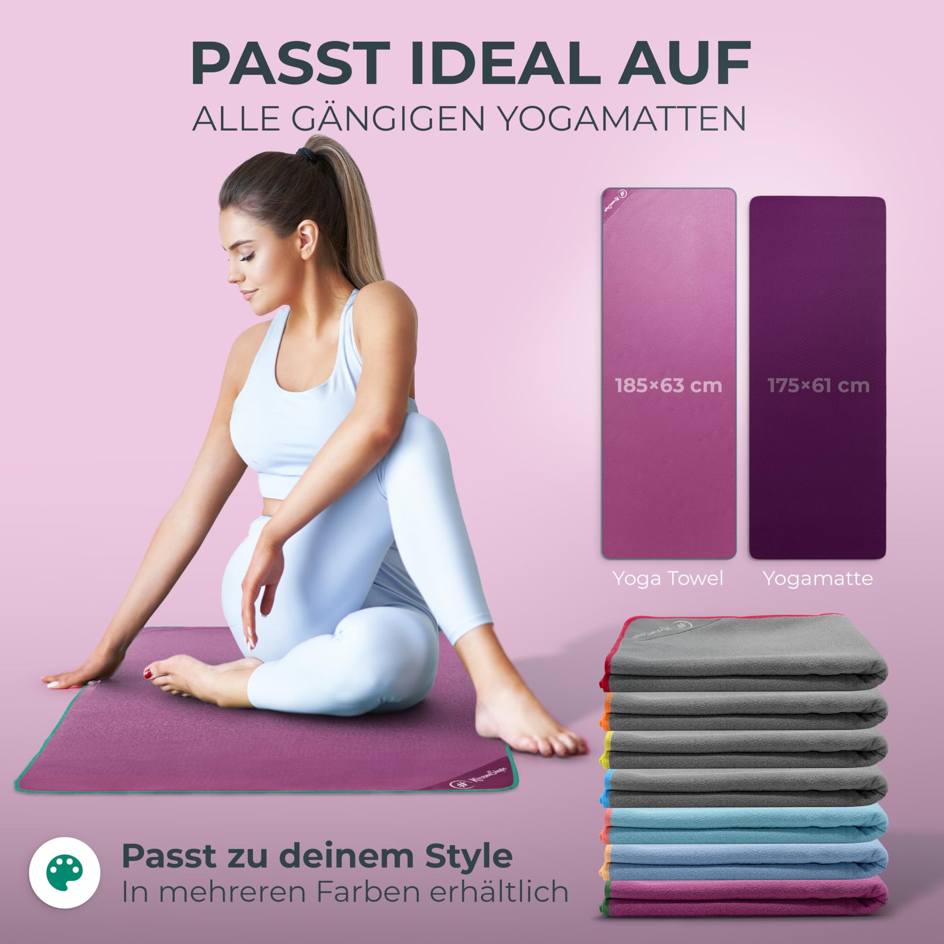 ["NIRVANA SHAPE: We believe in authentic experiences. We designed this yoga towel for you to enhance your yoga experience. Only with us you get the "Yoga Introduction eBook" for free.","YOGA TOWEL NOBES: The one-sided nub coating ensures a tight grip of the towel on the mat. To ensure optimal grip for your feet in every pose on the towel, we recommend using nubbed socks as well.","PERFECT AS YOGA MAT COVER: This yoga towel is designed as a yoga mat cover and fits all standard yoga mats. Tip: Grab it now, as popular colors could sell out quickly.","HYGIENIC & FREE OF HARMFUL SUBSTANCES: The high-quality microfiber is particularly absorbent and free of BPA harmful substances. The mat towel protects your yoga mat and can be easily washed at up to 60 degrees.","IDEAL FOR: Yoga beginners and advanced practitioners, training in yoga studios, hot yoga, all asanas and yoga styles such as Ashtanga, Anusara, Bikram and Hatha"]