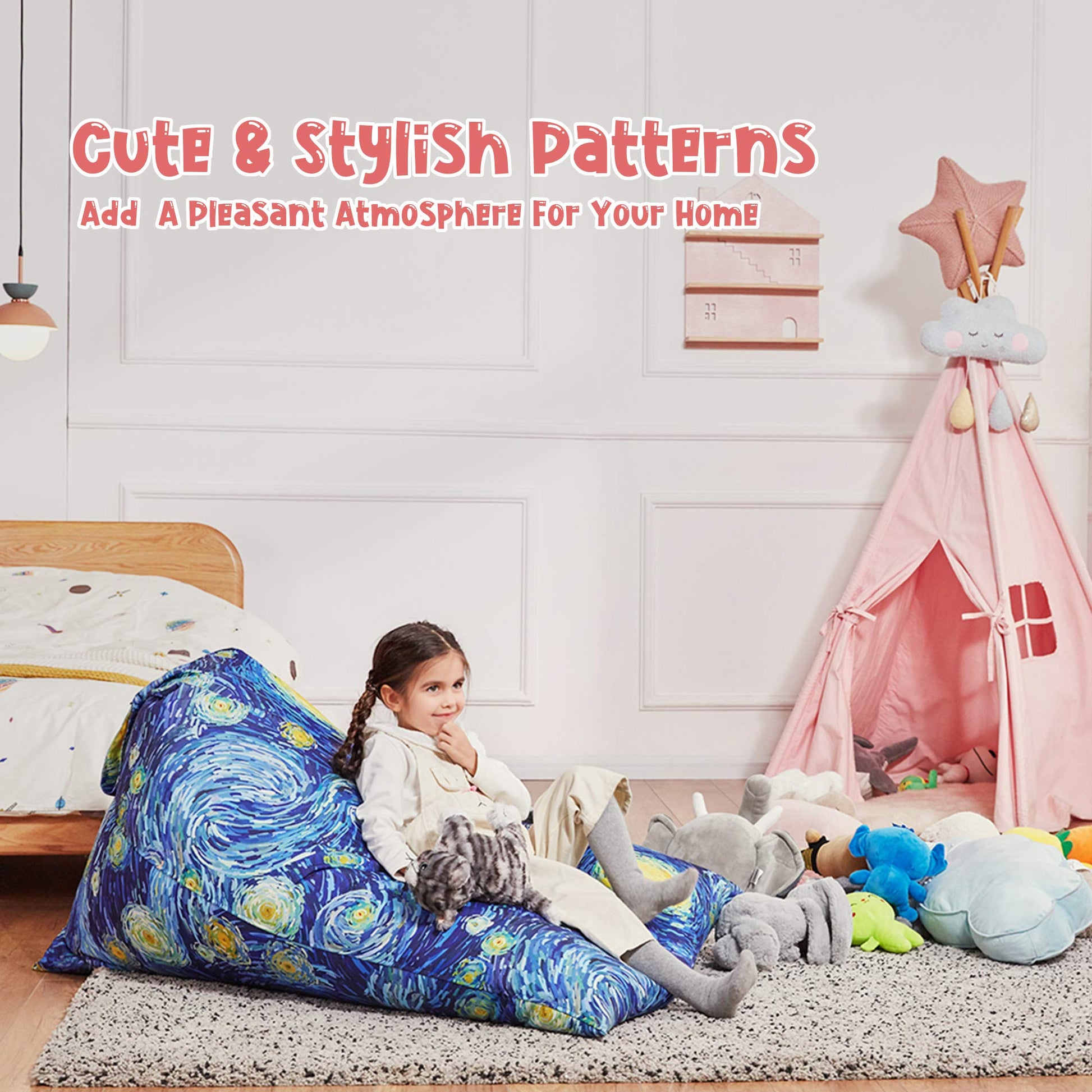 "Soft material: We have upgraded the fabric from the old design to a thicker, softer, more durable canvas to meet people's demands for more comfortable and softer products. Advanced stitching technology and reinforced seams make the product never tear. (cover only)","Decorative and functional: 9 well-designed patterns, cute or fresh, to meet the different needs of you and your children, bringing a bright light into your sweet home and creating a more pleasant atmosphere. Unlike other bird's nest bean bags on the market, its triangular shape provides a comfortable seat with head and back support for reading books, playing games, or just relaxing. Suitable for toddlers, teenagers, and adults.","Tame the chaos. This is a sweet home for a large amount of stuffed animals that your children love. You can also fill it with foam, toys, pillows, blankets, clothes, or other soft things. It transforms chaos into functional storage that doubles as a bean bag.","Perfect gift: A lovely family gift helps children and parents to bond. This soft, warm, and comfortable toy storage bag will bring more joy between children and parents. It's a fun way to encourage your child to tidy up the chaos. Why not consider it as a perfect gift for someone special to you?","Tipitopi"