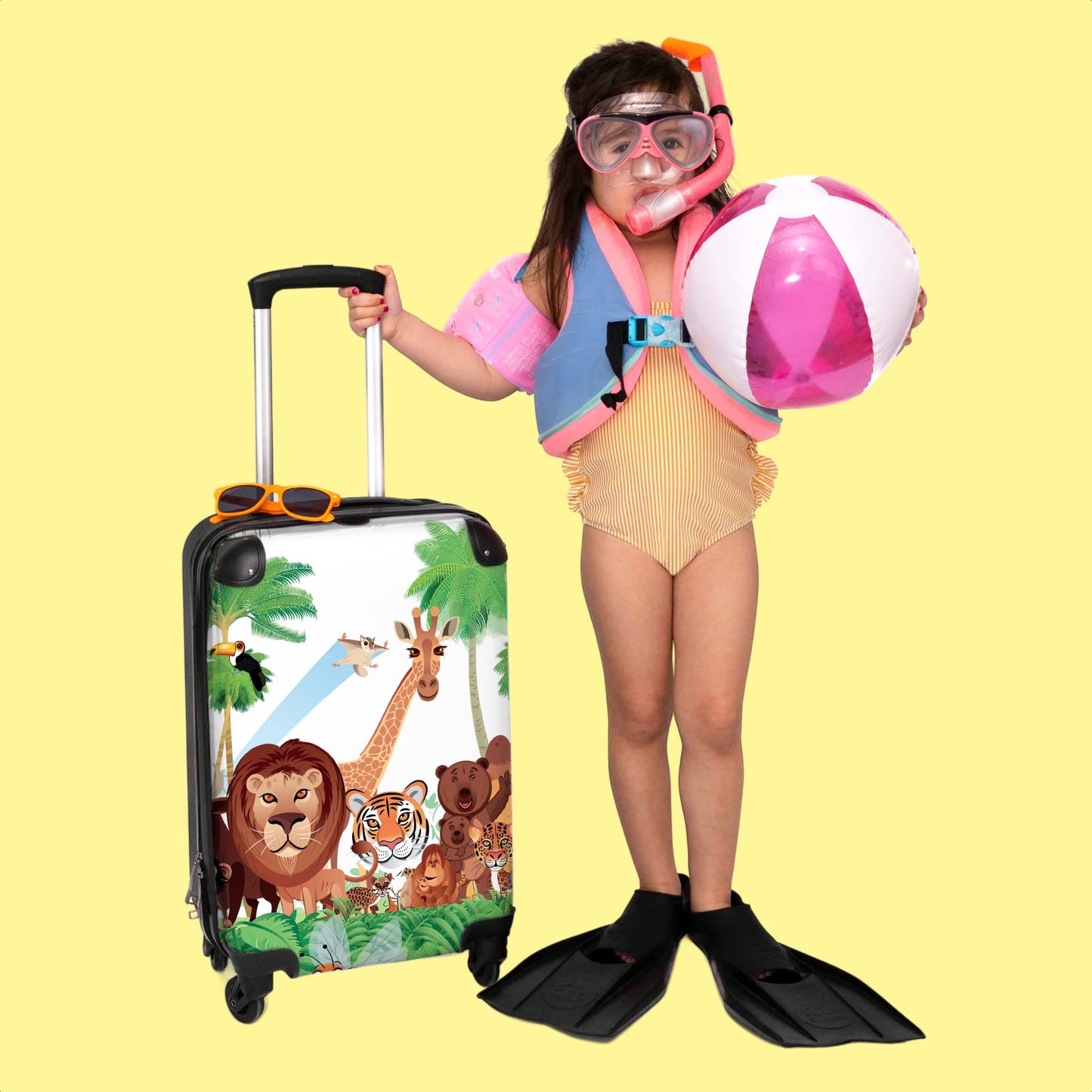 NoBoringSuitcases.com® Kids' carry-on suitcase featuring fun trolli gifts inspired jungle design with a tiger and lion. Dimension: 55x35x20cm.