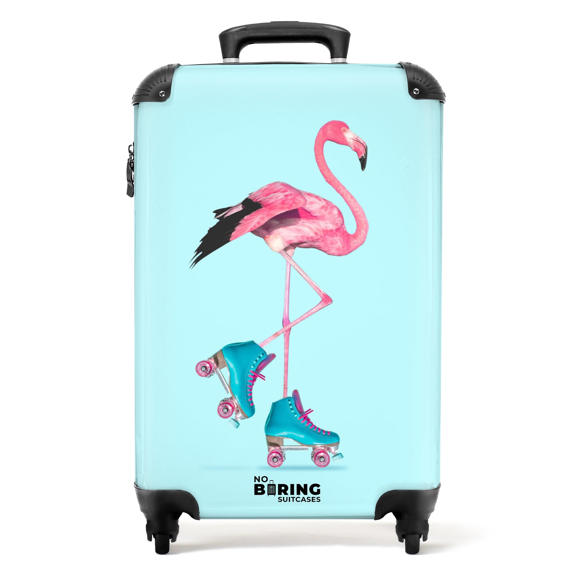 ["CARRY-ON LUGGAGE: With dimensions of 22x16x8 inches and a weight of 5.7 lbs, this flamingo cabin suitcase is light and perfect for traveling.","DURABLE SUITCASE: Our eco-friendly kids suitcases are known for their durability and easily replaceable insert. Protected behind a transparent front, the decoration representing the print of the travel suitcase is both well-protected and clearly visible.","STURDY MATERIAL: The elegant ABS surface with a polycarbonate coating gives the hardshell suitcase a great look.","UNIQUE SUITCASES: NoBoringSuitcases.com offers kids' suitcases and trolleys with different designs. We have suitcases for kids and adults.","SECURITY WITH TSA LOCK: The lightweight rolling duffel bag is equipped with an integrated TSA lock. This way, your luggage is protected and you can start your journey in peace."]