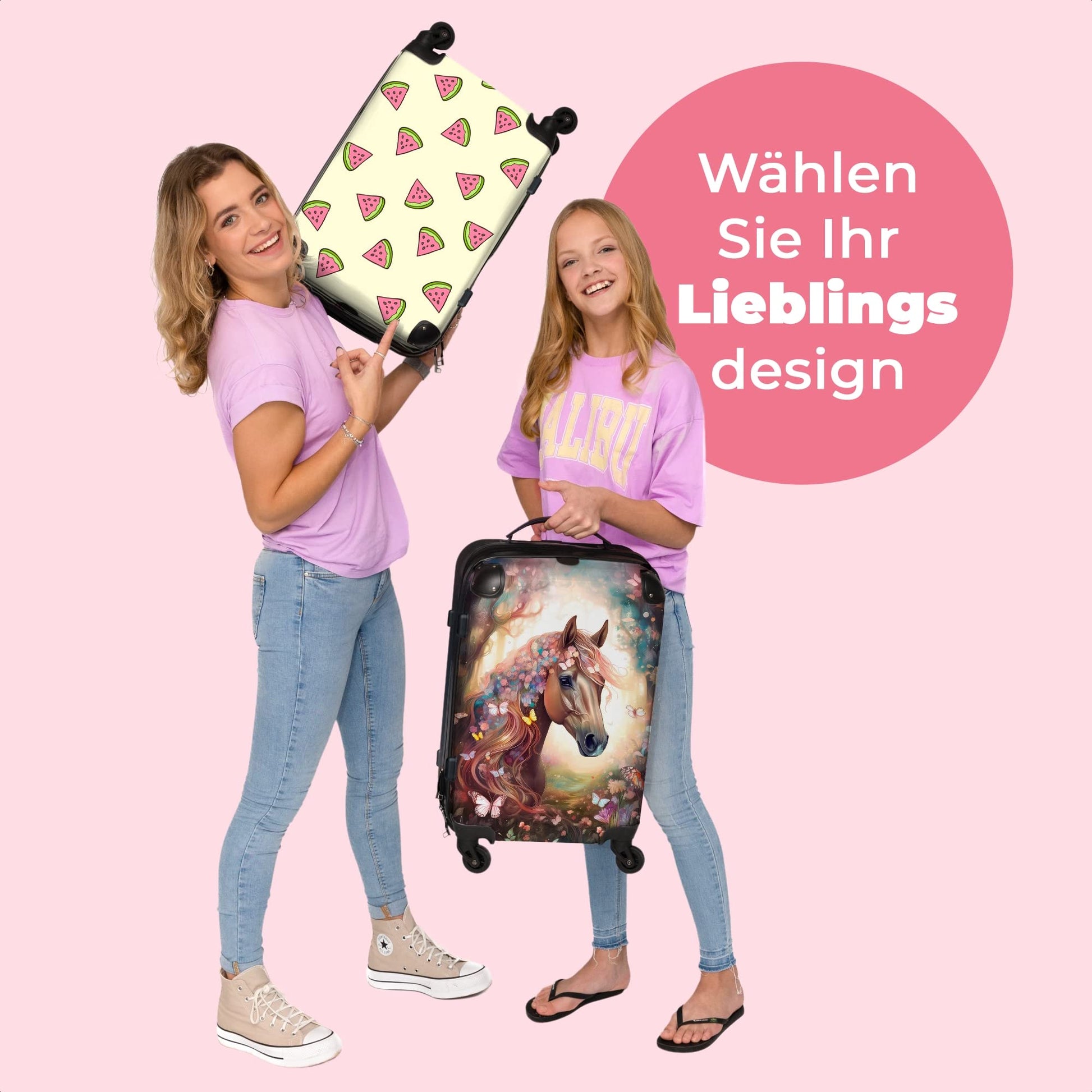 NoBoringSuitcases.com® Travel luggage for kids, suitcase for girls. Lightweight travel trolley with wheels. Horse - flowers - butterflies design. Medium-sized children's luggage, 67x43x25cm.