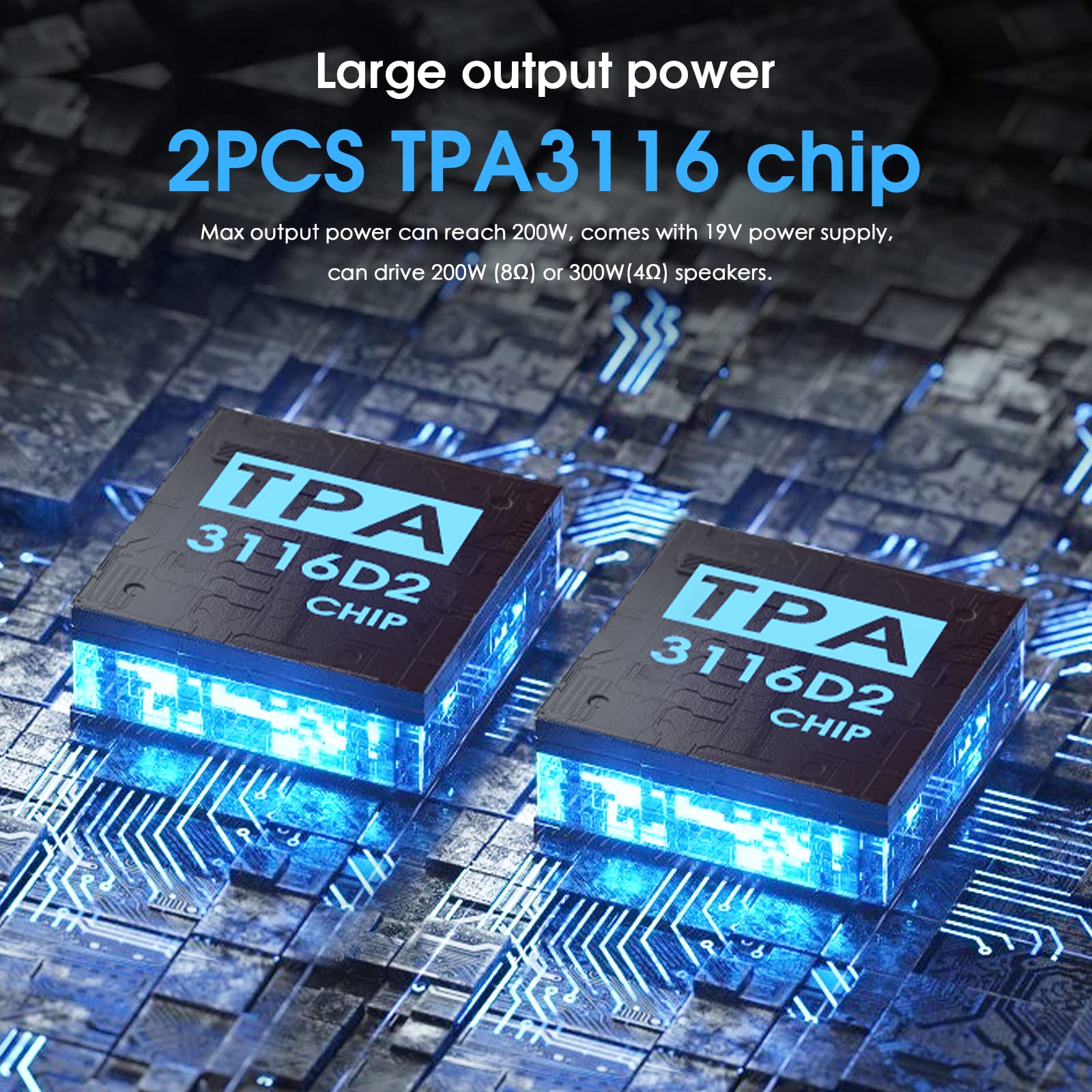 ["Tone control and HiFi sound: Fine-tune the sound with bass and treble controls, delivering music with thrilling highs and deep lows, including a bypass function for unaltered sound enjoyment.","Strong compatibility and powerful output: In addition to RCA, Bluetooth 5.0 supports a connection range of up to 50ft, stable and low latency. 2x TPA3116 chips, maximum output power of 200W, with a 19V power supply, drives speakers with 200W (8Ω) or 300W (4Ω).","Unique design in looks and technology: AUX/Bluetooth switch with red/blue indication; pure integrated aluminum housing and knob with multi-step fine processing, CNC precision cutting; curved, smooth edges emphasize the unitized housing; metallic DC output, no electrical sparks.","Compact size and easy to use, yet powerful and practical: With perfect protection circuit, ideal for desktop or smaller spaces at home or in the office, easy to connect to your audio system, specially designed for audiophiles pursuing HiFi sound.","Latest version released in 2023: Complete update in both appearance and sound quality."]