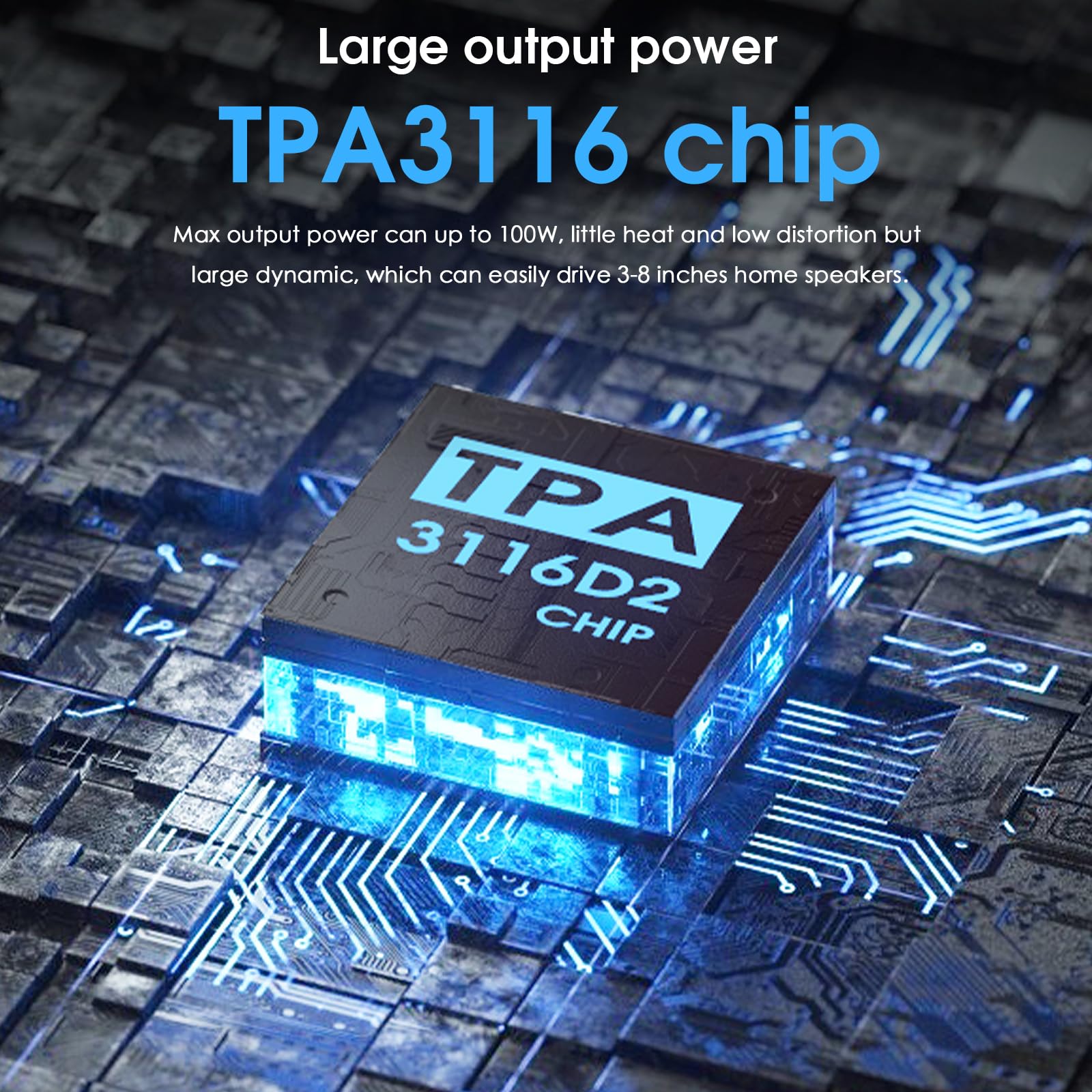 "Powerful chip: Equipped with a classic TPA3116 amplifier chip and 3x TL072 independent operational amplifiers, delivering 100W (50Wx2) for 3 ~ 6 inch 2.0CH speakers, with powerful and clean sound."