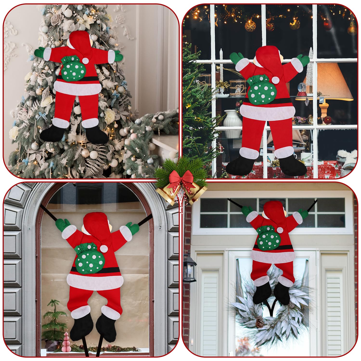 ["Package contents: You will receive 1 cracking Santa Claus decoration, with the size measuring approximately 138x110 cm. It is bigger and more vibrant. You can tie it to a tree, attach it to a wall. It looks quite realistic and eye-catching.","Premium material: The Santa Claus climbing the tree is made of non-woven fabric, which has good workmanship and strong seams. The green bag can wrap Christmas gifts, making it a perfect creative Christmas decoration design. Reusable product will serve you for a long time.","Easy to install: Our cracking Santa Claus decorations are soft and flexible. The hands and feet of Santa have rope and magic stickers, so you can adjust to any pose according to your own ideas.","Christmas decoration: The climbing hanging Santa Claus is an essential decoration prop for Christmas. This Santa decoration provides a strong Christmas atmosphere and is suitable for decoration in indoor and outdoor areas, creating a Christmas party atmosphere.","Nice gift: Large cracking Santa Claus in the tree is your best choice and will surprise people visiting your home. It is a perfect Christmas gift for your family members and friends."]