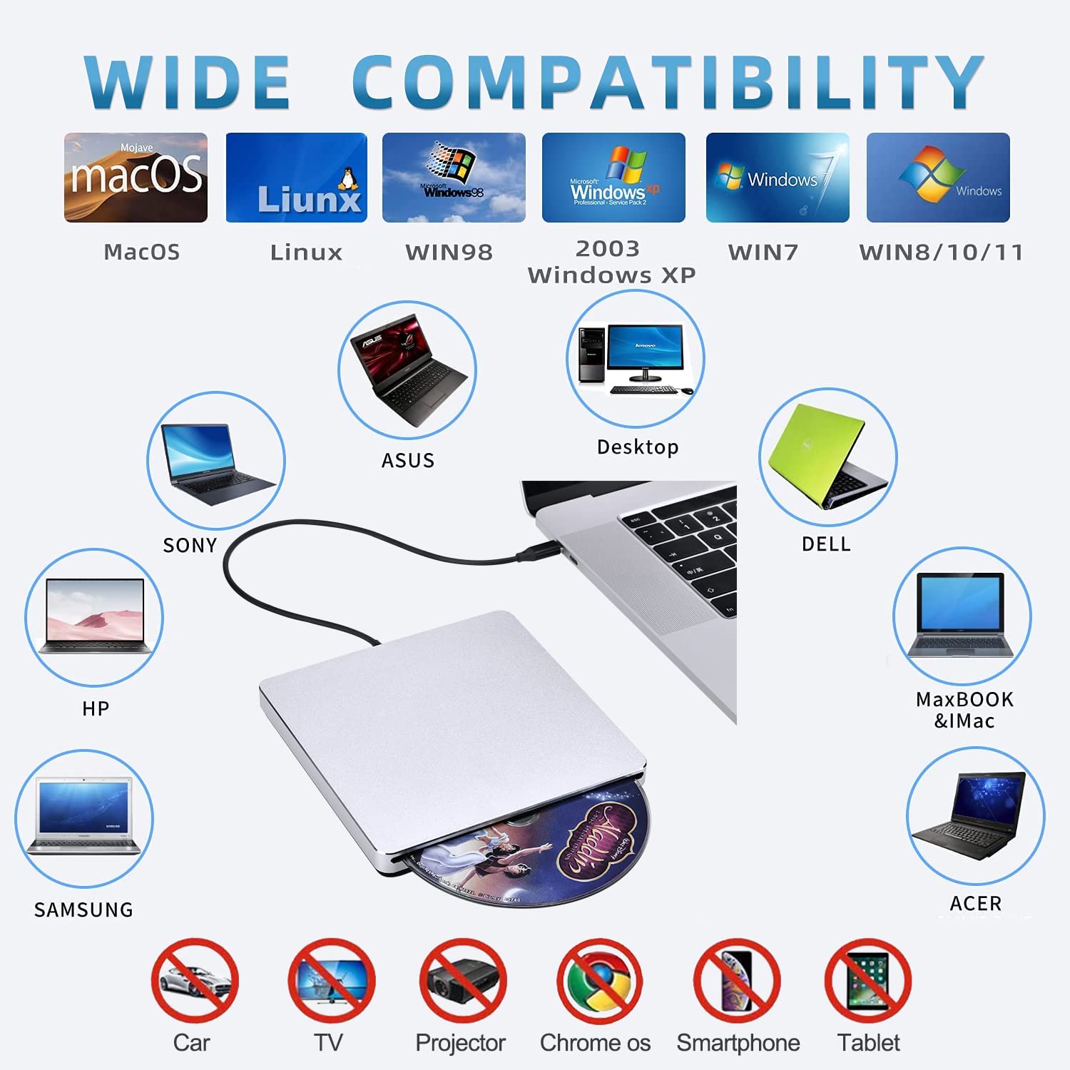 ["Wide Compatibility"] NOLYTH external CD DVD drive is compatible with Windows and all versions of Mac OS, Mac models from 2008 and newer that do not have a built-in external DVD drive. You can use this external DVD drive for laptops on almost all computers including MacBook Pro, MacBook Air, iMac, Mac Mini, Windows Laptop, and Desktop PCs (Note: Does not support Chromebook, TV, iPad, truck, and car).