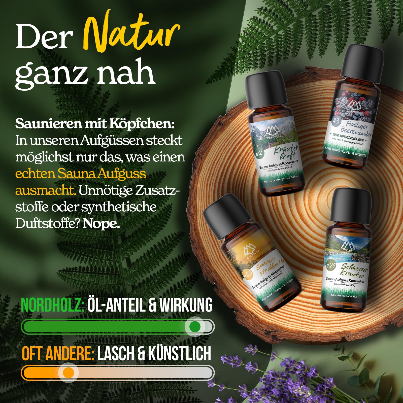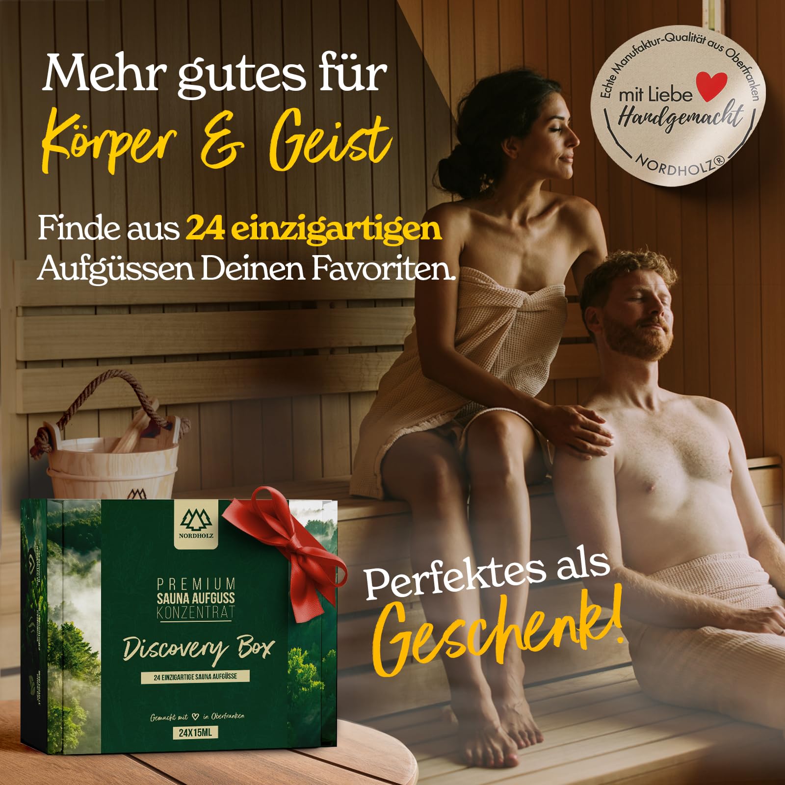 ["A SHORT GETAWAY FROM YOUR DAILY ROUTINE - The balanced variety of scents transforms your home into a true wellness oasis. Just what your body & mind need after a long day!","100% NATURAL FOR YOUR SAUNA - This set is free from artificial additives, gentle on mucous membranes, and makes a perfect gift with its elegant packaging for all sauna lovers!","HIGHLY ECONOMICAL - Thanks to the high concentration of organic essential oils, this set is extremely economical. Depending on intensity, it can last for up to 35 sauna sessions!","RELAXED, INVIGORATED, REFRESHED - NORDHOLZ's premium sauna infusion comes in 24 special & natural scent compositions. Let your soul unwind, find peace, and recharge.","100% HAPPY, OR MONEY BACK - Our infusions are developed, produced, and tested in Germany. Our promise: Either you're 100% happy or you get your money back."]