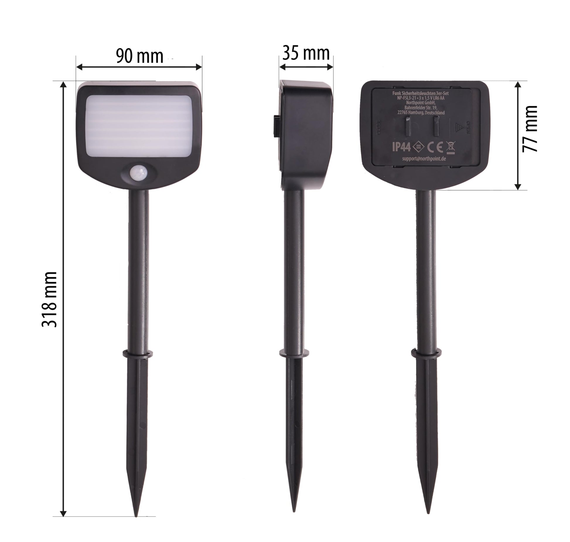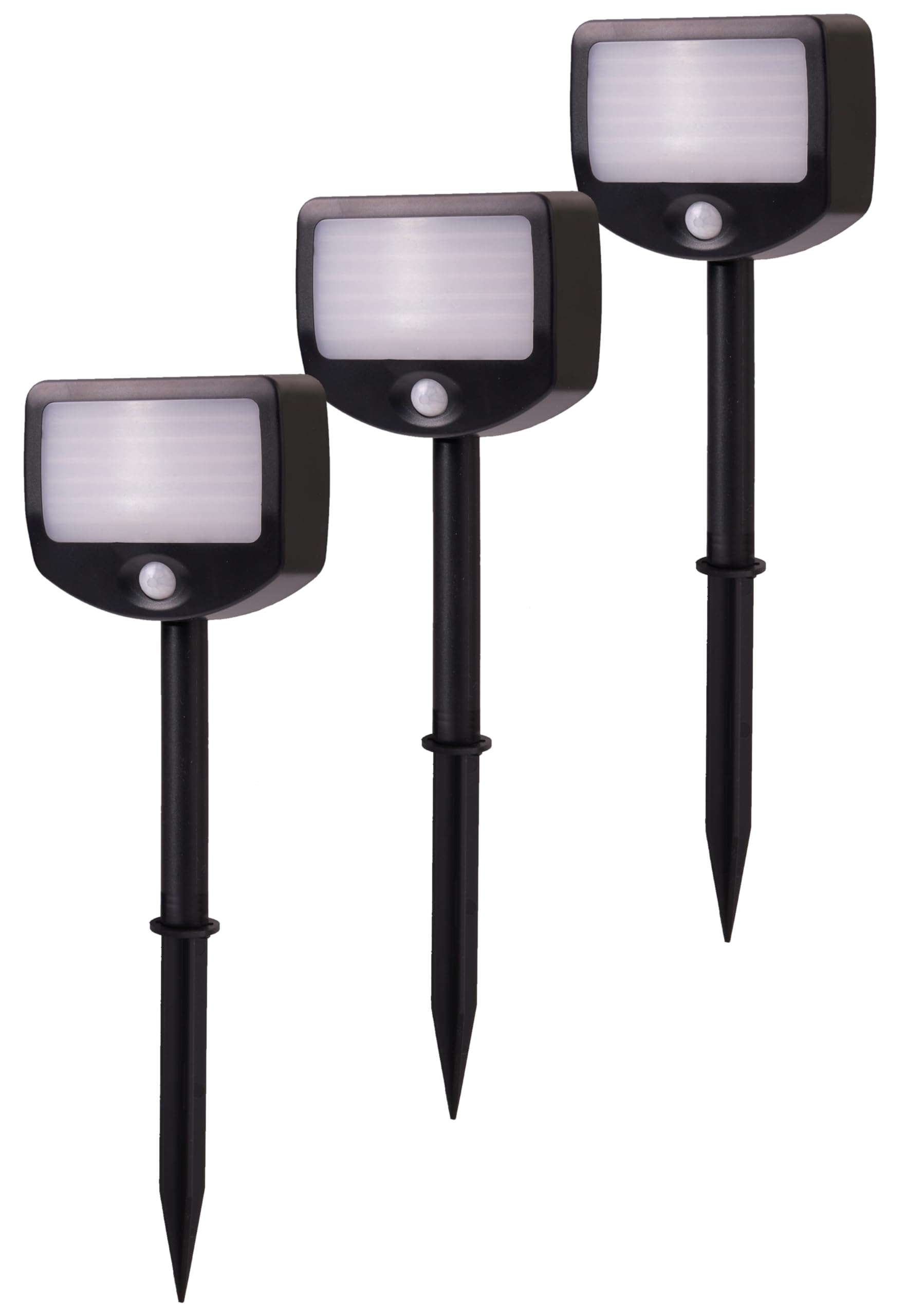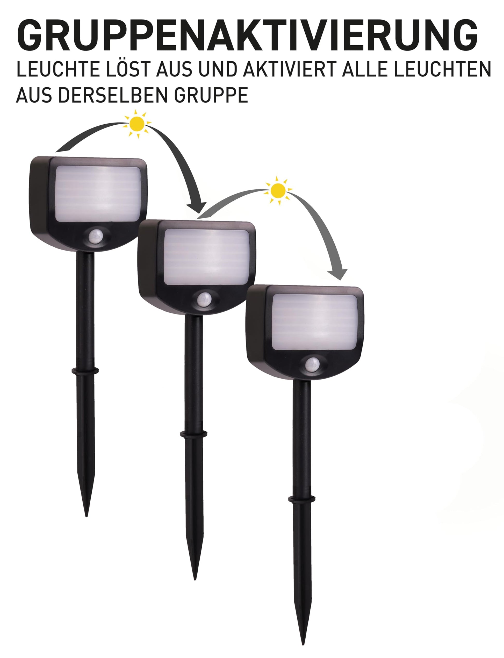 ["Motion sensor with integrated twilight sensor ensures activation only in darkness", "Interlinking - Integrated radio activation ensures activation of other lamps when one of the lamps detects motion", "Battery operated - Only 3x AA batteries per spotlight (not included) - ideal for use in and around the house - perfect for use in the garden, terrace or house", "Grouping - 3 different operating modes (AUTO, OFF, ON) and the option to assign the lamp to one of two groups", "Delivery - 3x radio security lights, 3x ground spikes, 3x mounting materials, German user manual"]