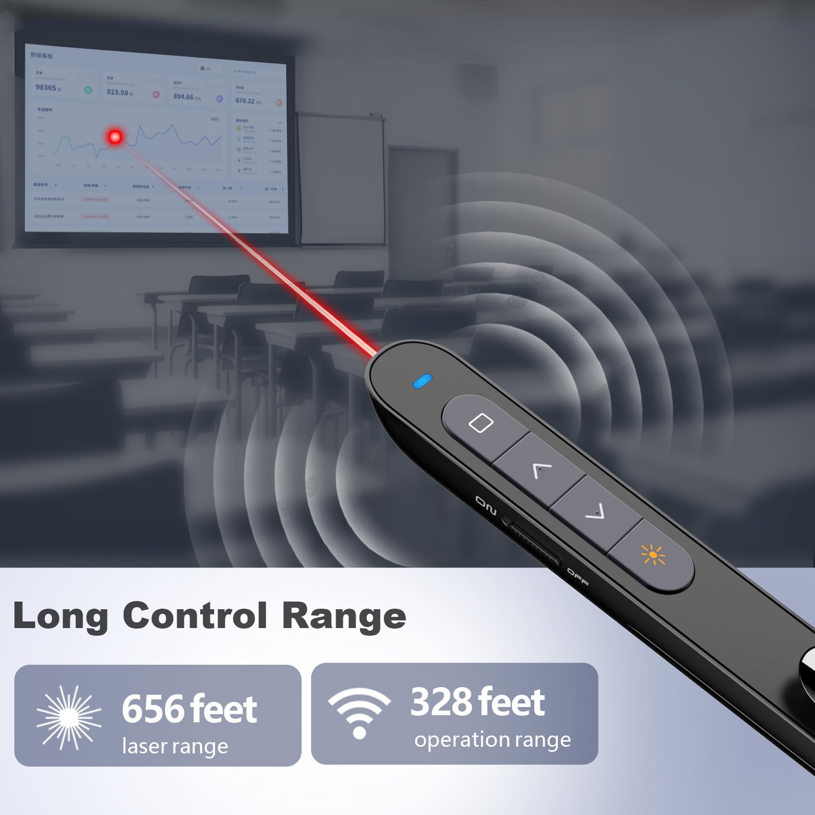 "Long Range and Durable Li-Ion Battery - With 360° omnidirectional control, you can freely move within a wireless range of 328 feet and are protected by advanced algorithms for data loss control. Built-in 360mAh Li-Ion battery, the rechargeable presentation clicker can be fully charged in 2~3 hours and function for weeks. Blue LED blinking slowly indicates that the presentation clicker needs to be charged.",
