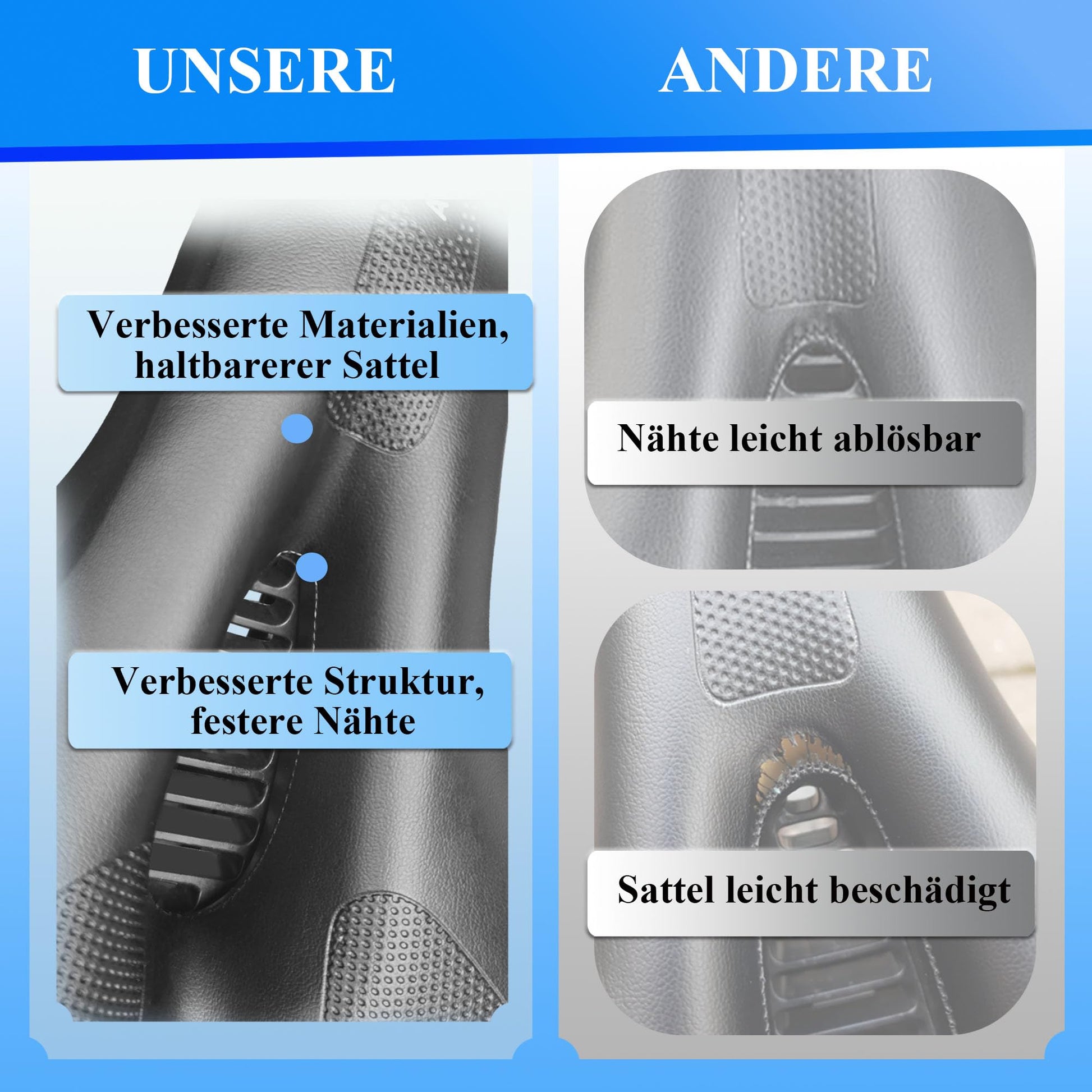 ["★ERGONOMIC & WITH MEMORY FOAM FOR IDEAL SIT BONE DISTANCE: Anatomically shaped memory foam with integrated air channels perfectly adapts to your sit bones. Reduces pressure points and pain during daily commuting. Ideal for cyclists with sensitive buttocks!","★NON-SLIP & WATERPROOF SURFACE: Special coating protects against rain and heat. Non-slip texture ensures maximum grip even during rapid curves. Perfect for urban commuting!","★SHOCK-ABSORBING SUSPENSION FOR BUMPY ROADS: Integrated shock absorber technology absorbs impacts on cobblestone streets and forest paths. Smooth ride even on long tours. Ideal for trekking and everyday use!","★BREATHABLE & VENTILATION SLOTS: Well-thought-out ventilation channels and breathable material prevent sweat stains. The seat stays dry even at 35°C. Perfect for summer commuters!","★UNIVERSAL ADAPTER & TOOL SET – 3-MINUTE ASSEMBLY: Includes universal adapter & tool set. Fits 99% of bike models. Assembly in 3 minutes without specialized knowledge. Save time for more important matters!"]
