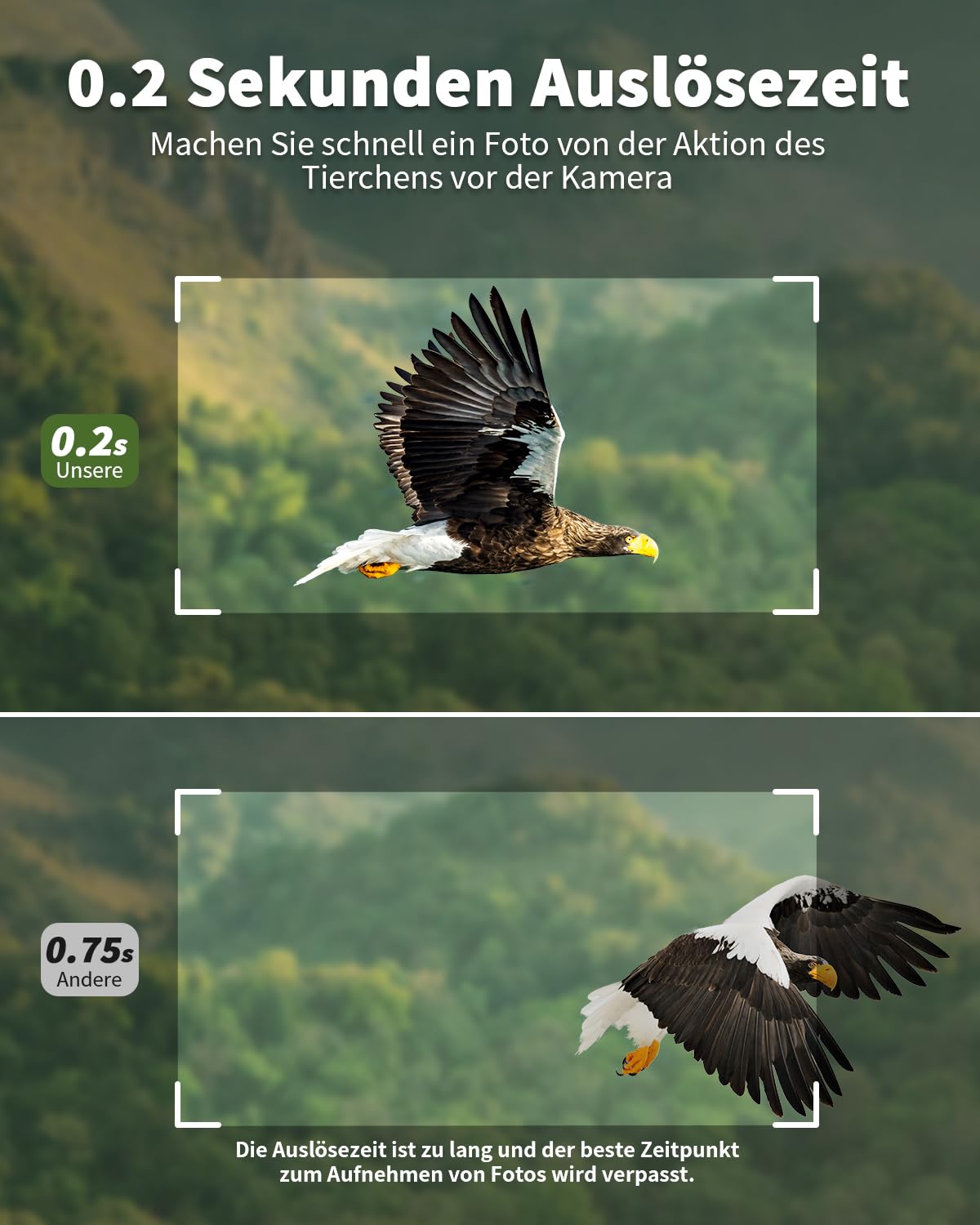 "0.2s Snapshot & Infrared Night Vision: With sensitive motion detection and a fast recording response time of 0.2 seconds, the trail camera captures small animals quickly and accurately, sending notifications to your phone. The 850nm LED night vision also ensures clear wildlife footage in low light conditions."