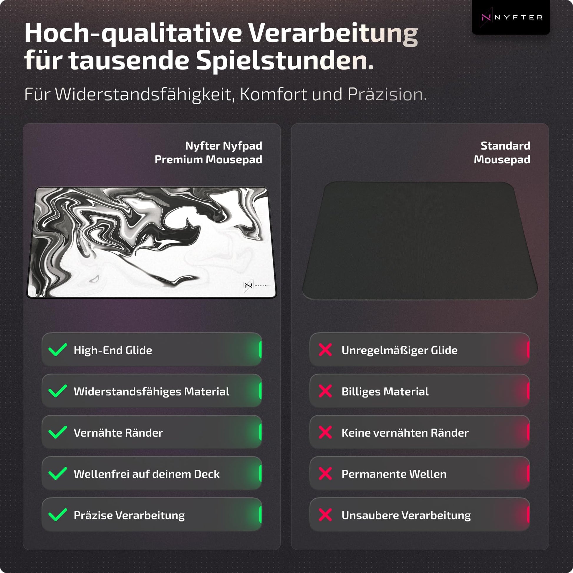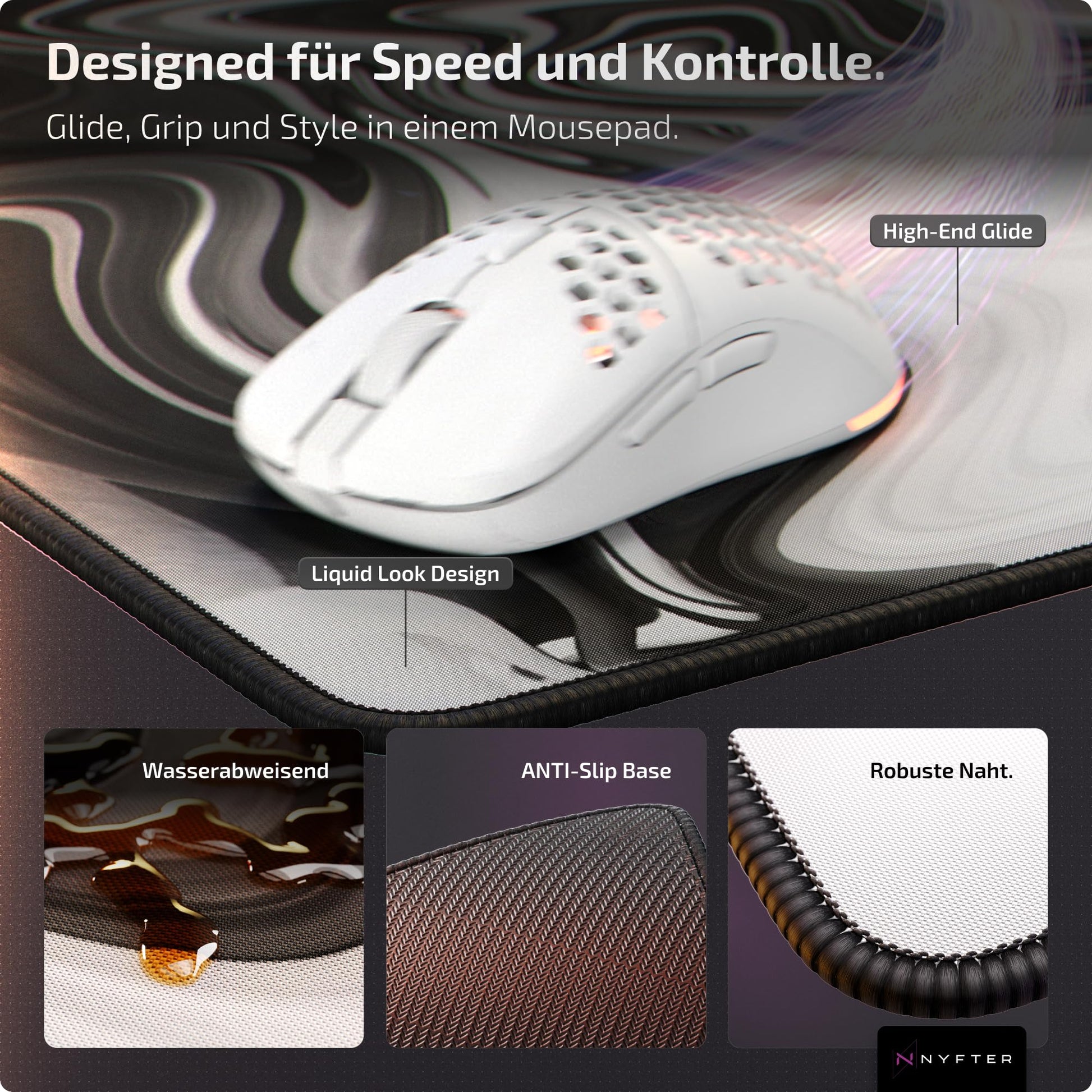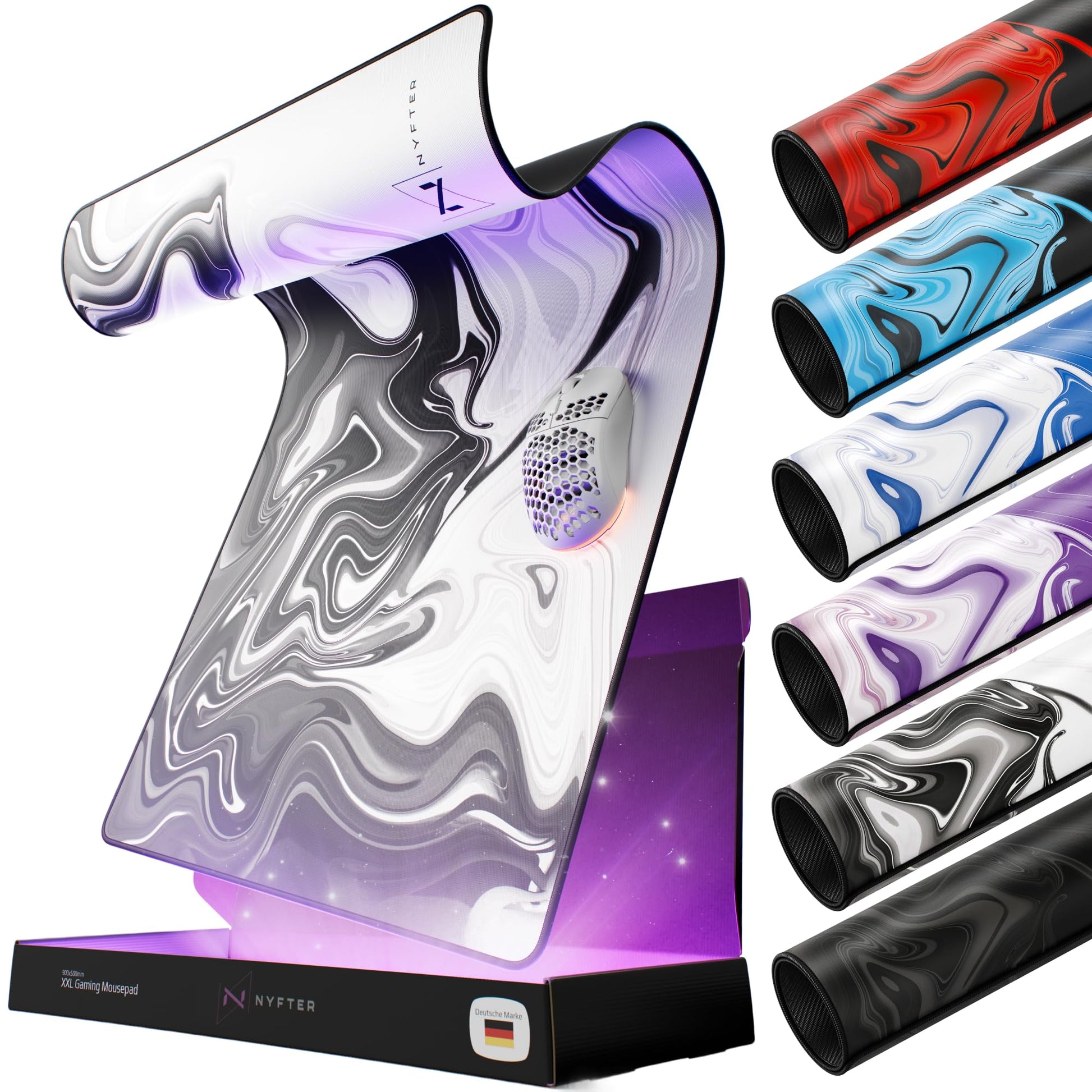 ["XXL GAMING MOUSEPAD - Designed for intense gaming with high-quality material. The focus on performance starts with the product packaging to prevent waves caused by rolled-up packaging. Smooth seams ensure seamless gaming on a durable mousepad. The water-resistant layer not only optimizes glide but also repels spilled drinks.", "E-SPORTS TESTED - For your perfect gaming experience - the right mousepad size. ''Developed with e-sports pros''. As a brand, we embody the gaming and esports lifestyle. Together with our community, we have successfully developed the perfect gaming gear.", "MISSION - We aim to enhance the gaming experience for all gamers. Our goal is to completely change the societal image of our sport, ''gaming''! Dive into the world of Nyfter now and discover exciting equipment.", "OUTSTANDING QUALITY - Achieved through exceptional quality, closeness to our community, and partnerships in esports. With your help, we create professional gaming equipment designed for pro esports. This year, we aim to reach even more gamers with our new products and convince them of the 'Nyfter' project.", "NYFTER SATISFACTION GUARANTEE - Nyfter's Nyfpads are among the best on the market. If you are ever dissatisfied, you will receive a full refund. No questions asked!"]