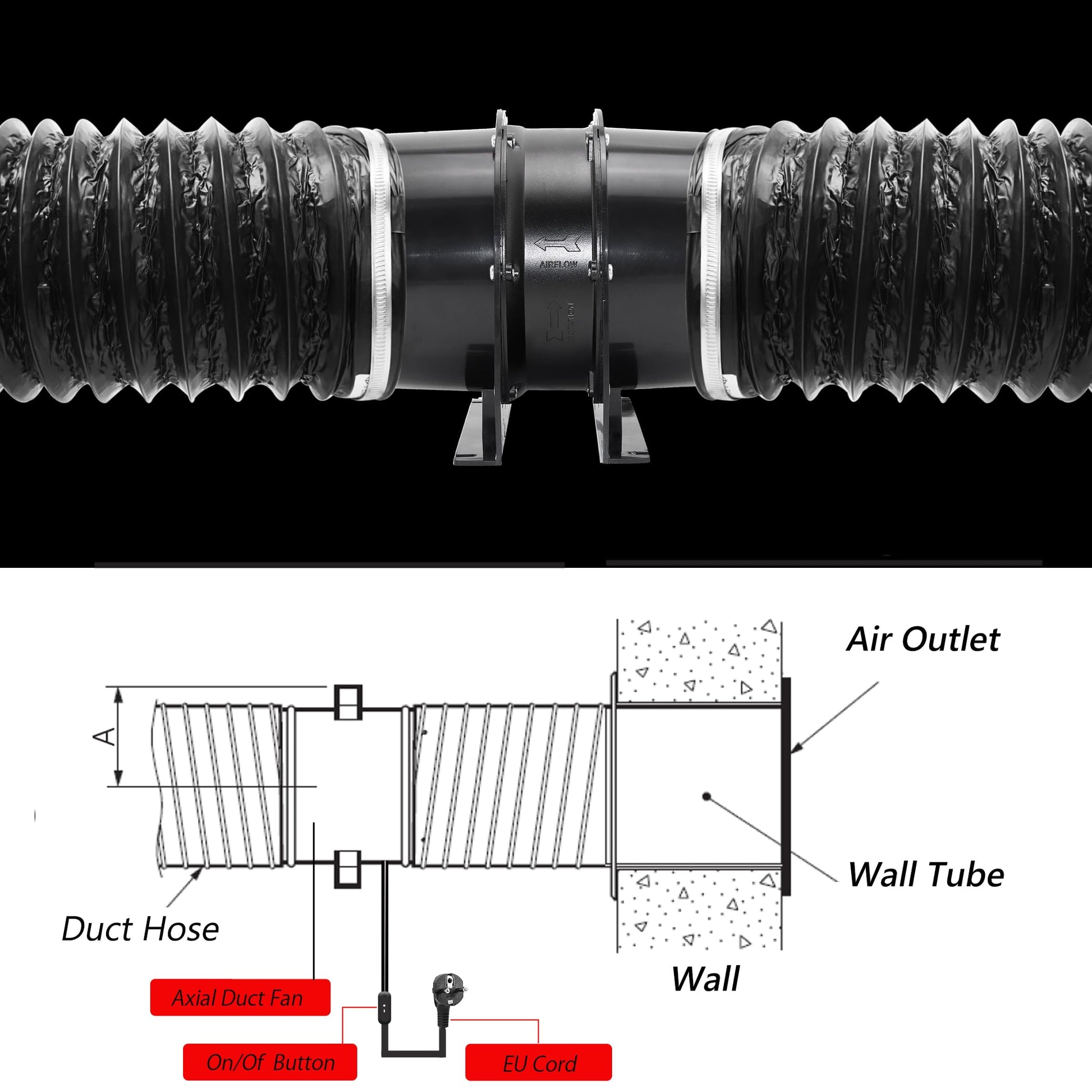 "WIDE APPLICATION: With the duct fan, you can mount the fan in HVAC ventilation systems, grow tents, greenhouses, laundries, etc. You can also use the fan in any condition of an industrial machine with AC; if needed, you can remove the two end pipes.",