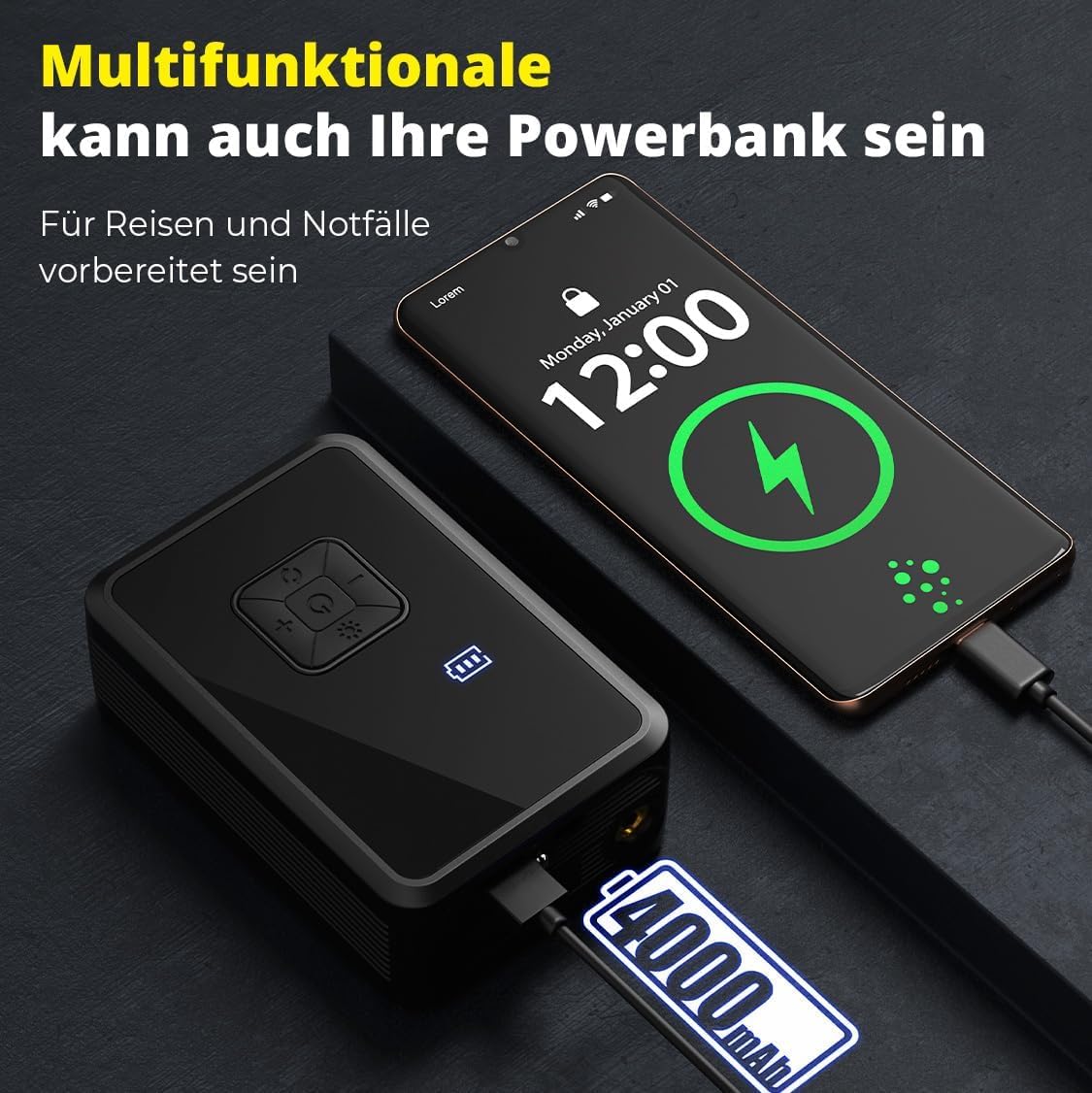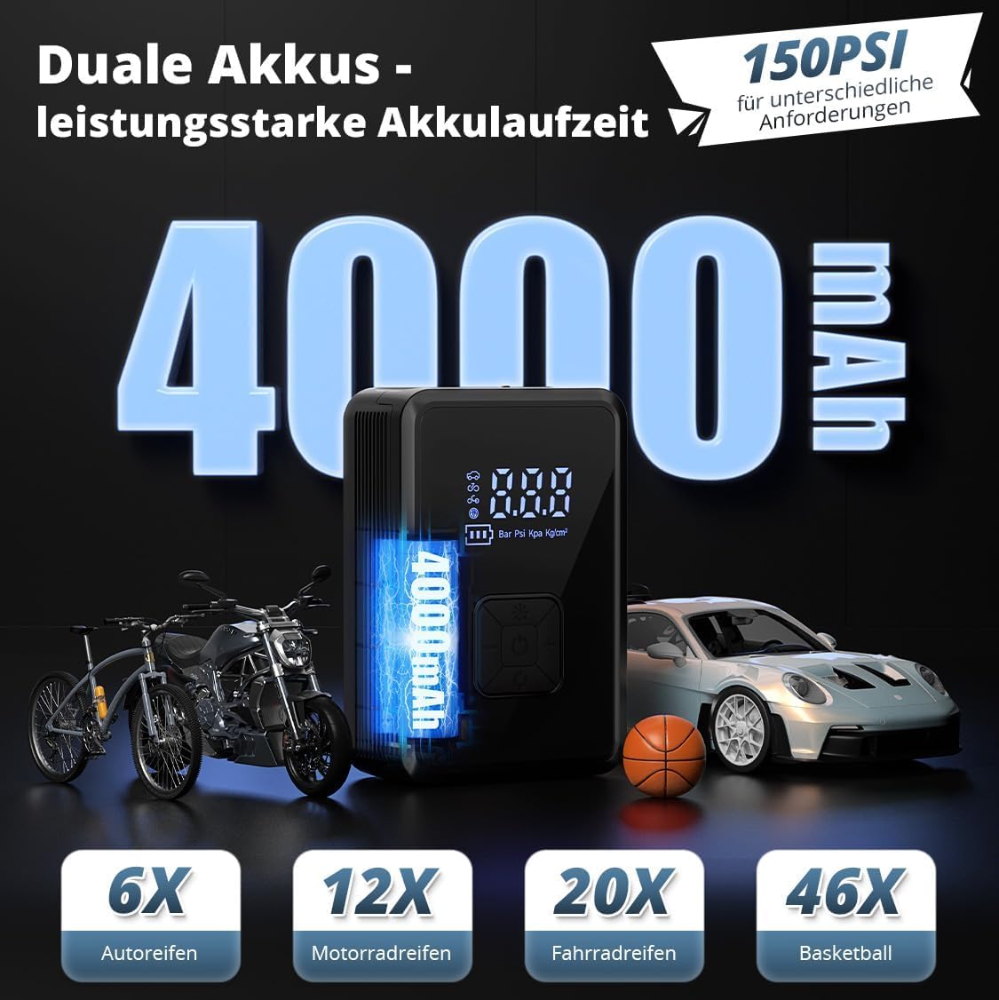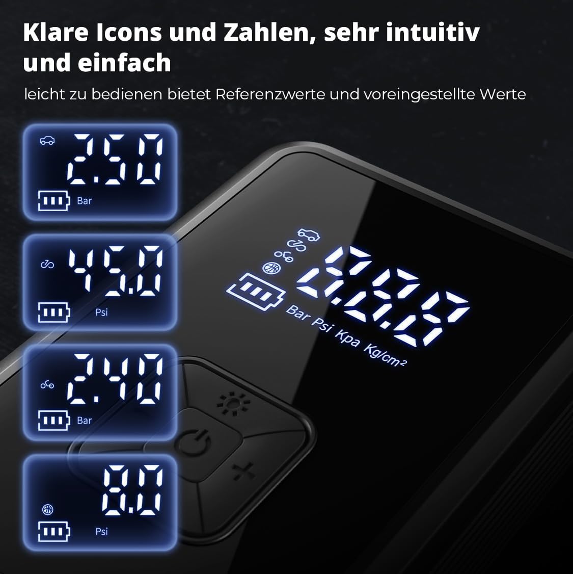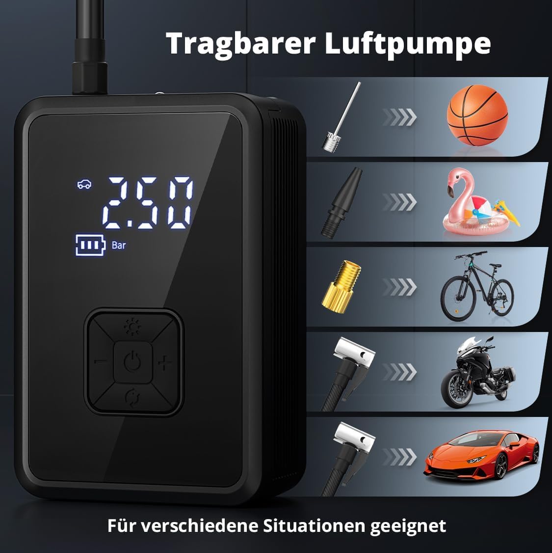 ["Fast inflation with 150PSI: Oasser electric air pump achieves up to 150PSI thanks to the 17mm precision cylinder and a long shaft motor of the 390 model. Fills a racing bike tire in just 86 seconds. Compact (12x8.5x4.5cm) and includes a practical storage bag","Battery air pump with preset pressure function, set the desired air pressure value or the budget mode, pump it up with a click and stop automatically when finished to save your effort and energy. The air pressure sensor is equipped with a digital chip that measures tire pressure with an accuracy of ±2PSI. The LCD display air pump clearly shows the tire pressure value, mode, and other information, so you know at a glance what it means","Small compressor with 4 preset pump modes, according to custom mode, auto, bicycle, and ball. Depending on the mode, the adjustable range is from 3 to 150PSI. Small compressor 7 minutes in a fully charged state can inflate a 0 bar 185/70R14 tire up to 30PSI. It is no problem to fill 10 tires in a row","Air pump The quick connect head allows for easy adaptation to the valve and comes with 4 types of valve nozzles to allow for inflation of compact cars, family SUVs, bicycles, balls, and other products. Not recommended for caravans, vans, trailers, buggies, etc.","Air compressor Built-in battery, Type-C interface compatibility is stronger. Thanks to the two-way channel function, it can not only inflate your tires but also serve as your charging treasure, when needed. Includes LED lighting function, so you can handle inflation in the dark with ease. Note: no adapter included"]