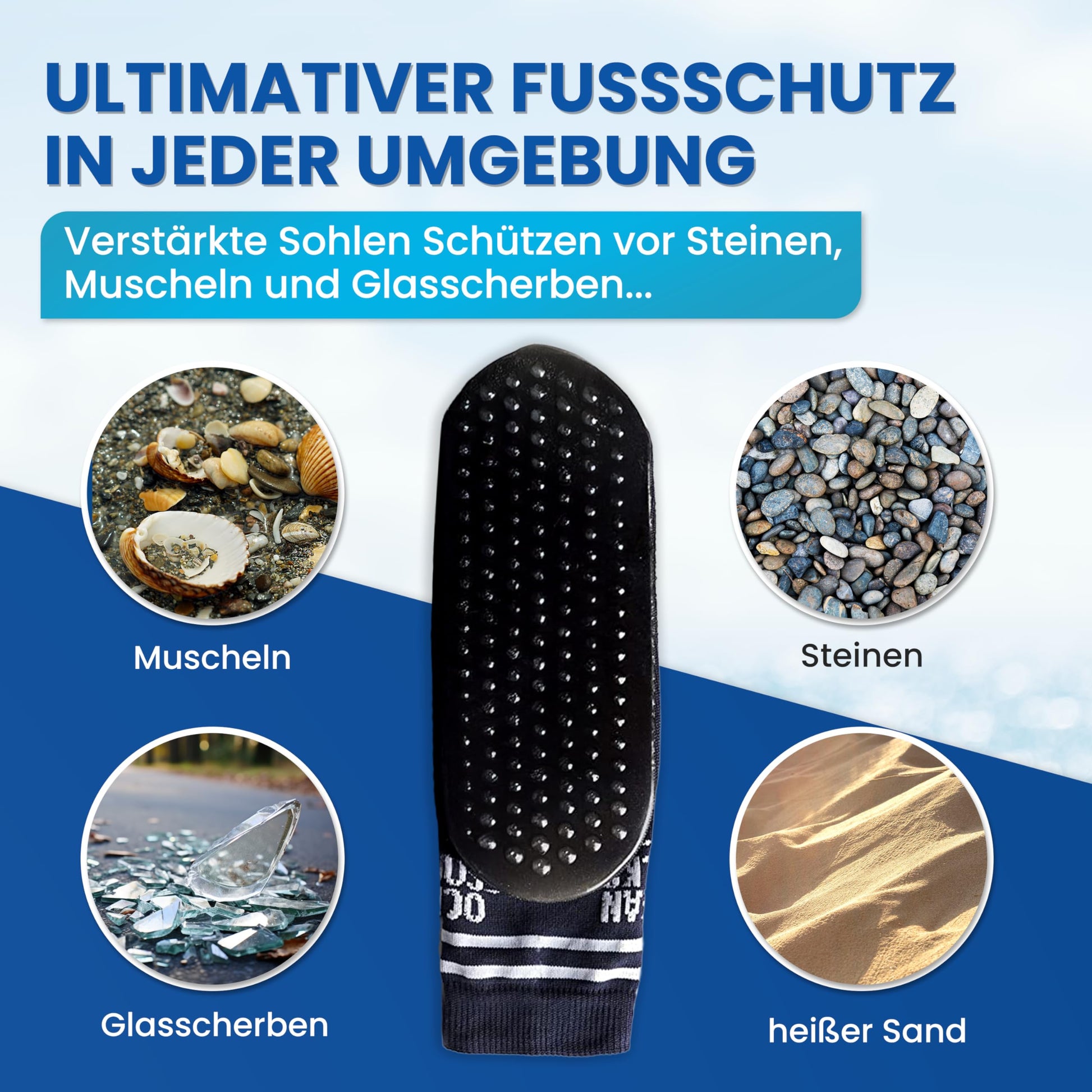 ["VERSATILE USE: Whether at the beach, swimming, on a SUP, in the mud, trampoline, or boat - the OceanSocks Aqua Socks are flexible companions for the whole family","RELIABLE PROTECTION: The reinforced, flexible sole protects against shells, stones, or glass shards - perfect for uneven terrain or hot sandy surfaces","BAREFOOT FEEL: Super lightweight, breathable, and snug - like a second skin! The socks fit sportily and comfortably, allowing full freedom of movement in water & on land","PRACTICAL ON THE GO: Whether as a slipper replacement, after-sports sock, or travel companion - OceanSocks are compact, easy to store, and ready for use at any time","EASY CARE & QUICK DRYING: Simply wash at 40°C, dry quickly in the air, and are ideal for regular use in any weather"]