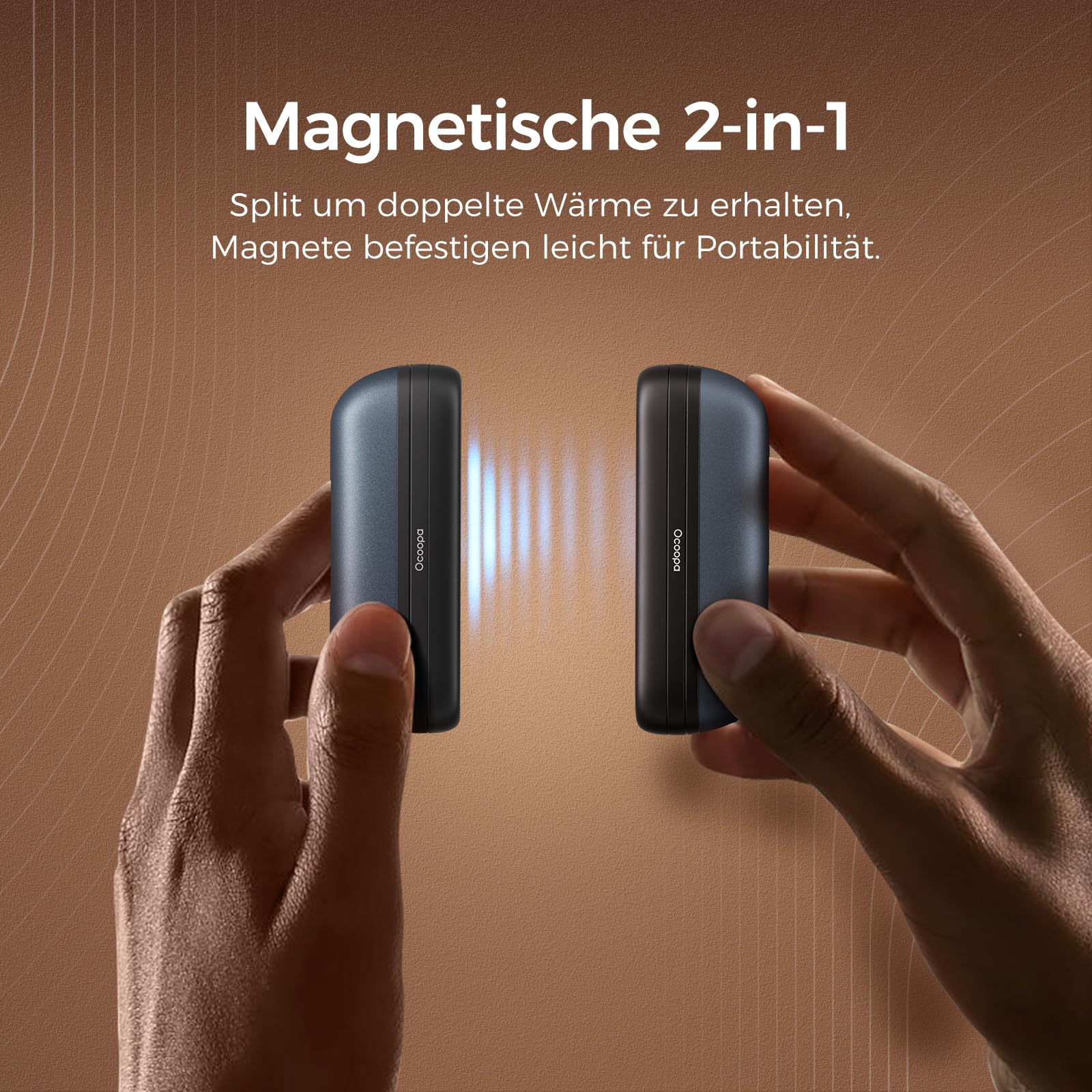 ["Last year, OCOOPA launched the UT2S hand warmer with magnet technology, which was praised by many tech enthusiasts. This year, we are introducing the UT2S Mini Pocket Hand Warmer to meet the needs of even more customers, continuing the magnet technology but in a smaller and lighter design, while maintaining the same heat performance. They are easy to hold in hand or carry in your pocket or gloves.","This electric hand warmer heats up instantly and OCOOPA has been specializing in rechargeable hand warmers for many years. All products undergo strict testing and certification to ensure user safety. High-quality housing, clean and straight seams, rounded edges. The surface of the hand warmer heats up to a cozy temperature, and the heat is evenly distributed throughout the warmer.","This magnetic hand warmer can be used as 1 unit or you can split it into 2 parts. You have the option of 3 temperature settings on the warmers, the highest setting is quite hot but won't burn your hand, and the lowest setting is just warm. The battery takes about 3.5 hours to recharge and depletes faster at the highest setting and slower at the lowest setting.","Intuitive button layout for easy operation, with a single click to turn on. Temperature settings can be navigated through consecutive clicks, as indicated by the red lights. A quick double click shows the battery level, indicated by blue lights. A USB-A cable that splits into 2 USB-C cables is convenient for charging. Silicone hand straps can be attached to your wrists.","Given their slim design, functional versatility, and cozy benefits, these hand warmers are a thoughtful and practical gift option for friends, wives, girlfriends, husbands, and children on cold winter days! The hand warmers are also suitable for walking, fishing, camping, hiking, hunting, and golfing. Raynaud's can relieve pain in the winter months by using hand warmers."]