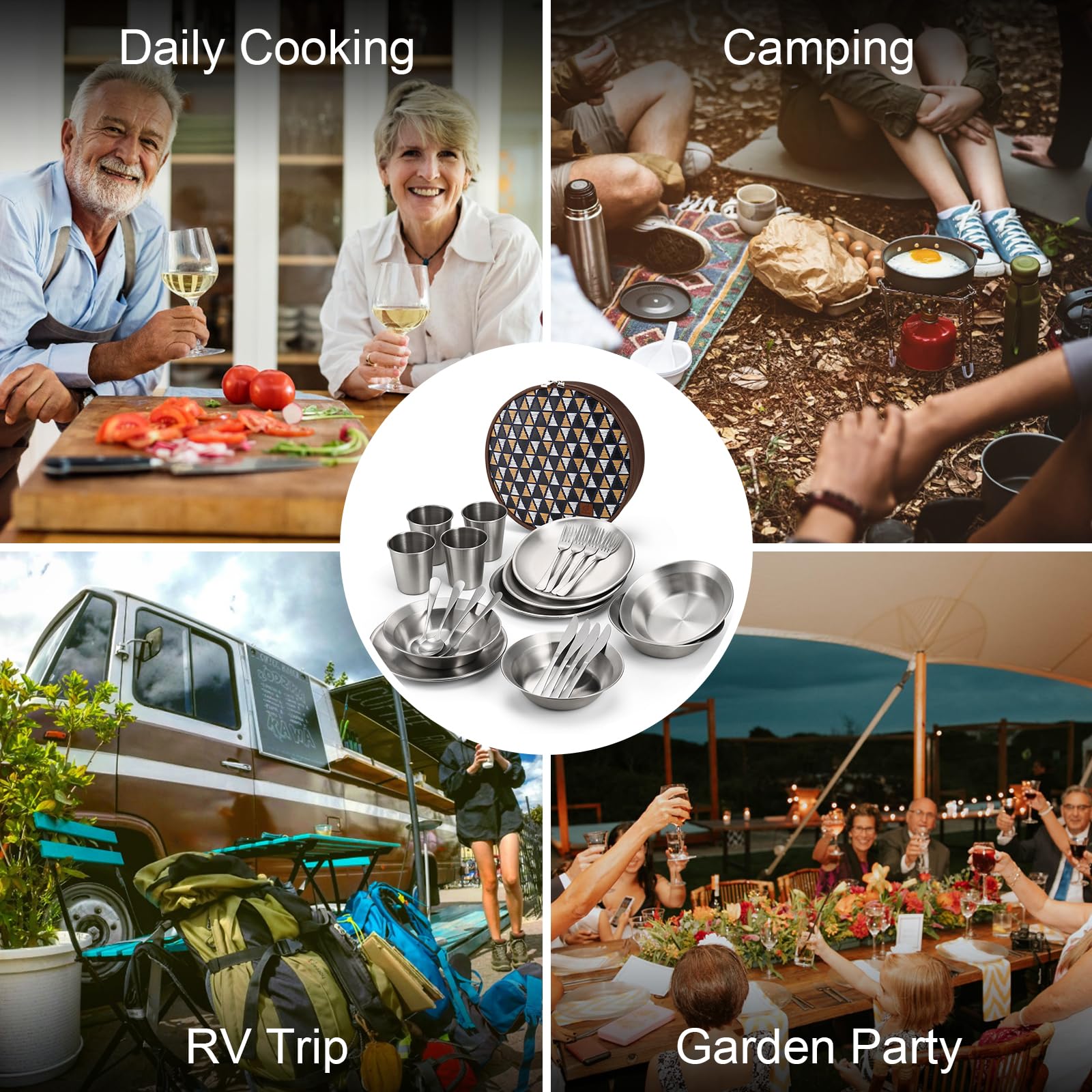 ["【A COMPLETE SET YOU NEED】This camping cutlery set includes 25 essential pieces. 4 x 8.3" plates, 4 x 7" bowls, 4 x 11.8 oz cups, 4 x utensils (4 x forks, 4 x spoons, 4 x knives) with cases, 1 x storage bag.","【DURABLE QUALITY and SAFE】Outdoor camping cutlery is made of high-quality stainless steel for long-lasting durability. Unlike plastic sets, it does not stain or absorb odors.","【EASY TO CLEAN AND DISHWASHER SAFE】The camping cutlery set is reusable and durable for daily use, allowing for quick and easy cleaning. It is also dishwasher safe for added convenience.","【TAKE IT ANYWHERE】Each cutlery set can be packed in the storage bag for easy storage. You can easily take it with you on long hikes, camping, picnics, beach parties, and more.","【GREAT FOR INDOOR AND OUTDOOR USE】Camping cutlery is ideal for family camping, recreational vehicles, and home use."]