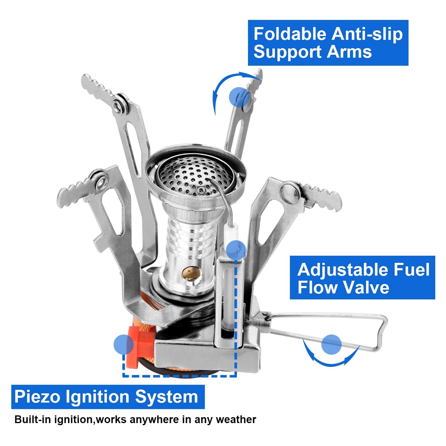 "✅【WIDE COMPATIBLE】: The stove is compatible with all Butane/Butane-Propane mixed fuel canisters with 7/16 thread (EN 417). Equipped with piezo ignition system and flame regulator, making it more convenient and practical. If you are missing accessories, please contact us."]