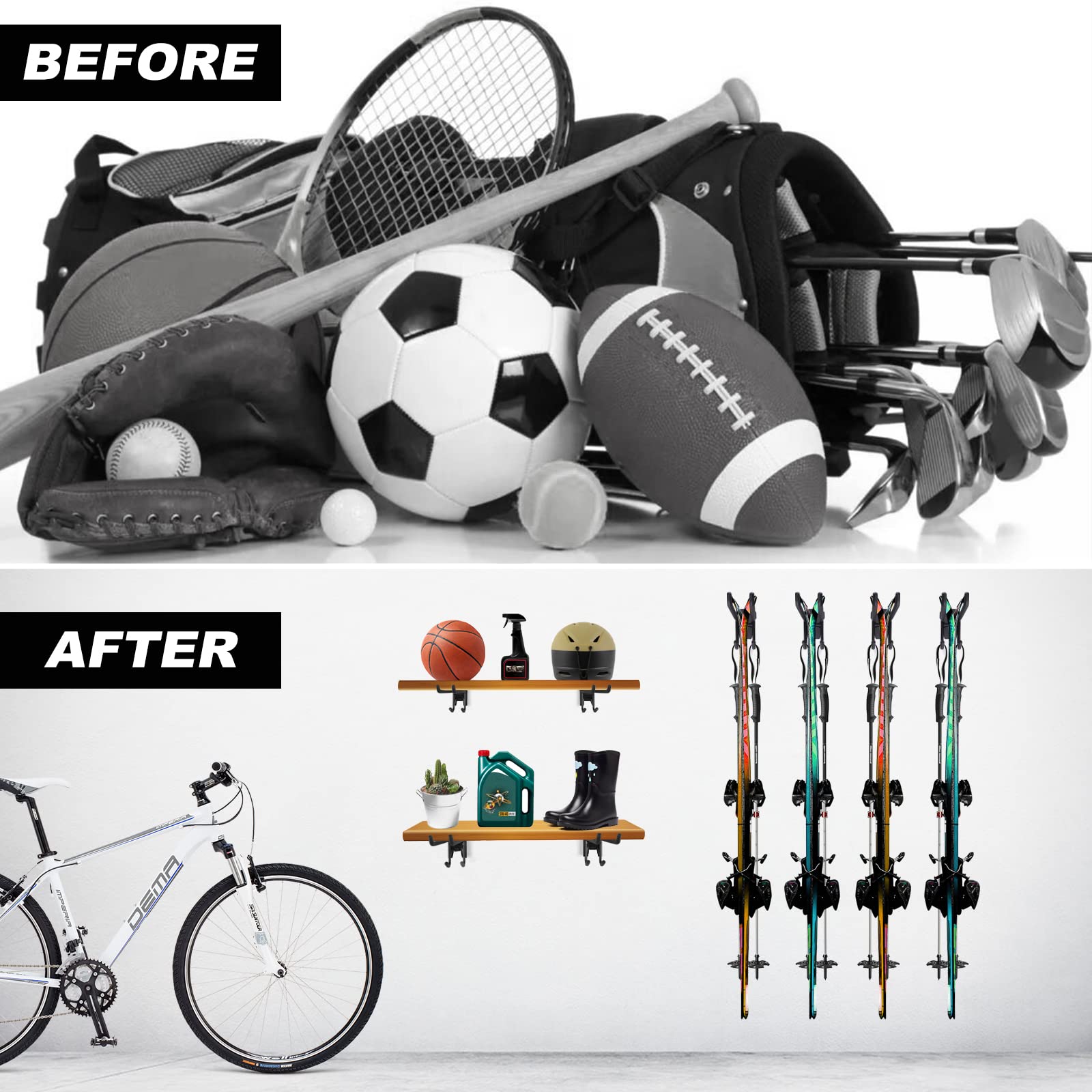 "INCLUDED: - 4 Slatwall wall shelves and 4 ski strap holders. With 2-inch wide, adjustable, and durable nylon straps for skis and poles, you can free up your hands. This durable and high-quality ski & pole bag is equipped with high-quality stitching and strong nylon to last multiple seasons."]