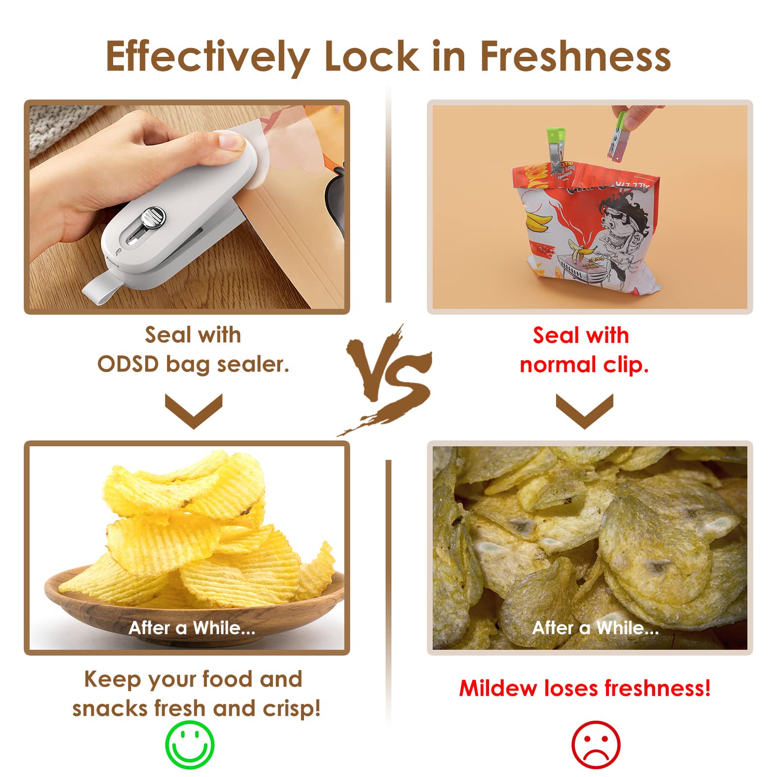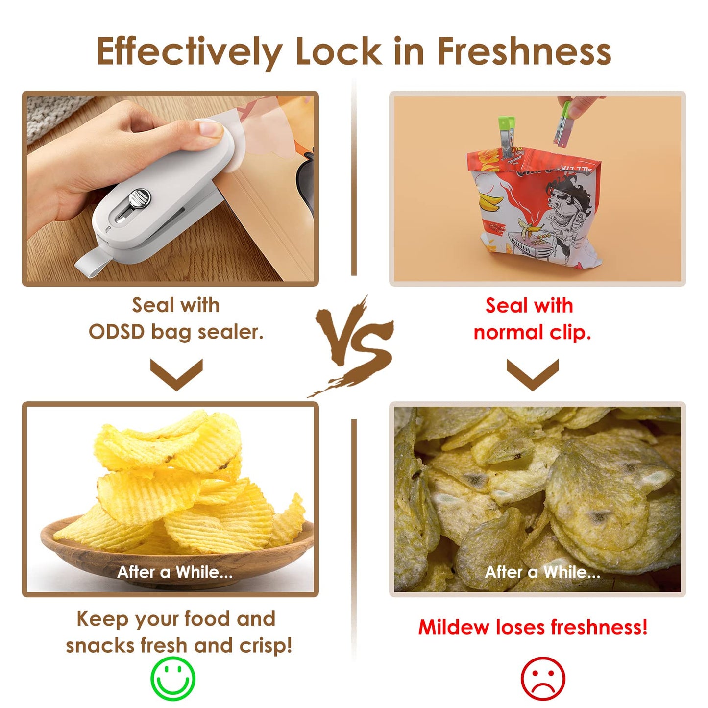 "【Keeps Food Fresh】 ODSD Mini Bag Sealer ensures a good seal, keeping the contents airtight and preventing them from going stale. Keep your food crispy and fresh with this heat sealer that seals your snacks with heat. Would definitely recommend expanding your kitchen appliances.",