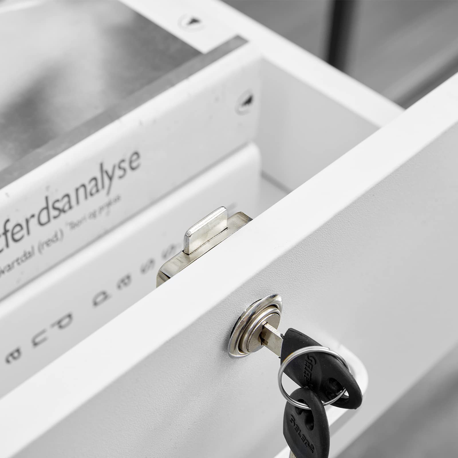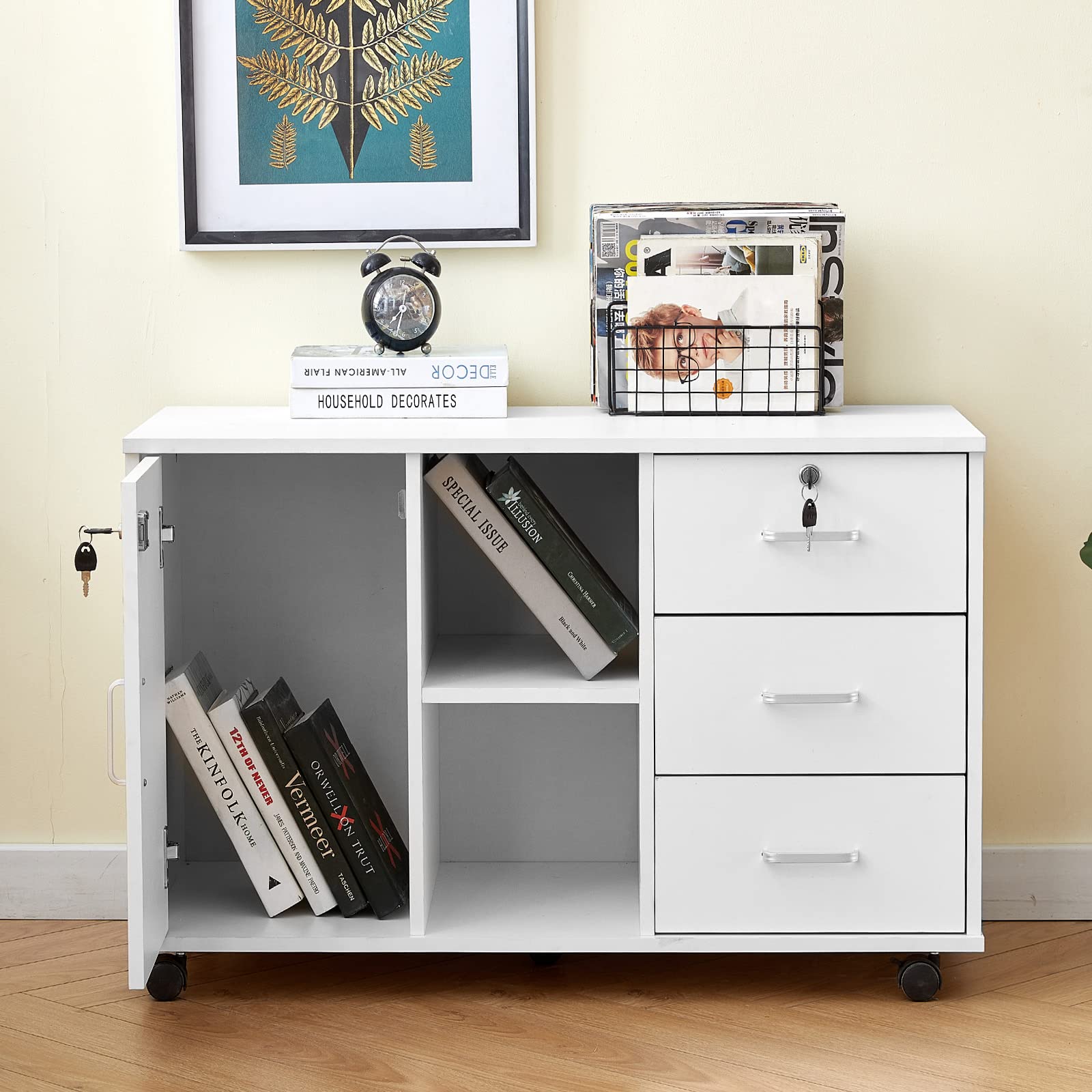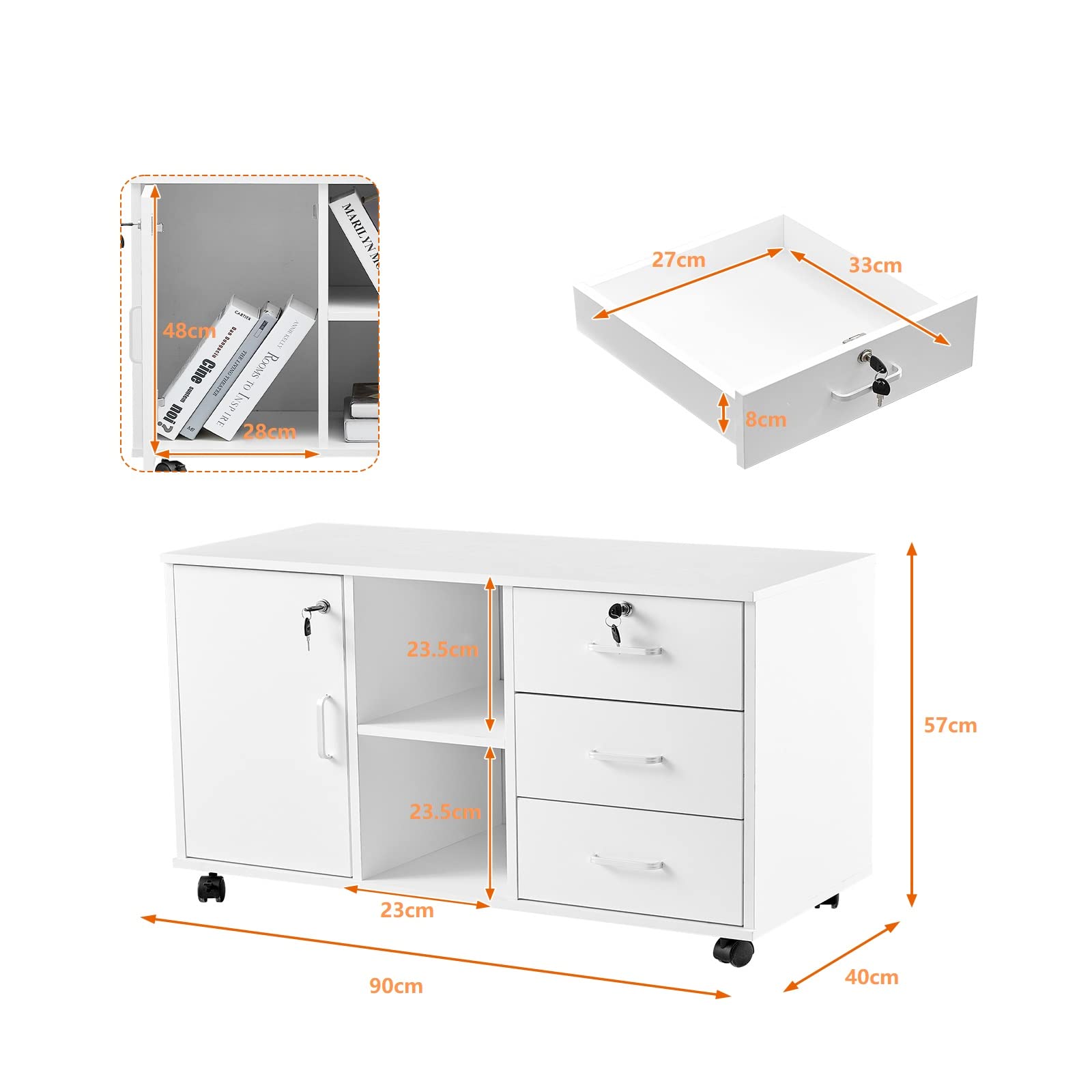 OFCASA Mobile File Cabinet with 3 drawers, lockable office rolling cabinet with wheels, 1 door, 2 shelves, 2 locks, white wood, storage cabinet for Home Office, 90 x 40 x 55 cm