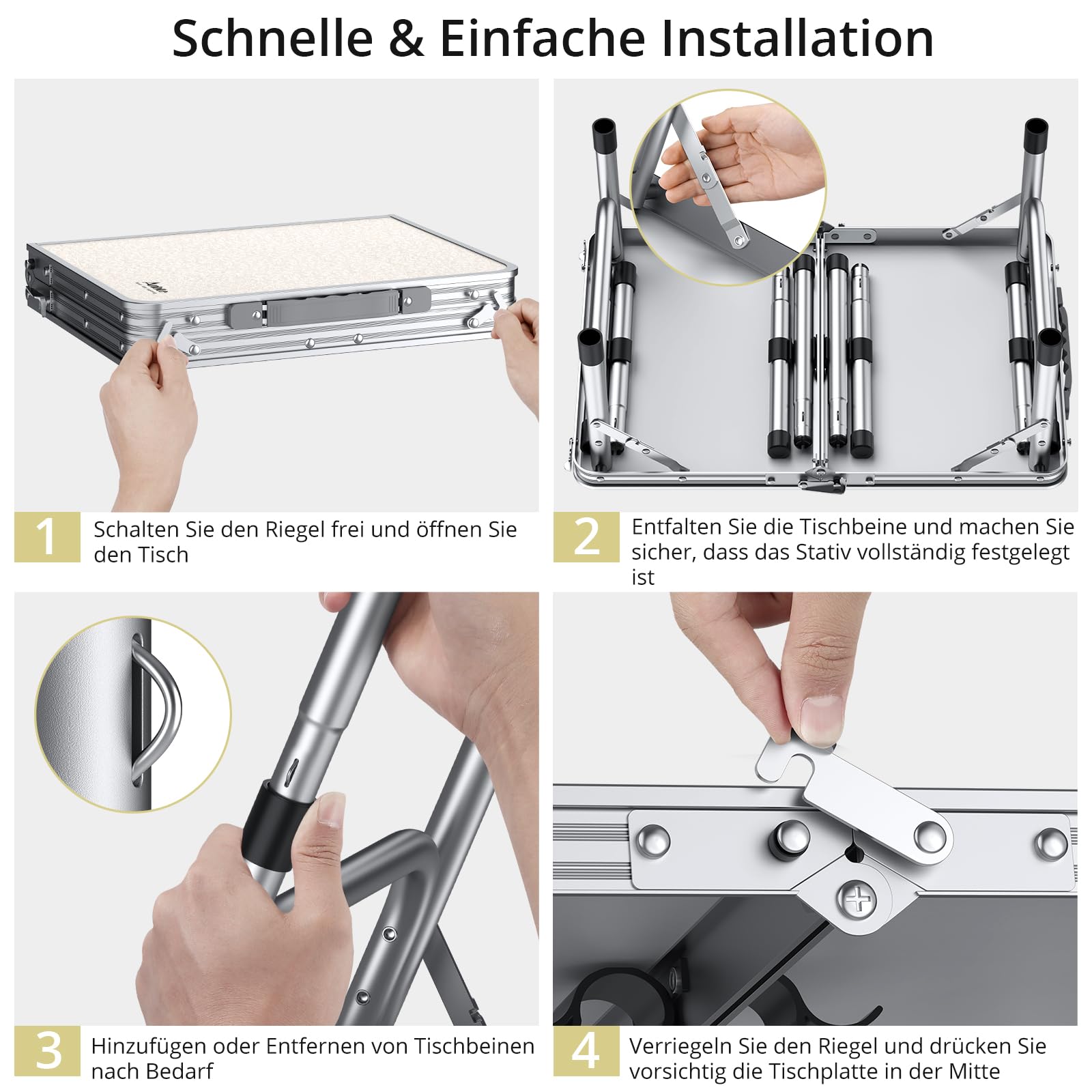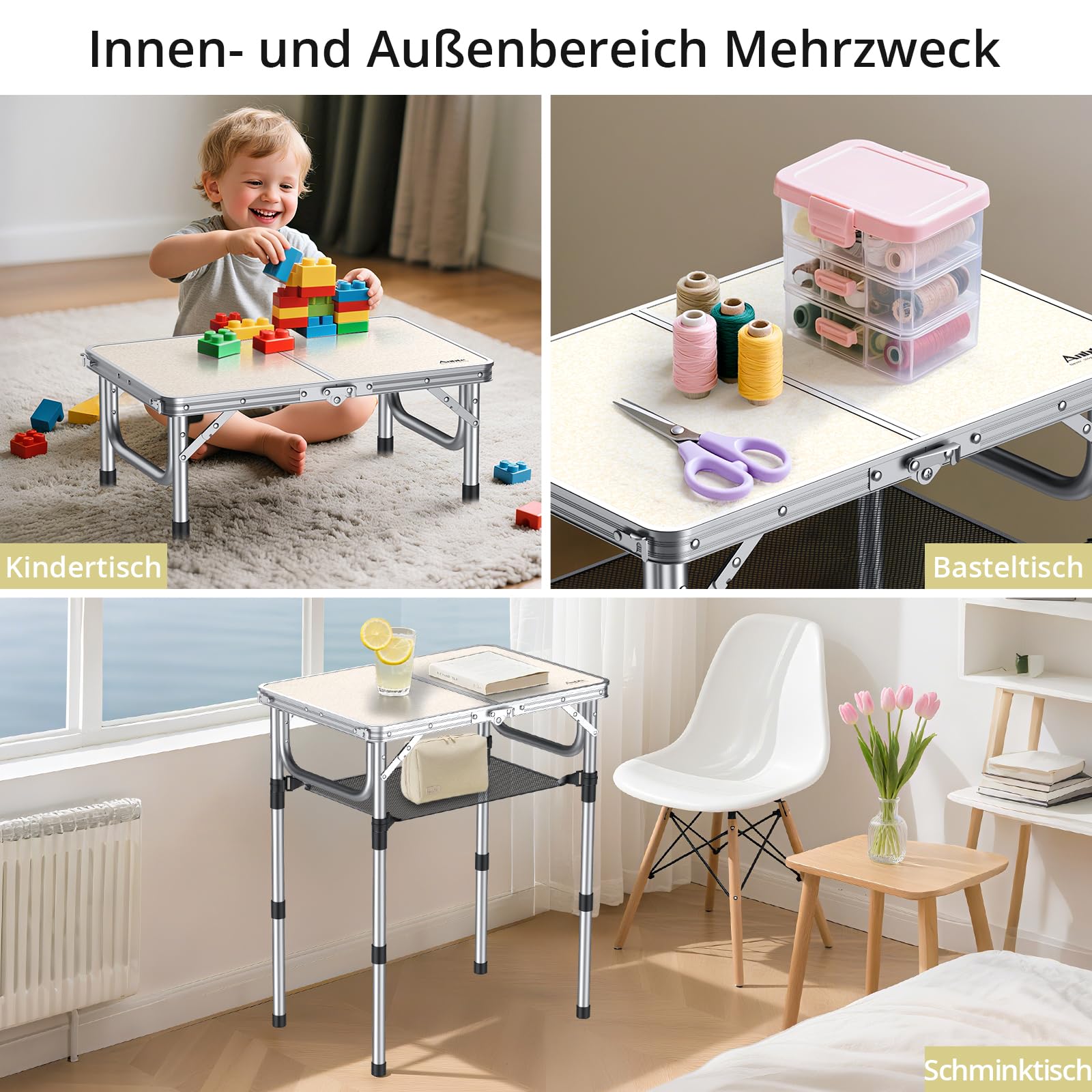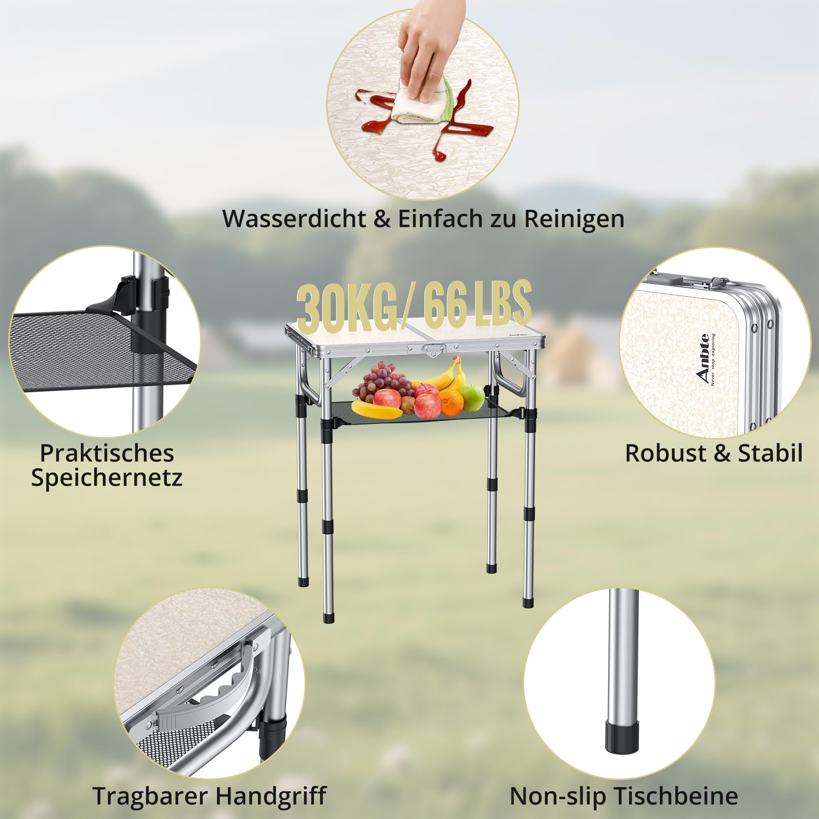 ["【3 HEIGHTS WITH ADJUSTABLE LEGS】 This camping table has 3 height-adjustable table legs of 10.2 inches, 18.9 inches, and 27.6 inches. You can sit on the grass at the lowest height during a picnic. Or sit next to the table with a chair when the table is set to the highest height.","【QUALITY MATERIAL FOR SAFETY STABILITY】 The entire frame of the picnic table is made of a thicker aluminum alloy, which is very solid and durable. The MDF (Medium Density Fiberboard) tabletop is smooth and easy to clean. Perfect for outdoor and indoor use. Can be used as a party table, garden table, picnic table, card table, etc.","【EASY TO CLEAN & HASSLE-FREE ASSEMBLY/ DISASSEMBLY】 Wipe with a damp paper towel to easily remove water stains and spots from the tabletop after use. Folds into a package in 16.1x11.8 inches within 1 minute and 5.1 pounds total weight, ideal for storage and transport.","【PRACTICAL STORAGE NET FOR ADDITIONAL SPACE】 A unique, spacious storage net can be mounted under the tabletop to provide more space and accommodate more items for you. This is useful to keep light and small items off the ground.","【TIPS FOR USE】 ① Please do NOT place hot objects on the table or near the fire. ② The dimensions of our camping tables are all measured by hand, please allow for an error of approximately 0.4-0.8 inches. Thank you for your understanding!"]