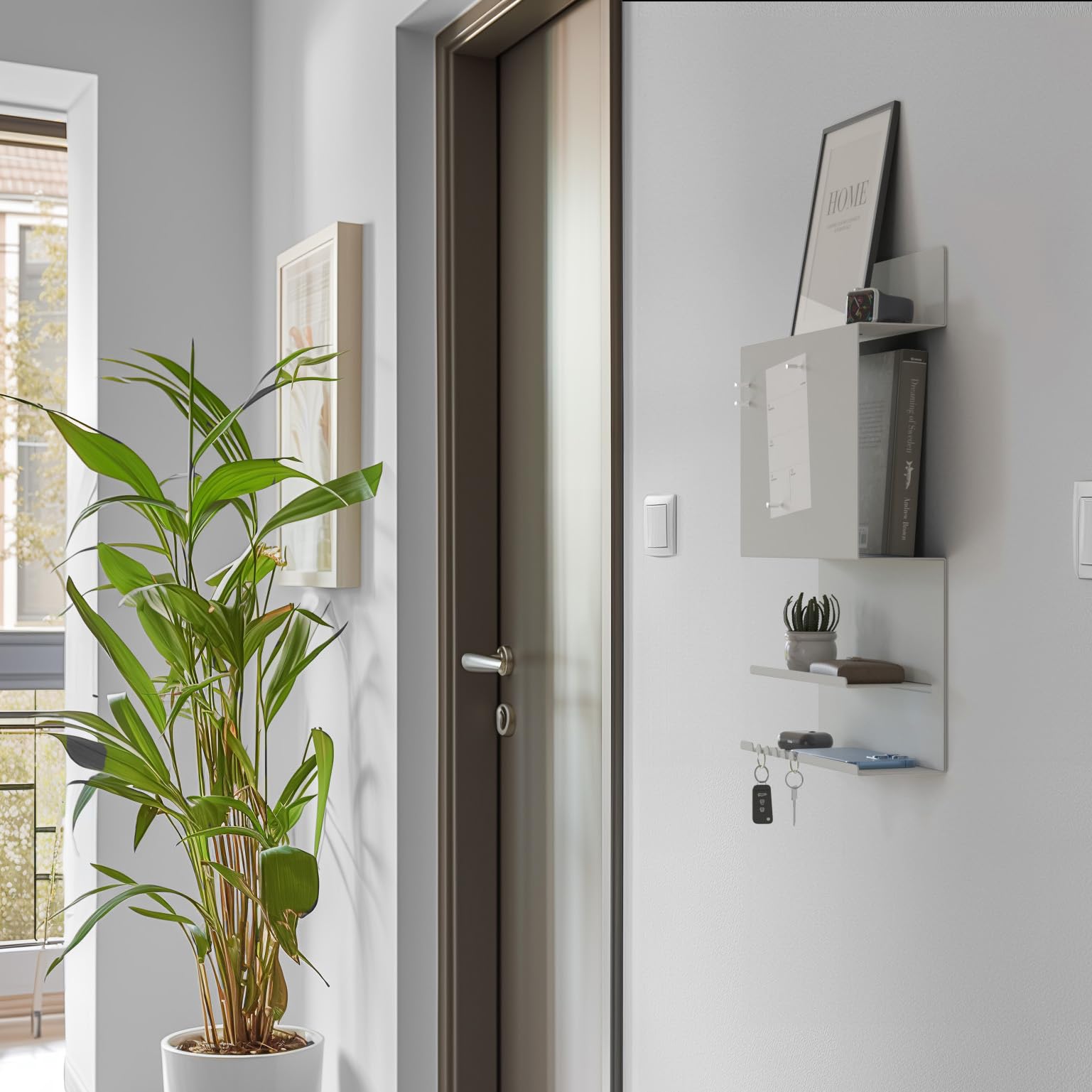 "Ideal for all spaces: Optimal storage and display for your keys, important notes, photos, magazines, your smartphone, or wallet. An organizer is perfect for the hallway, corridor, or kitchen. Various shelves to choose from: Choose between different shelf shapes to perfectly design the shelf space. You can mount the shelves individually or side by side to maximize the existing wall space. Durable quality: The wall shelf is made of sturdy 1.5mm thick steel sheet. The shelf is powder-coated, making its surface scratch-resistant, durable, and easy to clean at the same time. Versatile wall shelf: Each wall shelf has the same dimensions (30 x 9 x 49 cm), but is differently designed and has various compartments and hooks. Easy installation: The mounting kit includes suitable screws and dowels, covers with magnets, and an installation template. The included assembly instructions guide you easily through the individual installation steps."