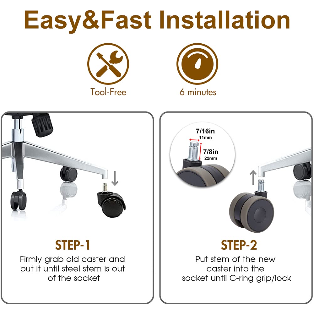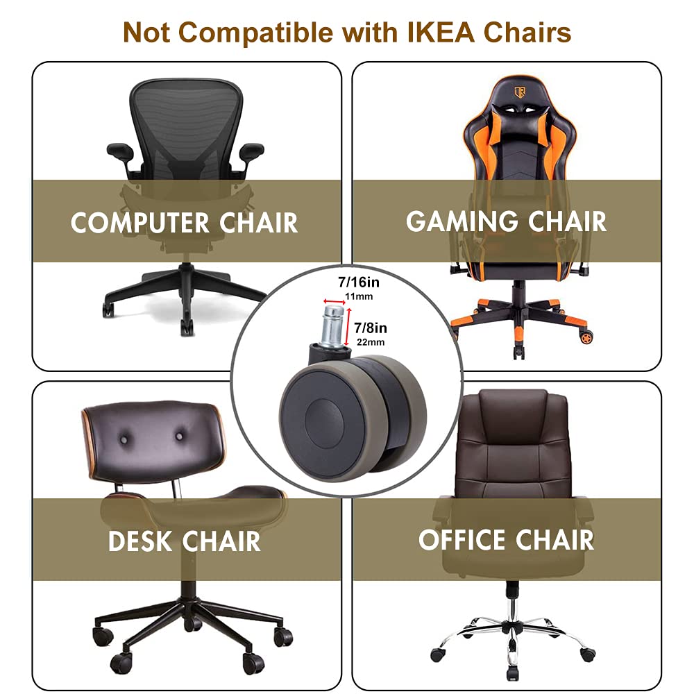 ["FOR ALL WHEELCHAIRS WITH 11MM PINS: Suitable for any office chair supporting 11mm wheels (Note: IKEA uses 10mm wheels, as do many Topstar office chairs, so please measure before purchasing)","360º SWIVEL BALL BEARING: Swivel design for easy movement. All furniture casters have a good load capacity. 5 casters with a load capacity of 300 kg (660 lbs). The precision ball bearings allow for easier handling and better efficiency. The double ball bearing tracks ensure a smooth and reliable rotation.","SAFE FOR ALL HARD FLOORS: Protect your floor with our gentle yet highly durable polyurethane casters for your office chair. Our gentle casters leave no dark or black streaks on the flooring. Perfect for tiles, parquet, laminate, wood, marble, granite, stone, concrete, or vinyl floors.","NOISELESS + SMOOTH + DURABLE: Slide silently on your office chair. Even in the evening in the home office, no one will be disturbed by your work. Perfect for gamers who like to play at night.","DESIGN: These casters will upgrade your office chair because they have a unique and very modern design. The casters are unbraked."]