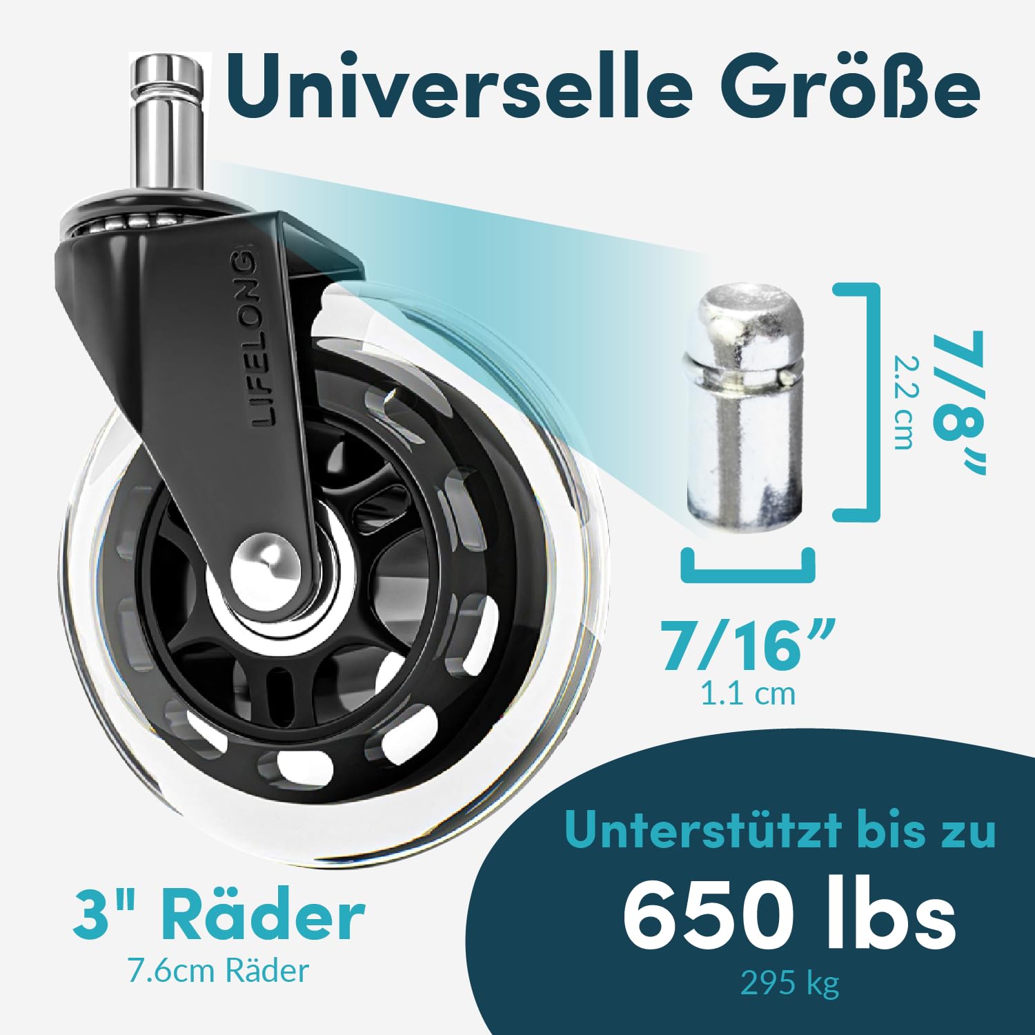 ["IMPORTANT: The shaft size of the Lifelong office chair wheels has a diameter of 7/16" x 7/8" (11 mm x 22 mm) and does not fit most 1KEA chairs and some other brand chairs. Please measure and confirm the size of hard floor casters suitable for your chair before purchasing. If you order the wrong size for your chair, please contact Lifelong Support and we will assist you.","THE LAST OFFICE CHAIR WHEELS YOU WILL EVER NEED! - Not all office chair casters are created equal. Our durable office chair wheels are made of industrial steel, precision bearings, and long-lasting polyurethane. The office chair wheels can support loads of up to 295 kg!","NO NEED FOR AN OFFICE CHAIR MAT OR FLOOR PROTECTOR ANYMORE - Our desk chair wheels will NEVER scratch, soil, or damage your desk carpet. Enjoy worry-free, safe gliding over wood, hardwood, laminate, vinyl, tile, and carpet floors all day long with the office chair wheels.","SMOOTH GLIDING, DEAD SILENT - Squeaky and rattling wheels and replacement office chair wheels are clear signs of poor quality. With our rubber wheels, you'll glide completely silently over any floor.","REPLACEMENT WHEELS FOR THE MOST COMMON DESK CHAIRS - Rest assured, our office chair wheels are compatible with almost all desk chairs (please check the size of your shaft before ordering). IMPORTANT: NOT compatible with 1KEA chairs." (our shaft size is hard floor casters 11*22mm)."]