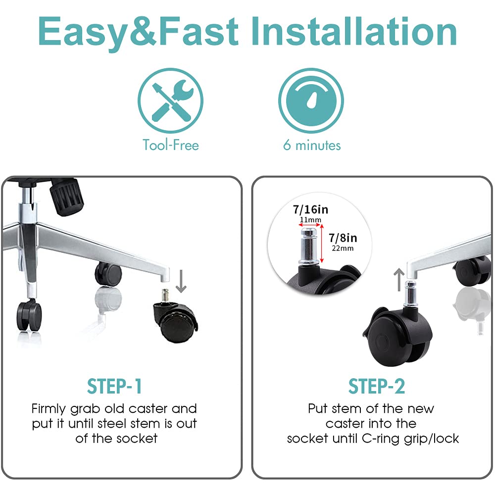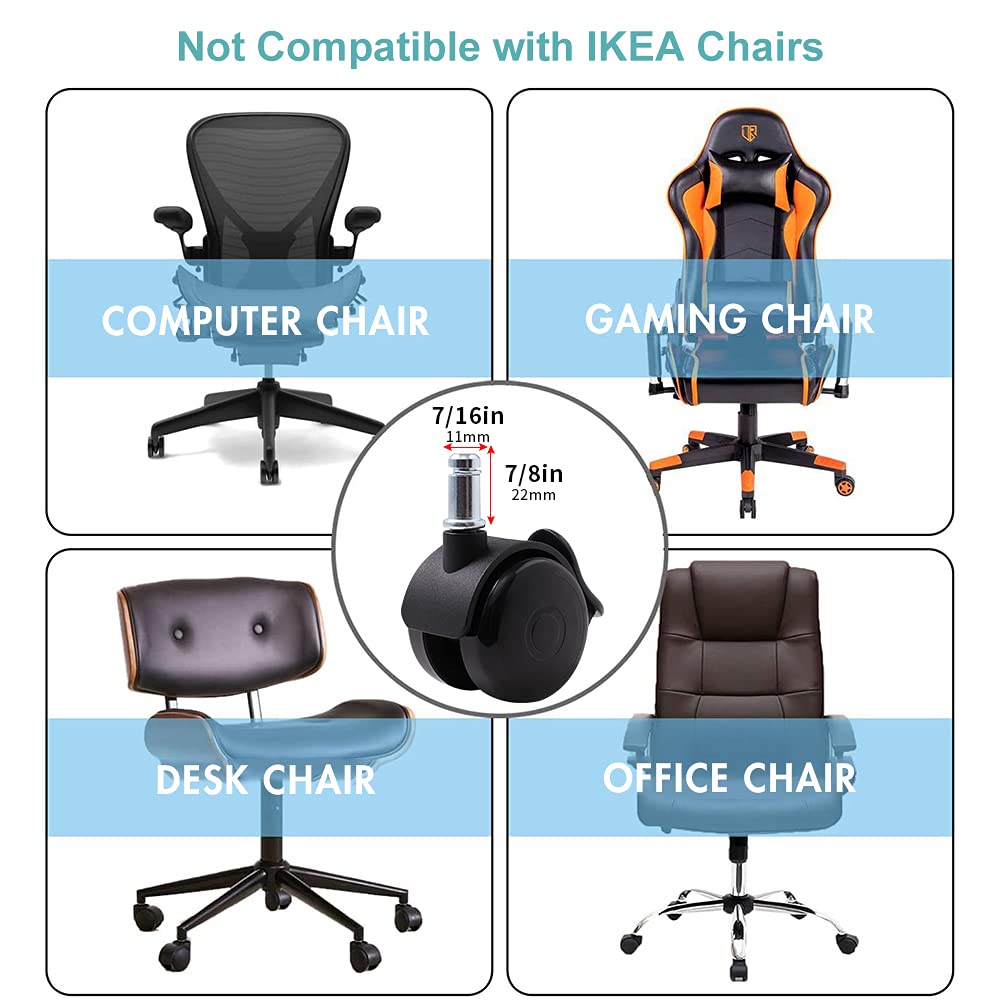 ["FOR ALL WHEELCHAIRS WITH 11MM PINS: Compatible with any desk chair that supports 11mm wheels (Note: IKEA uses 10mm wheels, as do many Topstar office chairs, so please measure before purchasing)", "360º ROTATABLE BALL BEARING: Swivel design for easy movement. All furniture wheels have a good load capacity. 5 wheels with a carrying capacity of 550lbs. The precision ball bearings allow for easier handling and better efficiency. The double ball bearing tracks ensure a smooth and reliable rotation. Wheels with brakes.", "SAFE FOR ALL HARD FLOORS: Protect your floors with our gentle yet high-strength polyurethane wheels for your office chair. Our gentle wheels leave no dark or black streaks on the flooring. Perfect for tiles, hardwood, laminate, wood, marble, granite, stone, concrete, or vinyl floors.", "LOCK BRAKE BY SIMPLE FOOTSTEP: The wheels are equipped with lock brakes that provide excellent control and safety. The lock brake locks both the swivel and wheels, offering an exceptionally stable base when engaged. The brake applies pressure to the wheel tread and stops any rotation of the swivel track.", "SILENT + SMOOTH + DURABLE: Glide completely noiselessly on your office chair. Even during evening home-office hours, no one will be disturbed by your work. Perfect for gamers who like to play at night."]