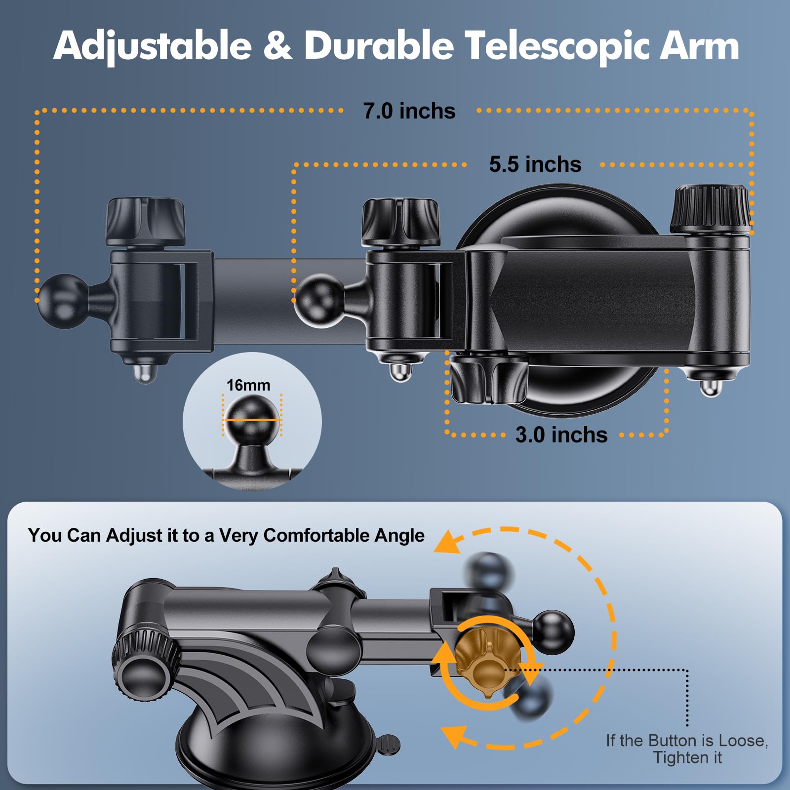 ["Excellent Material Properties"] This car tablet holder is made of durable, heat-resistant, and elastic TPU material. The car holder part will not break after long-term use and can fully support the weight of your tablet. The tablet holder adopts a 360-degree rotatable ball head interface, and the telescopic arm can be freely adjusted within a range of 14-18 cm, allowing you to place it at the best angle without blocking your view.