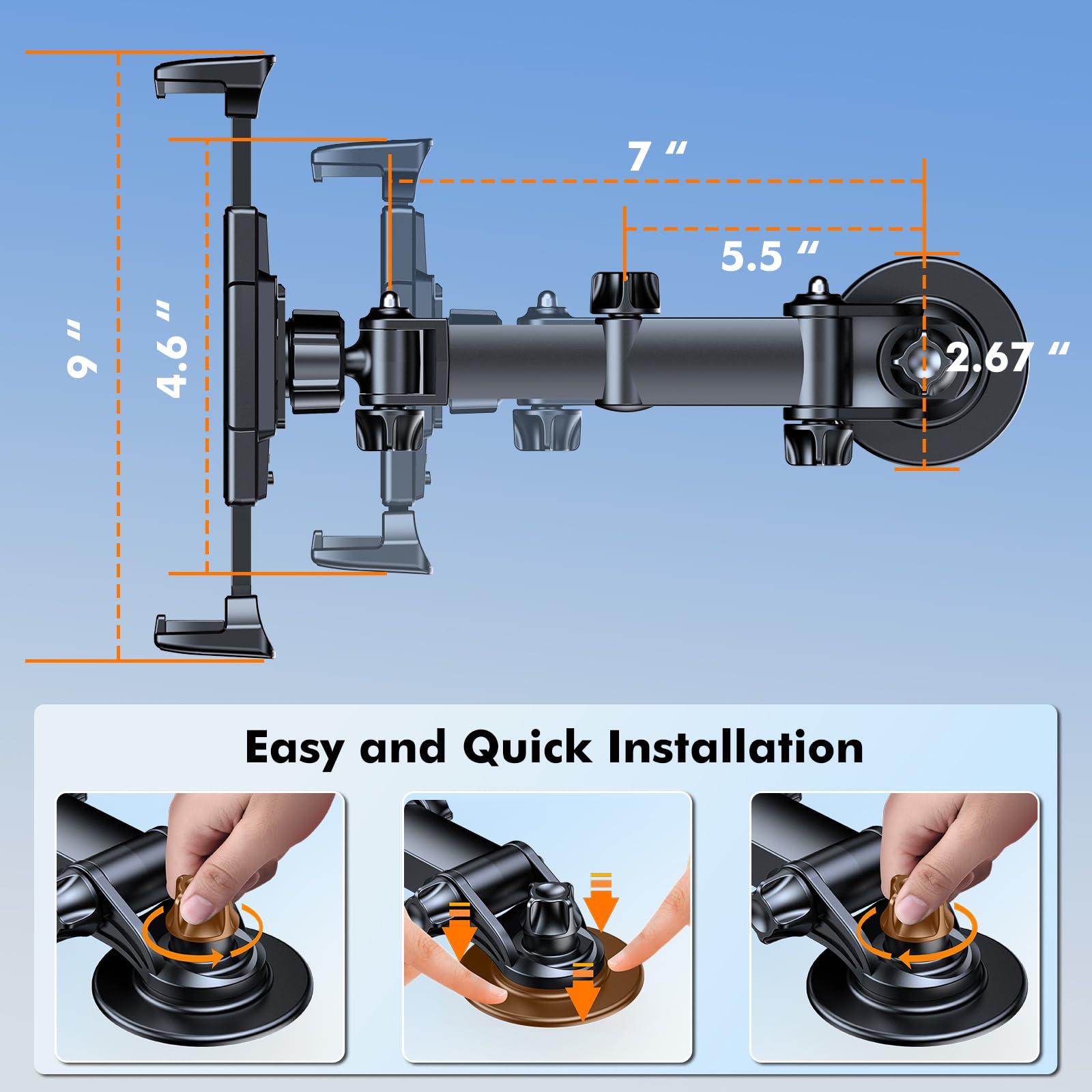 "[EASY INSTALLATION] Installing the tablet holder is a breeze. In a simple step, the holder is attached to the dashboard/windshield or another location, the knob is tightened, and you're good to go.