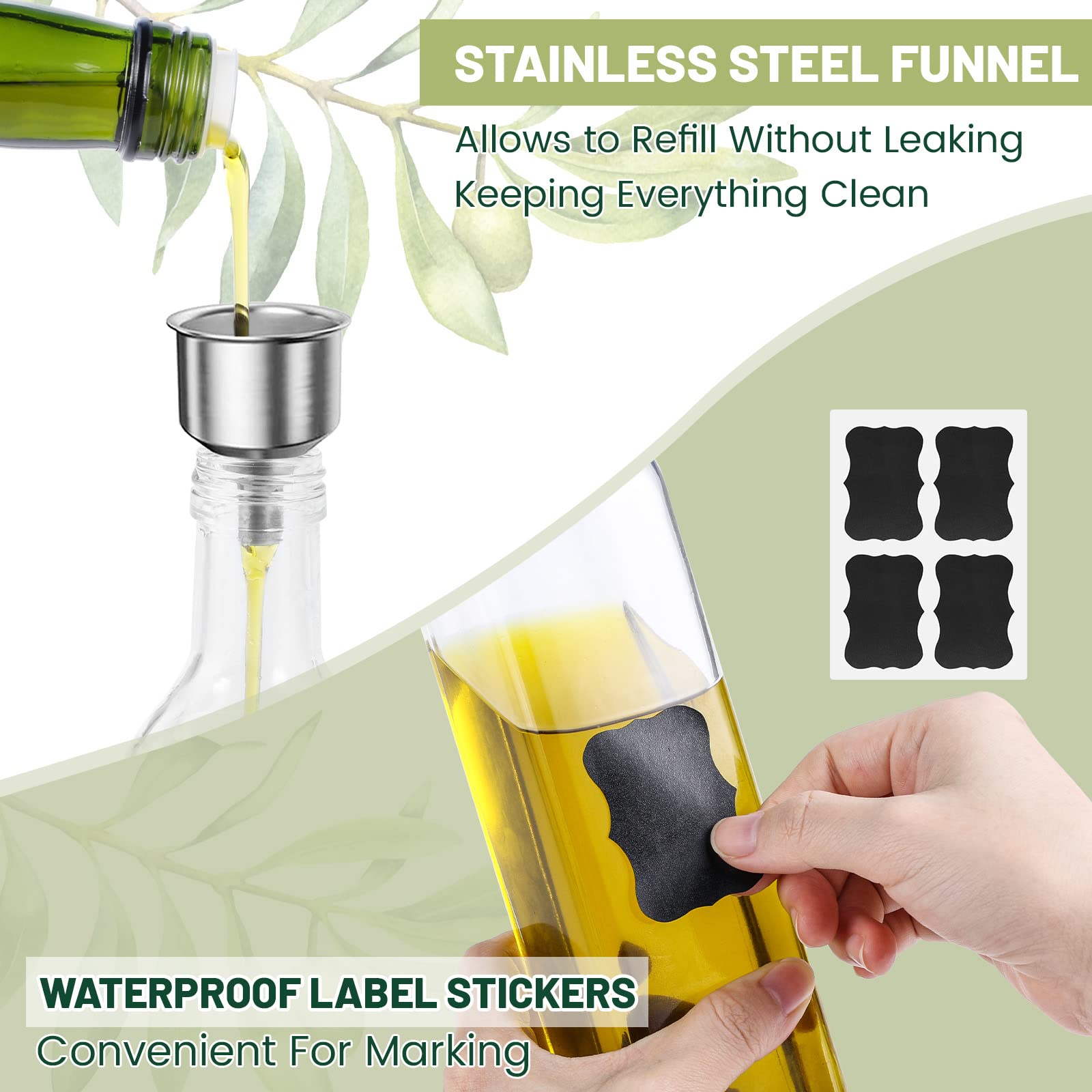 "Practical ACCESSORIES: In addition to the vinegar oil bottles, the package also includes 2 pourers with dust cap, 2 pourers with flip-top, 2 stoppers, a stainless steel funnel, and 4 stickers to easily dose the oil and vinegar and label them for daily use."