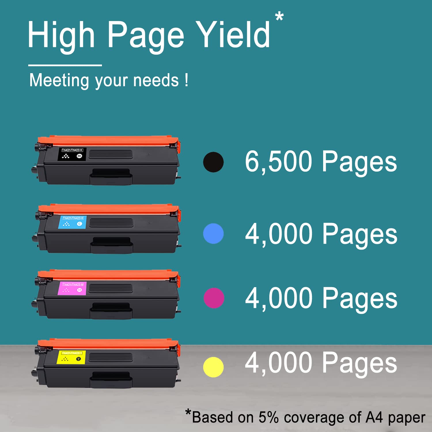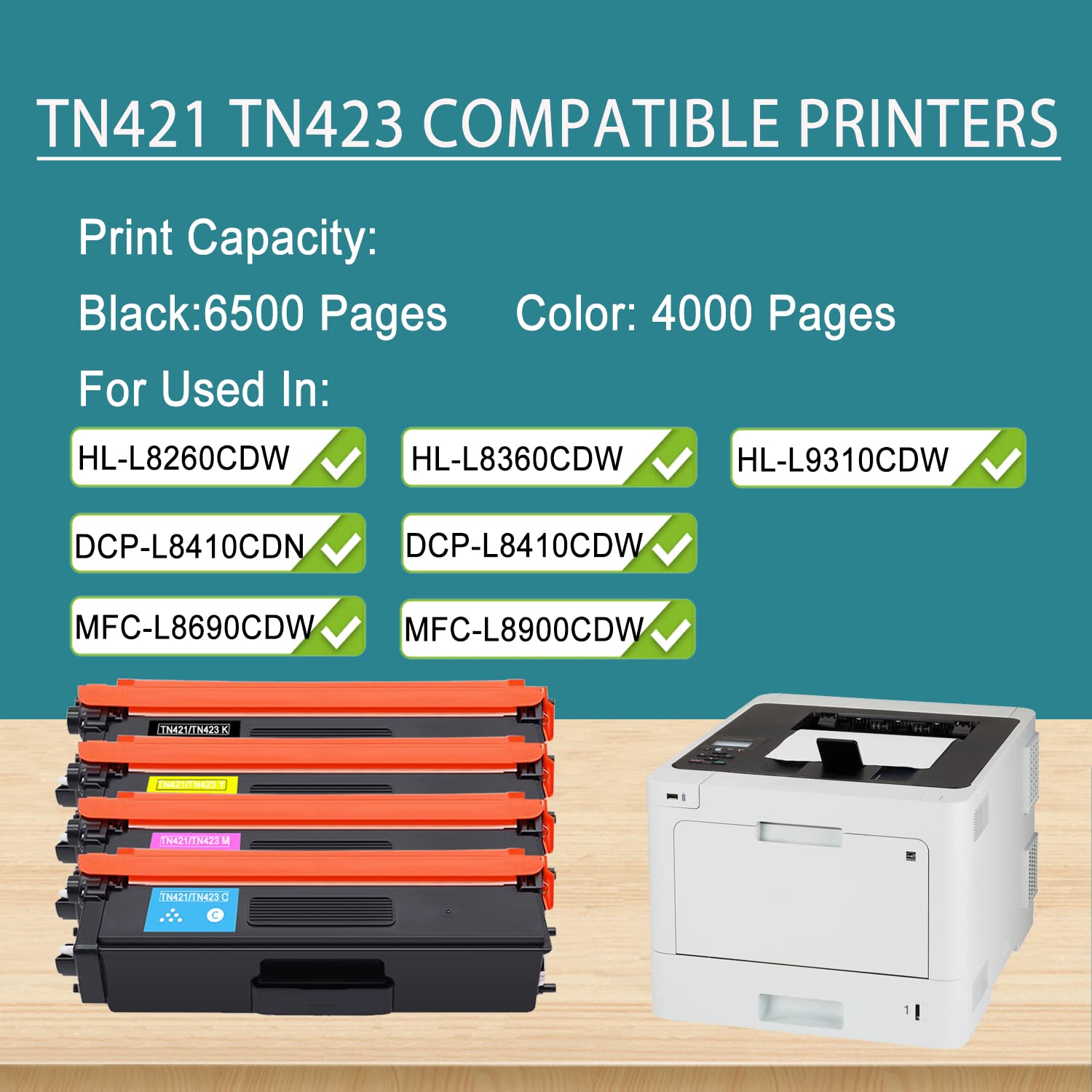["【TN-423 Toner】 Our TN-423 compatible toner cartridge for Brother HL-L8260CDW HL-L9310CDW Brother MFC-L8690CDW MFC-L8690CDW MFC-L8900CDW MFC L8690CDW Brother DCP-L8410CDW DCP-L8410CDN. Other machine models may not be listed. Please contact us anytime.","【High Yield Toner】 Up to 6500 pages per TN421BK TN423BK black cartridge and 4000 pages per TN421C TN421M TN421Y TN423C TN423M TN423Y cartridge with 5% coverage on A4 paper.","【With Smart Chip and High-Quality Toner Powder】 Our compatible Brother TN423BK toner uses an enhanced smart chip to ensure that our toner cartridges are immediately recognized by your Brother printer. High-quality toner powder delivers vibrant colors, clear, and consistent prints for all your important photos and documents.","【TN-421 TN-423 Toner Cartridges 4-Pack】 4 packs of printer cartridges, including 1 x TN-421BK TN-423BK Black, 1 x TN-421C TN-423C Cyan, 1 x TN-421M TN-423M Magenta, 1 x TN-421Y TN-423Y Yellow.","【TN-421 TN-423 Toner Cartridges 4-Pack】 4 packs of printer cartridges, including 1 x compatible replacement for Brother TN423BK Black, 1 x compatible replacement for Brother TN423C Cyan, 1 x compatible replacement for Brother TN423M Magenta, 1 x compatible replacement for Brother TN423Y Yellow."]