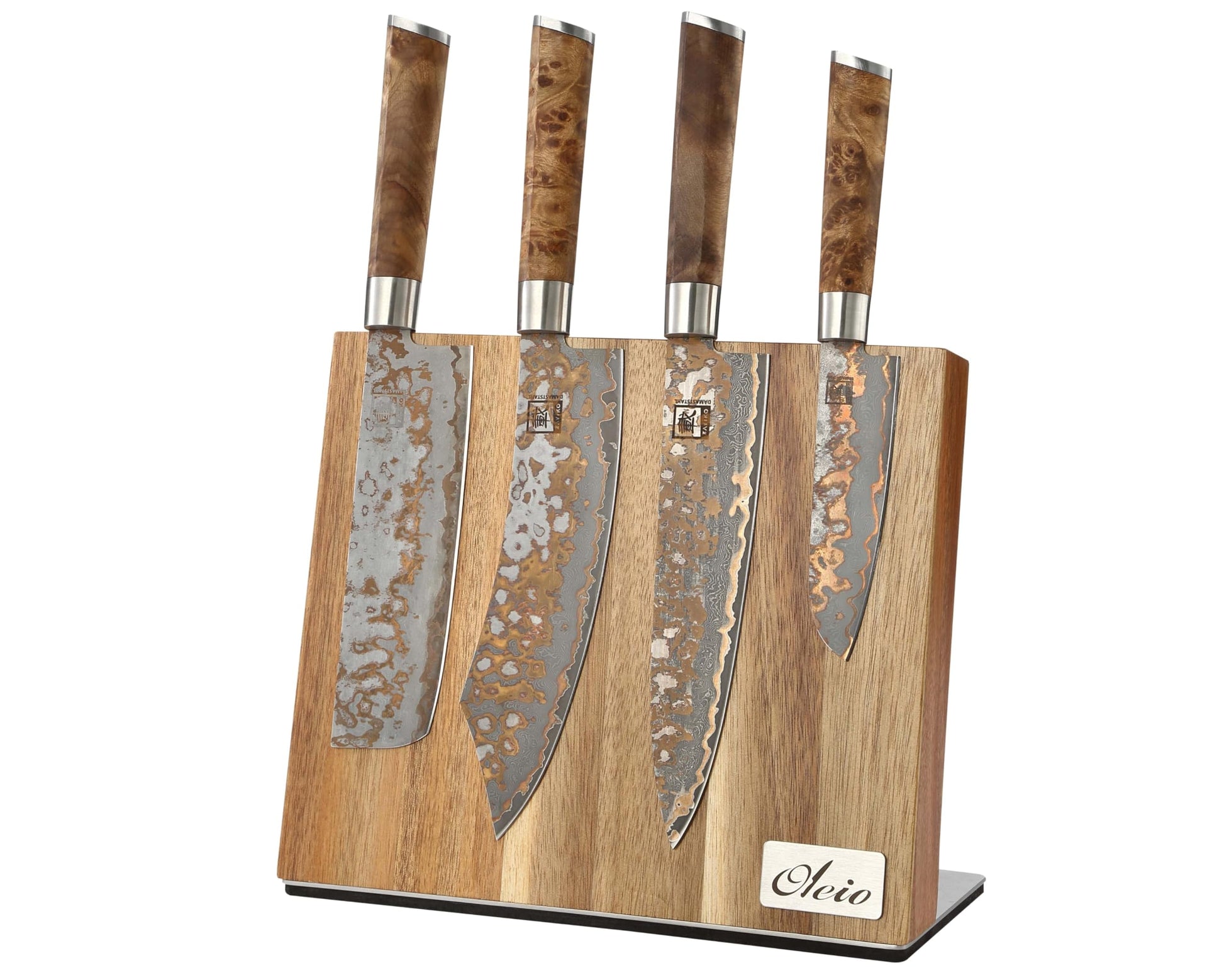 ["MASSIVE KNIFE BLOCK WITHOUT KNIVES: 1.5 inches Acacia wood; dimensions 4.1 × 10.8 × 9.1 inches (W × D × H); integrated magnetic strips for organized storage and quick access - suitable for up to 6 kitchen knives","STRONG MAGNETIC STRIPS & SECURE HOLD: Integrated magnets securely hold short and long blades; stainless steel and damascus knives adhere securely, ceramic knives do not; turn kitchen knives sideways to protect the edge and remove them with control","STURDY STAINLESS STEEL BASE & NON-SLIP: Heavy base with full non-slip padding provides secure grip on smooth surfaces; the block stays stable and does not tip when knives are put on or taken off","ACACIA WOOD - NATURAL GRAIN: Made of solid acacia wood, finished with food-grade oil; smooth surfaces support gentle storage and removal; each wood structure is unique and adds a subtle accent to the kitchen","VERSATILITY & GIFT IDEA: Can be used as a magnetic knife holder, knife block, or compact knife storage; suits modern and classic kitchen styles and makes a fitting gift for hobbyists and professional chefs - knives not included"]