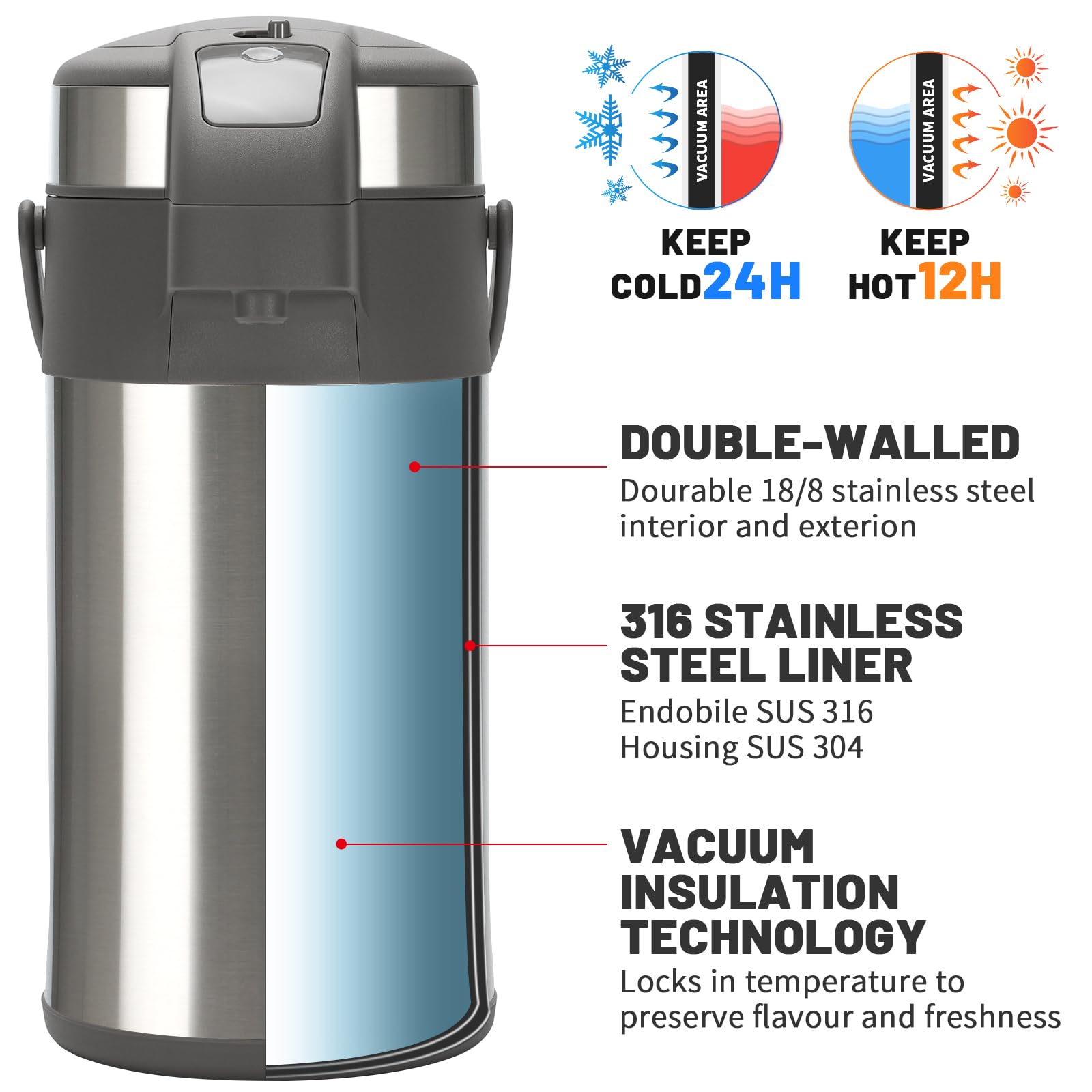 ["WARM AND COLD: The stainless steel insulated pump pot has a capacity of 4 liters and keeps drinks warm or cold for about 8 hours!","PUMP MECHANISM: The pump pot features a lockable pump mechanism and makes it easy to pour coffee or tea!","HIGH QUALITY: The double-walled insulated thermos bottle is made of durable, impact-resistant stainless steel inside and out!","EASY TO USE: Easy to fill and clean the thermos flask thanks to its generous opening. Rinse with warm water before first use!","Responsive customer service and bonus pump vacuum insulated jug guarantee - If you are not completely satisfied with your pump pot, contact us immediately!"]