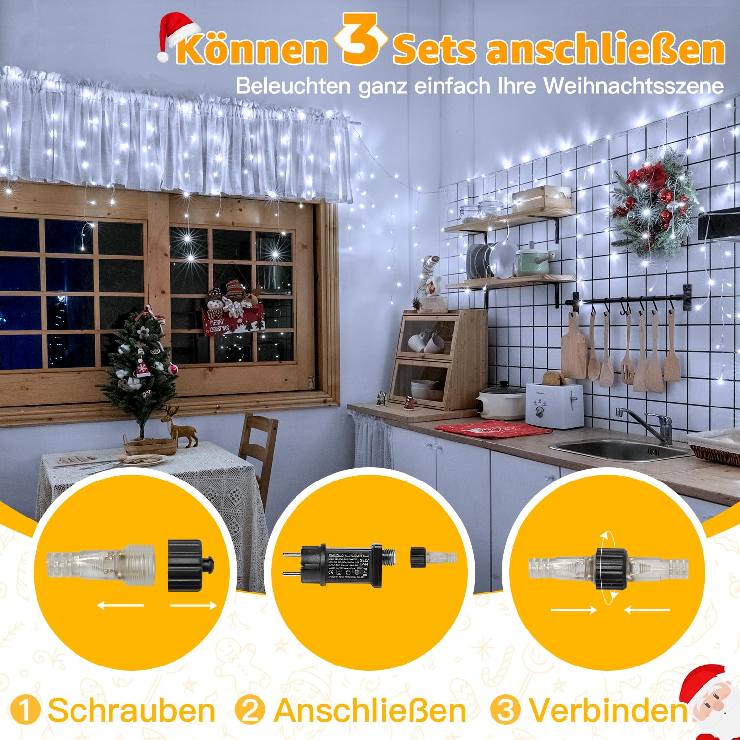 ["600LED Icicle Fairy Lights: 49.2 ft long fairy lights; Covers larger areas; 4, 6, 8 LEDs per strand; Total of 99 strands; Enough light for dazzling Christmas decoration; Comes with a 16.4 ft extension cord, easily connected to power supply","3 Sets Expandable: Outdoor Christmas lights easily connectable; Extend fairy lights as needed; Easy installation, hang main wire, let fairy lights hang down, no complicated installation steps required","8 Modes and 4 Brightness: Outdoor icicle fairy lights have 8 lighting modes, from steady glow to slow flash, adjusts to your desired mood; Dimmable 25% 50% 75% 100%, each mode offers a unique visual experience","3 Timer and Memory: Press the button on the adapter, activates the timer function: 4/6/8 H; Icicle fairy lights for outdoor with built-in memory chip saves the last mode, no daily resetting required","IP44 Waterproof: Ollny Icicle Fairy Lights for outdoor 49.2 ft suitable for outdoor use, no worry in moisture or bad weather; whether for cozy evenings or festive parties, elevate your Christmas decoration to a new level"]