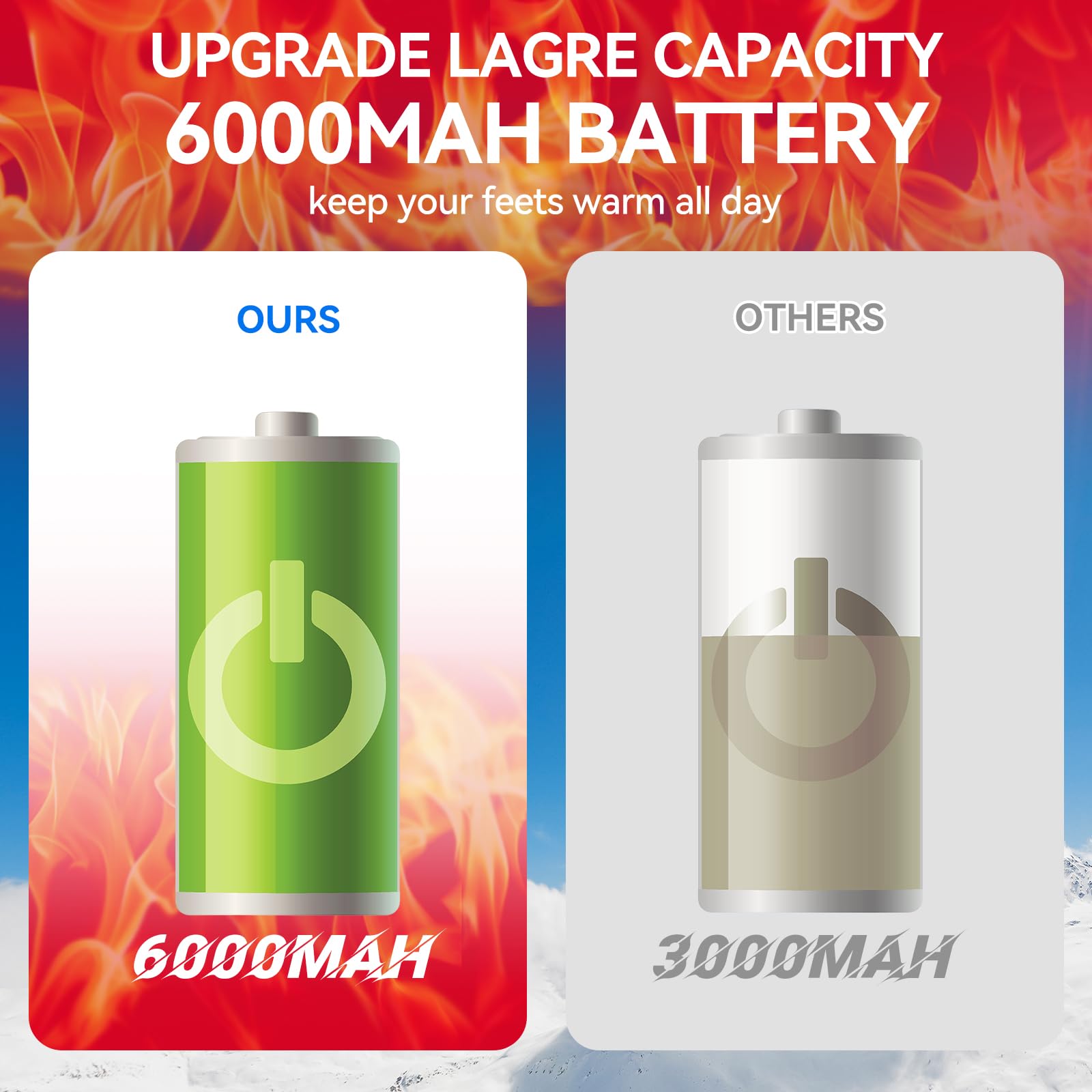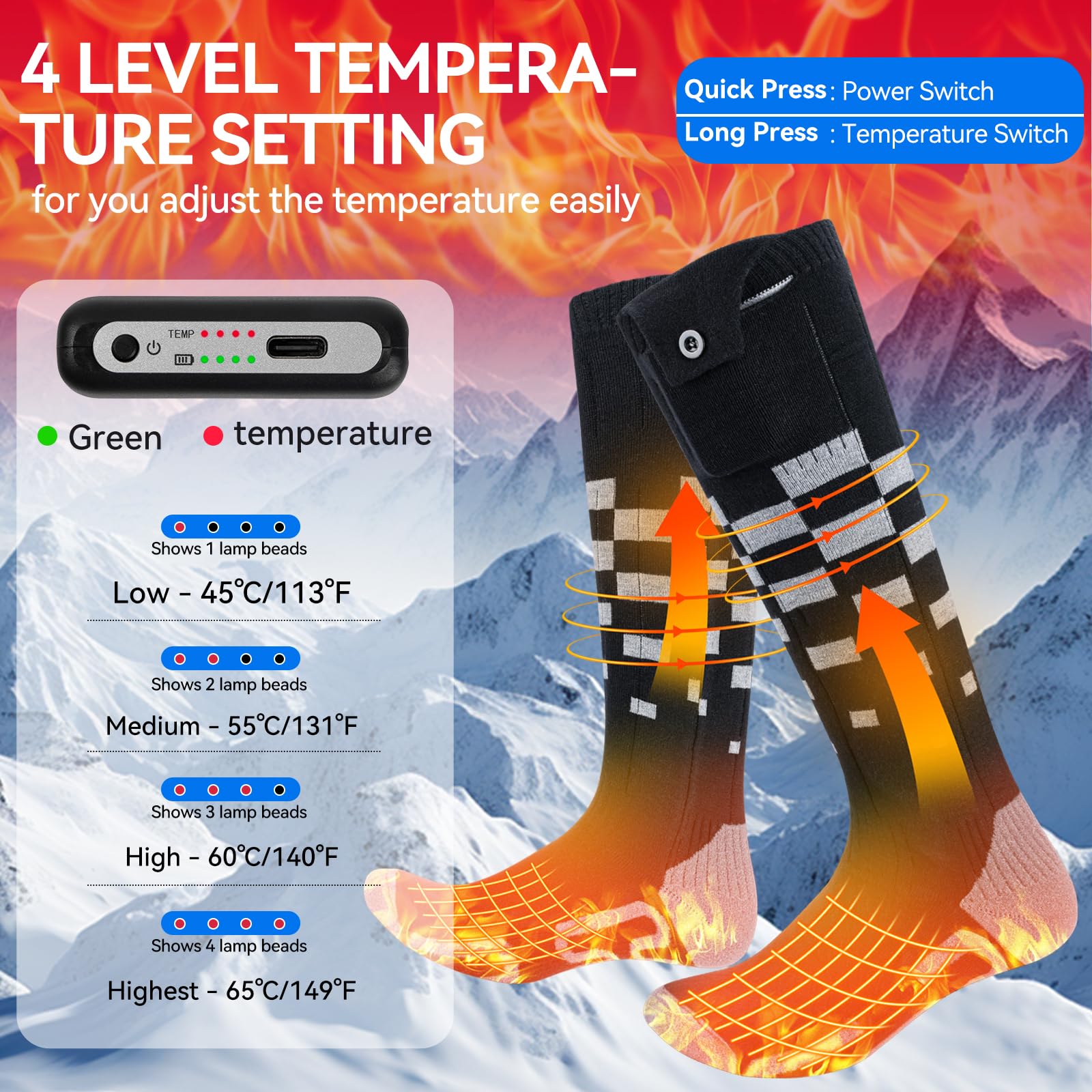 ["Long battery life: Heated socks are equipped with two high-capacity 6000 mAh batteries. The heated socks can continue to work for 8 hours at the lowest temperature, providing warmth in any weather. Whether you are engaging in outdoor activities or using the socks daily, you can feel the sustained warmth.","Temperature setting with 4 speeds: The electric socks have four temperature settings to meet different requirements. Including highest heat (65 °C/149 °F, 3-4 hours), high heat (60 °C/140 °F, 4-5 hours), medium heat (55 °C/131 °F, 5-6 hours), and low heat (45 °C/113 °F, 7-8 hours). You can choose according to your preferences and enjoy the freedom of temperature adjustment at any time.","Soft and breathable material: The heated socks are made of crystal velvet, modal core yarn, and spandex blend materials, which are soft and breathable, have a strong warming effect, ensure comfort and functionality, and are suitable for long-term wear. Hand washable or machine washable (put in a laundry bag)! (Remove the power bank before cleaning)","Fast heating technology: The improved heating element allows the socks to heat up in seconds, no need to wait long! The improved heating element of the battery socks covers the entire toes and the instep. When wearing these warm winter socks, your toe area will quickly warm up and keep the entire foot warm throughout the heat cycle.","Multiple size options: Heated socks for men and women are available in sizes S (suitable for women with shoe size 35-40) and M (suitable for men and women with shoe size 38-45) to accommodate a variety of needs. They are great for various winter sports and outdoor activities like hunting, hiking, camping, skiing, mountain climbing, walking, etc. Please check your shoe size before purchasing!"]