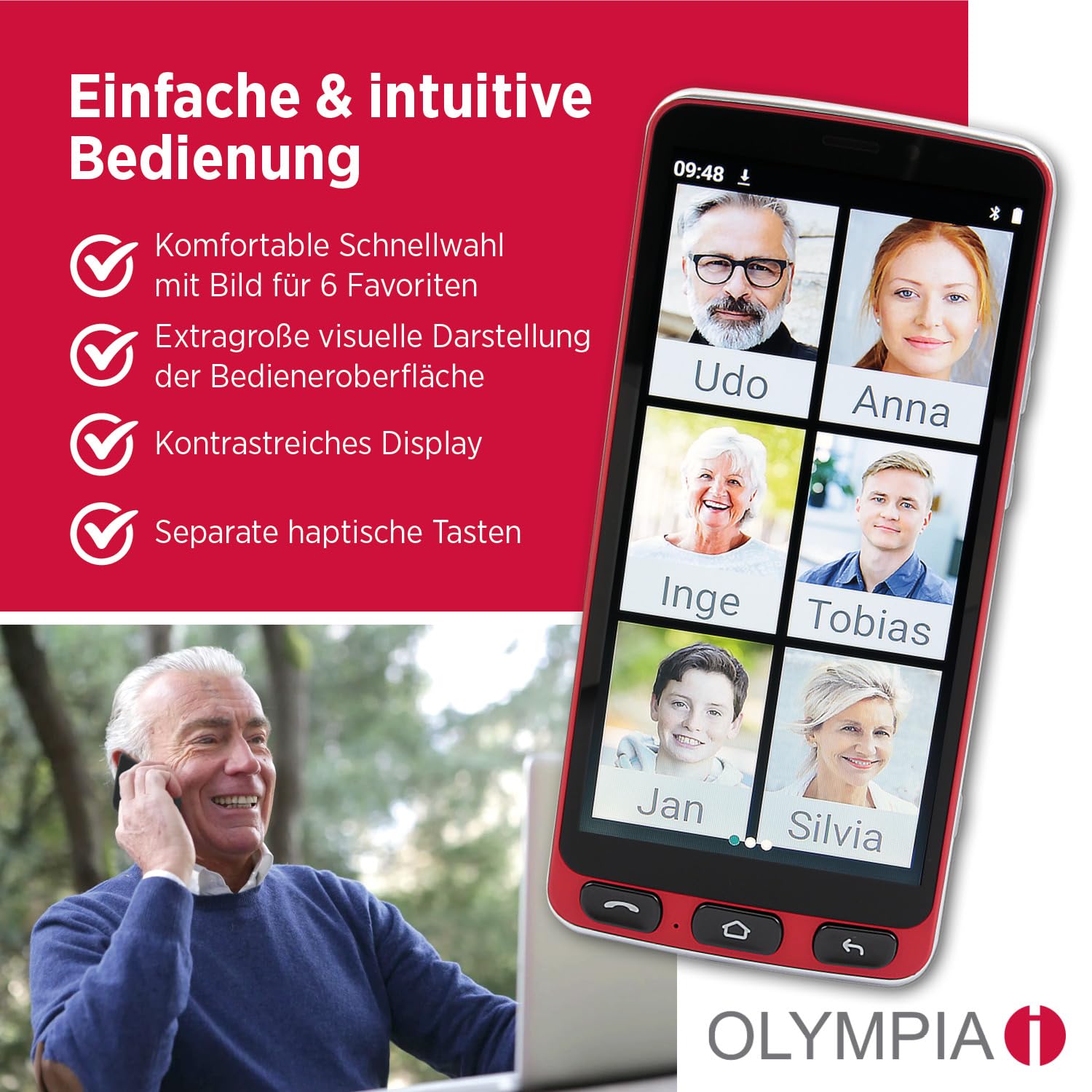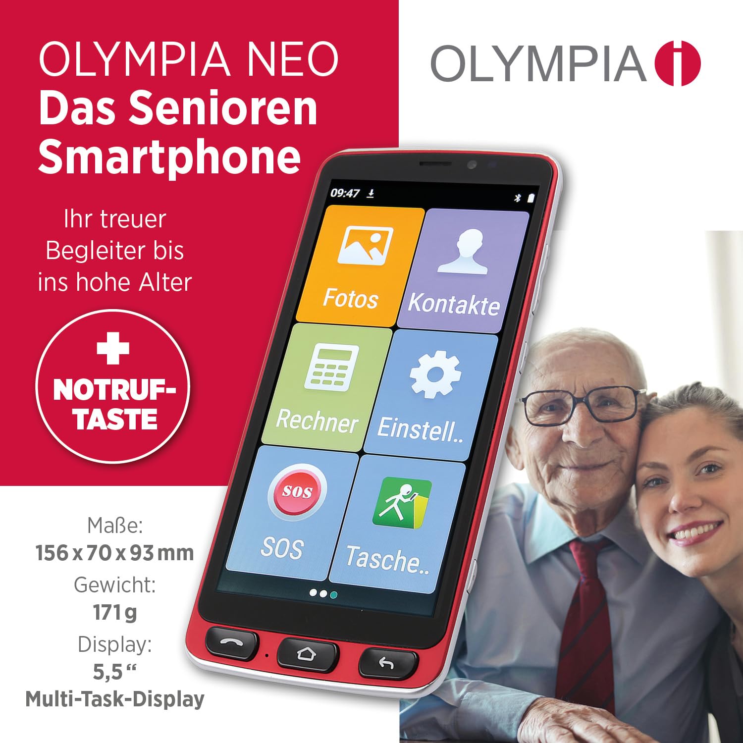 ["EASY OPERATION FOR SENIORS The Olympia Neo Senior Phone offers user-friendly operation with extra-large display and high-contrast screen, improving readability and navigation significantly.","HEARING AID COMPATIBLE & EMERGENCY CALL BUTTON Specifically designed for seniors, the smartphone is hearing aid compatible and has an easily accessible emergency call button for quick help in case of emergency, providing additional security.","VERSATILE COMMUNICATION OPTIONS With pre-installed apps like WhatsApp and mediteo, as well as two cameras, the Olympia Neo smartphone enables easy communication and medication reminders, ideal for everyday use.","POWERFUL TECHNOLOGY Equipped with Android 10, 4G LTE, Dual SIM, Bluetooth, WLAN, and GPS, as well as a 5.5" Multi-Task display, the smartphone offers versatile technical capabilities for any requirement.","LONG-LASTING BATTERY & COMPACT DESIGN The replaceable 2400mAh Li-Ion battery and long talk/standby time of 12/120 hours make the smartphone reliable, while the compact design and charging station make everyday life easier."]