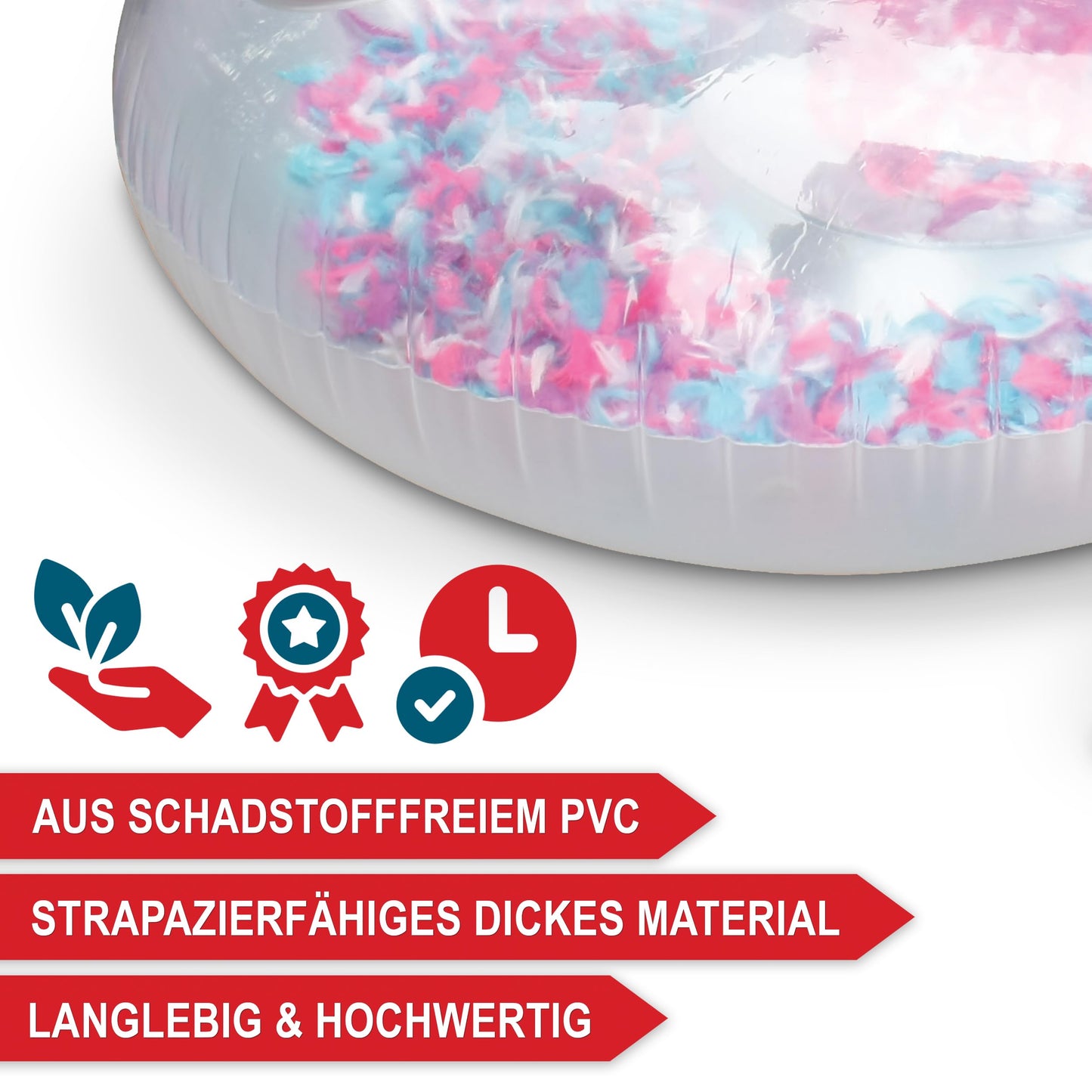 ["MAGICAL SWAN - The pool toy in magical swan design is filled with pink, white, blue & purple feathers and is the highlight at the next pool party or while bathing for young and old.","STABLE & SAFE - The ONBEST Swim animal is made of 0.28mm thick phthalate-free, skin-friendly PVC and therefore completely harmless. Inflatable swan swim ring.","QUICK SETUP & DISMANTLING - Water animals, like the swan, are easy to inflate. After use, simply release the air and the air animals can be stored in a space-saving way.","XXL DESIGN - The ONBEST pool animals provide maximum bathing fun with an extra large design of 183x162x117 cm. The swan offers enough space for adults and children 14+. Load capacity: max. 80 kg","POOLS & ACCESSORIES - Whether swimming animals (flamingo, unicorn, crocodile, dolphin & Co), air mattress, water toys, bathing island or paddling pool. Inflatable ONBEST items are stable and convince with brand quality"]