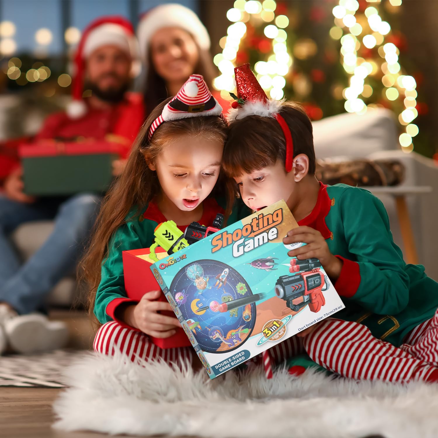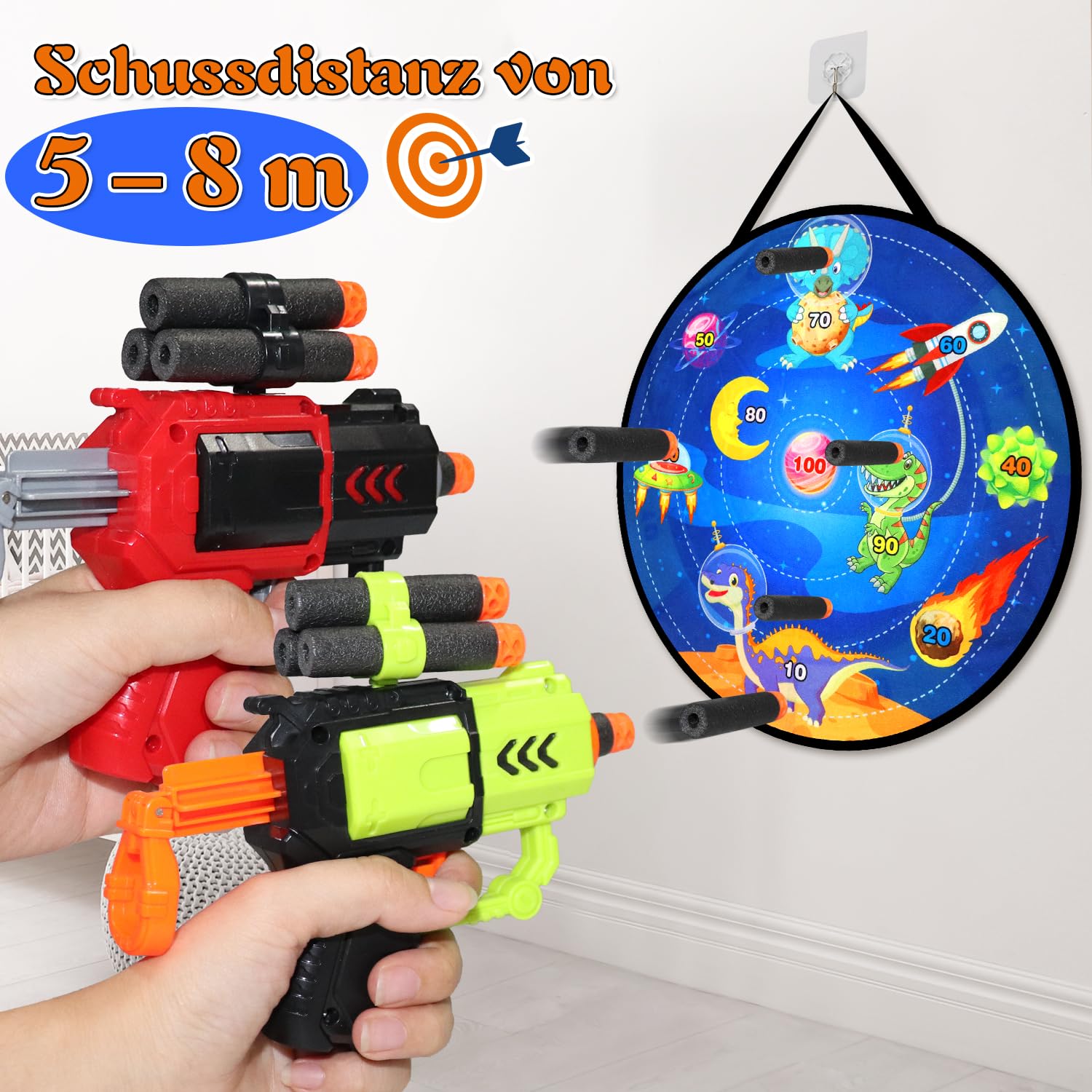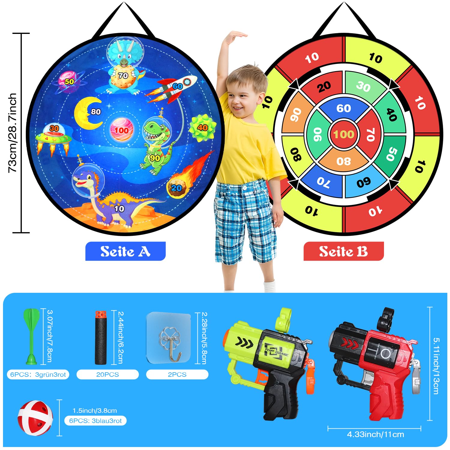 ["DOUBLE-SIDED DINOSAUR DARTS BOARD: Every kid loves space, dinosaurs, and throwing games! The Oneyus dart board set includes a fantastic 28.7-inch double-sided dart board decorated with vibrant designs of these elements, along with 2 soft dart blasters. It's equipped with everything your child will love. Join us for an exciting adventure.", "THROW AND SCORE GAMES: With the target on the dinosaur side, kids can throw darts and sticky balls to achieve the best hit - a classic party favorite. Switch to point mode for a competition with the two guns and 20 soft balls - who will reach the highest score or even discover the next Olympic champion.", "WHAT YOU GET: This kids dart board includes 2 toy guns, 20 sticky soft balls, 6 sticky balls, and 6 darts. The various accessories allow for multiplayer fun and promote a sense of competition, helping children improve their social and communication skills through engaging play.", "INDOOR AND OUTDOOR DART GAME FOR ALL AGES: This dart board set is suitable for all ages, with easy-to-understand rules that guarantee fun. There are no restrictions on where it can be played - whether indoors, in the garden, or on the lawn - you can enjoy this versatile game anytime, making it a fantastic choice for entertainment indoors and outdoors.", "Keep your kids off the couch and screens with the perfect Christmas gift: our dart board set! Ideal for boys, girls, toddlers, and teenagers, it makes a great prize or reward for good behavior. The best toy gift for kids aged 3 4 5 6 7 8 9 year old boys girls girls. With this fun game, they'll spend hours of pure joy, which is also good for their health."]