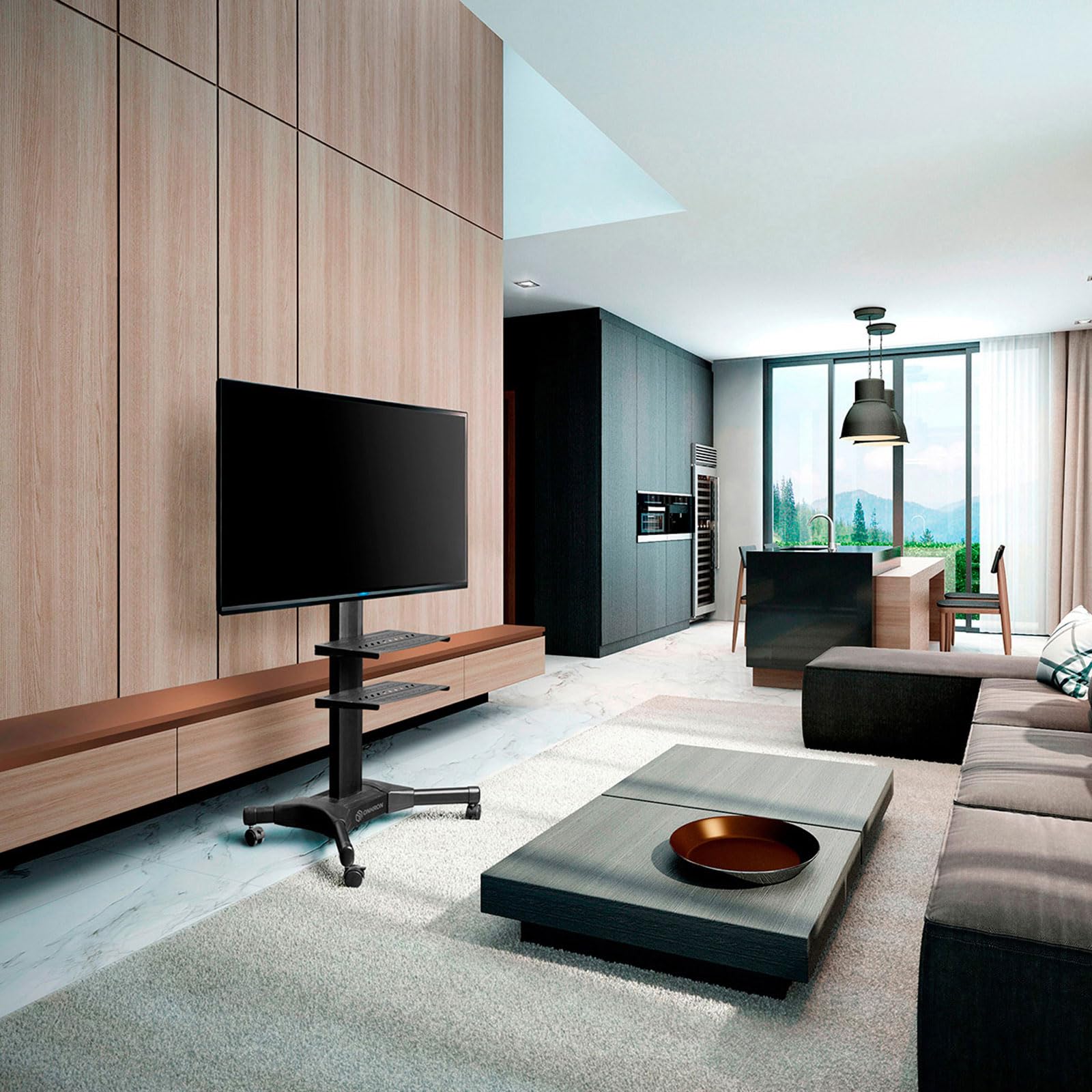 "Mobile TV cart with wheels fits all compatible diagonals LCD, LED, OLED, QLED, FullHD, 4k, 8k: 32, 42, 49, 55 inches; the Stand Wheels is compatible with Sony, Samsung, LG, Panasonic, Hisense Philips, Nokia TVs, and others",