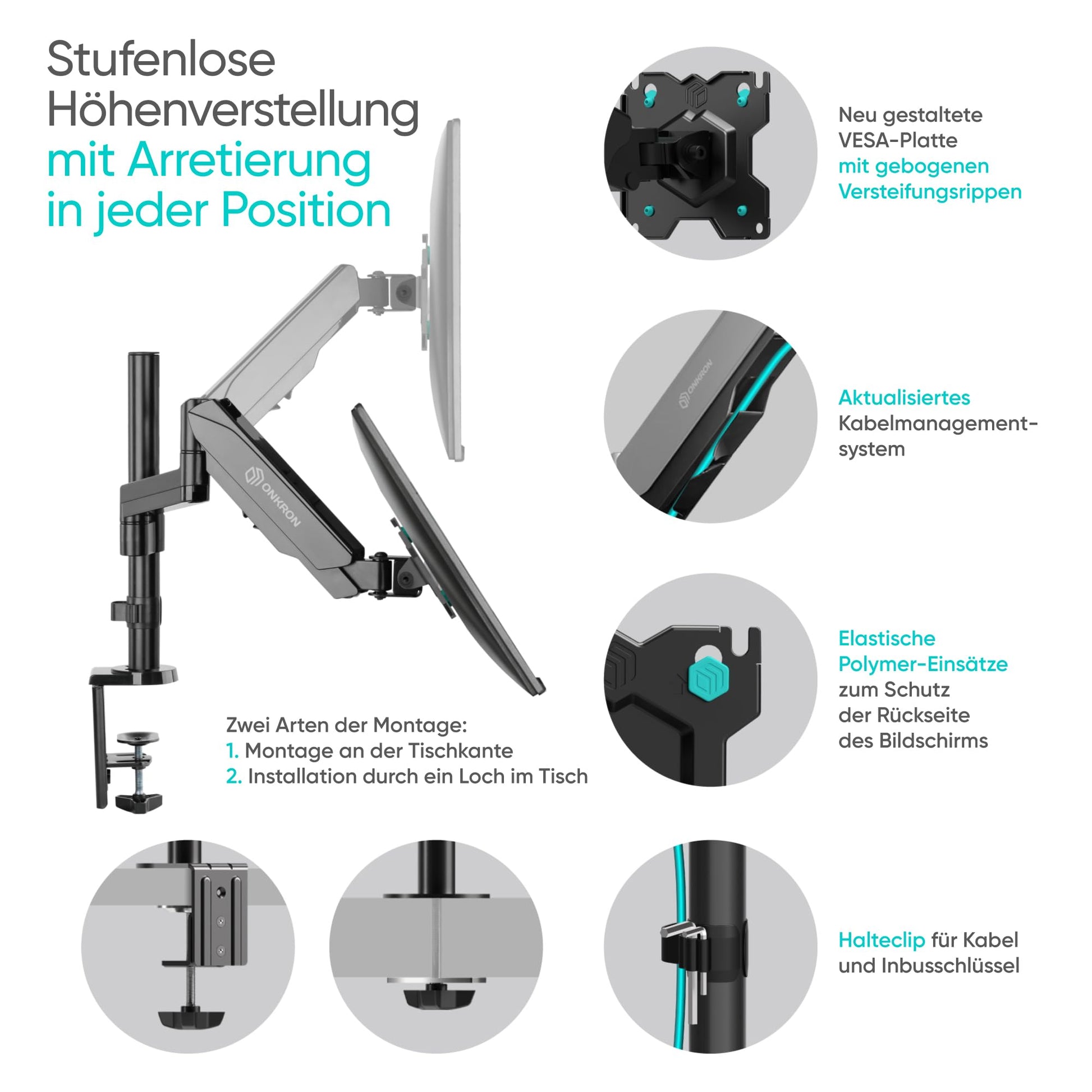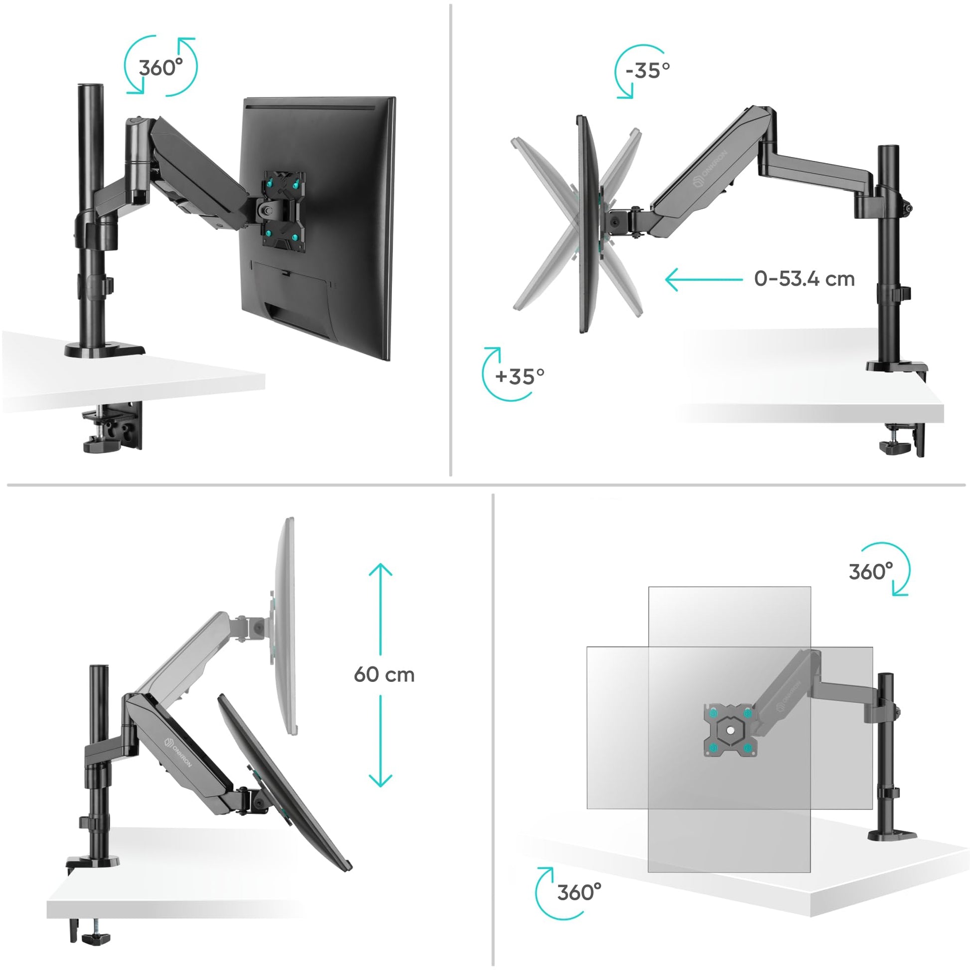["DESKTOP MONITOR MOUNT | ONKRON G70-B desktop monitor mount is suitable for 13 - 34 inch flat & curved screens weighing 1 to 8 kg | Screen arm is compatible with VESA 75x75 - 100x100 | Gas spring monitor mount withstands over 50000 load cycles | Desktop monitor bracket ensures long-lasting durability of the screen mount","SWIVEL MONITOR ARM | Desk monitor mount is height adjustable up to 600 mm | Desktop monitor arm can tilt from -90° to +45° and swivel 180° | 1 desktop monitor mount is rotatable by 360° | Use this VESA monitor mount at home and in the office!","COMFORTABLE DESK MONITOR HOLDER | Monitor mount 1 monitor can extend up to 534 mm | Correctly positioned gaming monitor mount 1 monitor preserves your view and posture | Monitor arm 1 monitor helps you fully focus on your work or relax afterwards | VESA mount desk monitor also provides you with optimal comfort","SCREEN HOLDER DESK MOUNT | Mounting kit includes everything for installing the screen mount 1 monitor, as well as fastening elements for screens from popular manufacturers | Monitor arm 1 monitor features a practical cable management system | You can purchase the A35-B organizer shelf to attach it to your VESA desk mount for monitor and store small items","CUSTOMER SUPPORT | ONKRON desktop monitor mount undergoes rigorous quality control | VESA monitor stand has soft inserts to protect the monitor back | Our experts are ready to answer all your questions about PC screen mount desk & curved monitor mount height adjustable"]