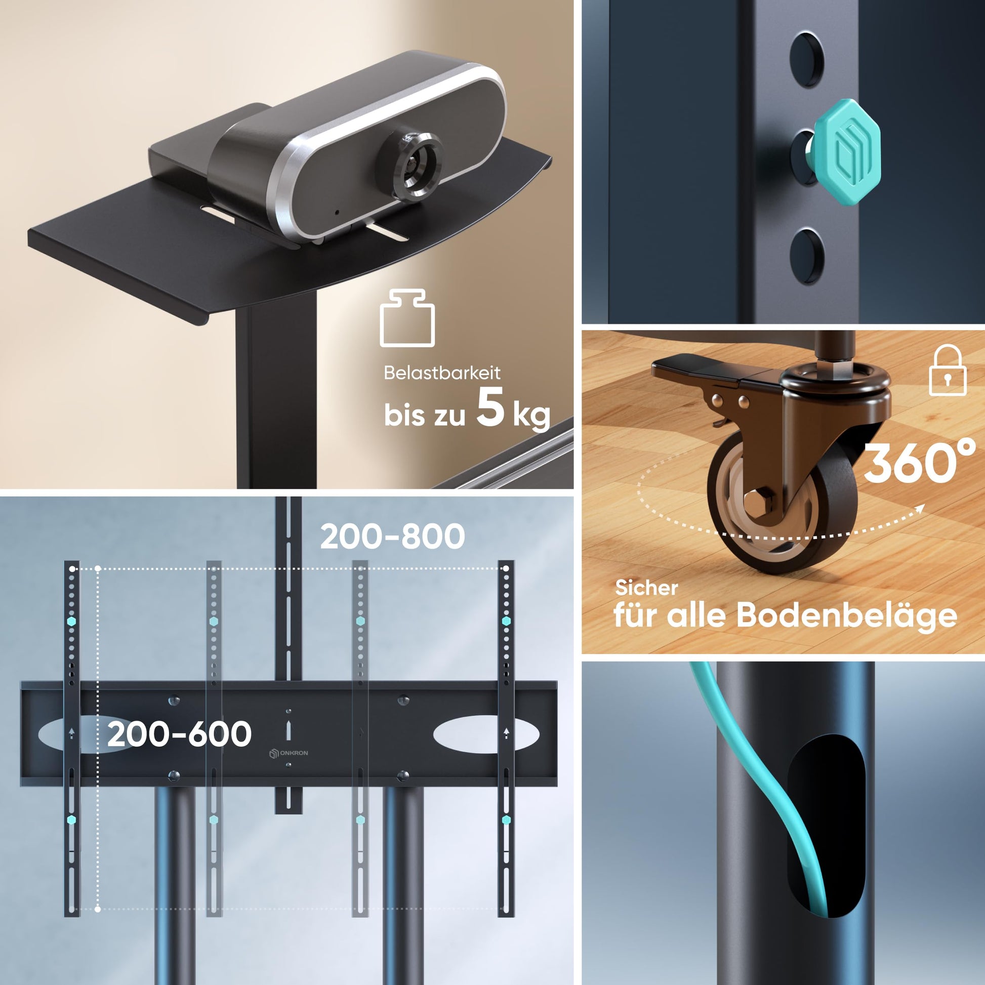 ONKRON TV stand on wheels for 55-90 inch TVs, max weight capacity 90 kg, rolling TV stand with adjustable height, max VESA 800x600, professional TV cart with black rollers TS1871-B.