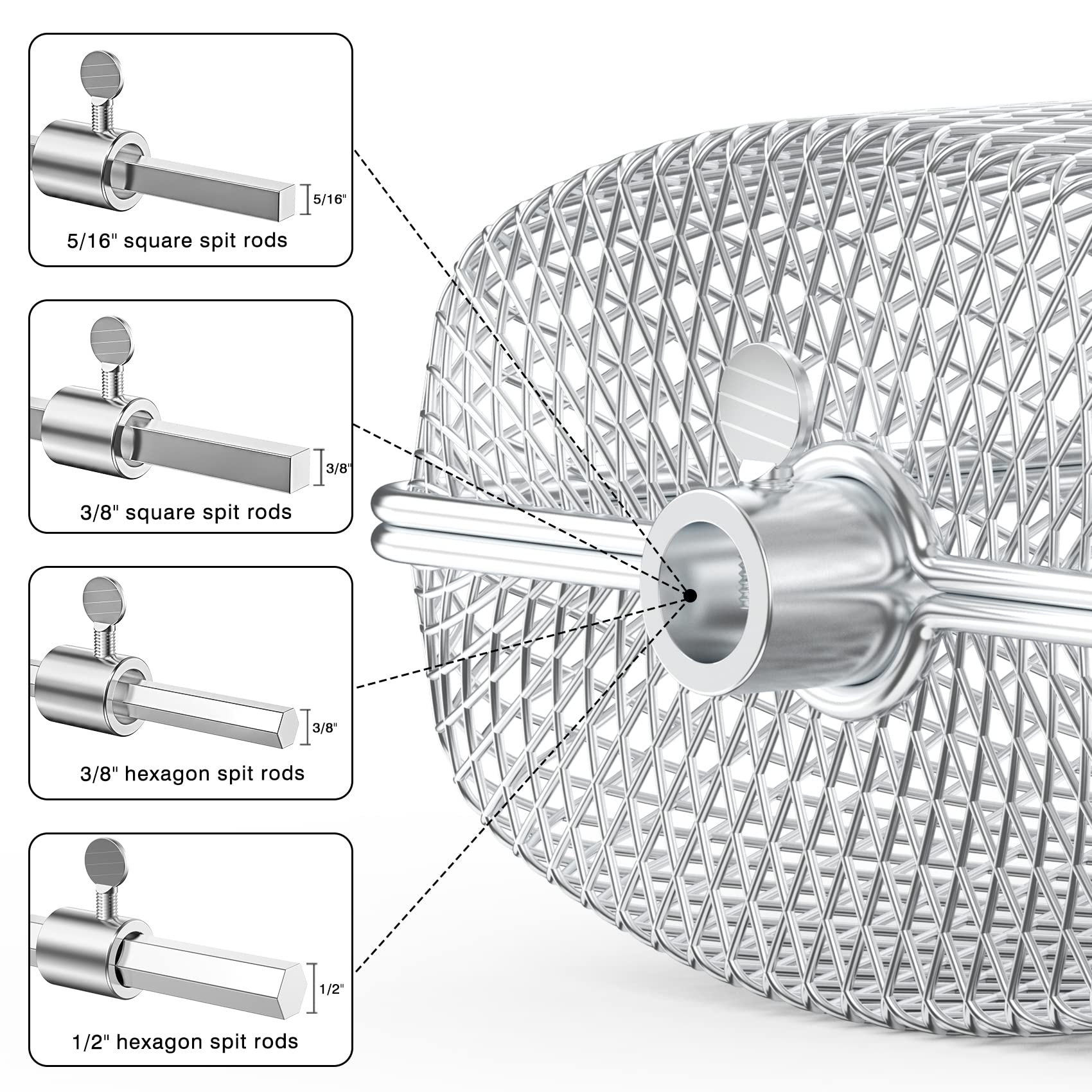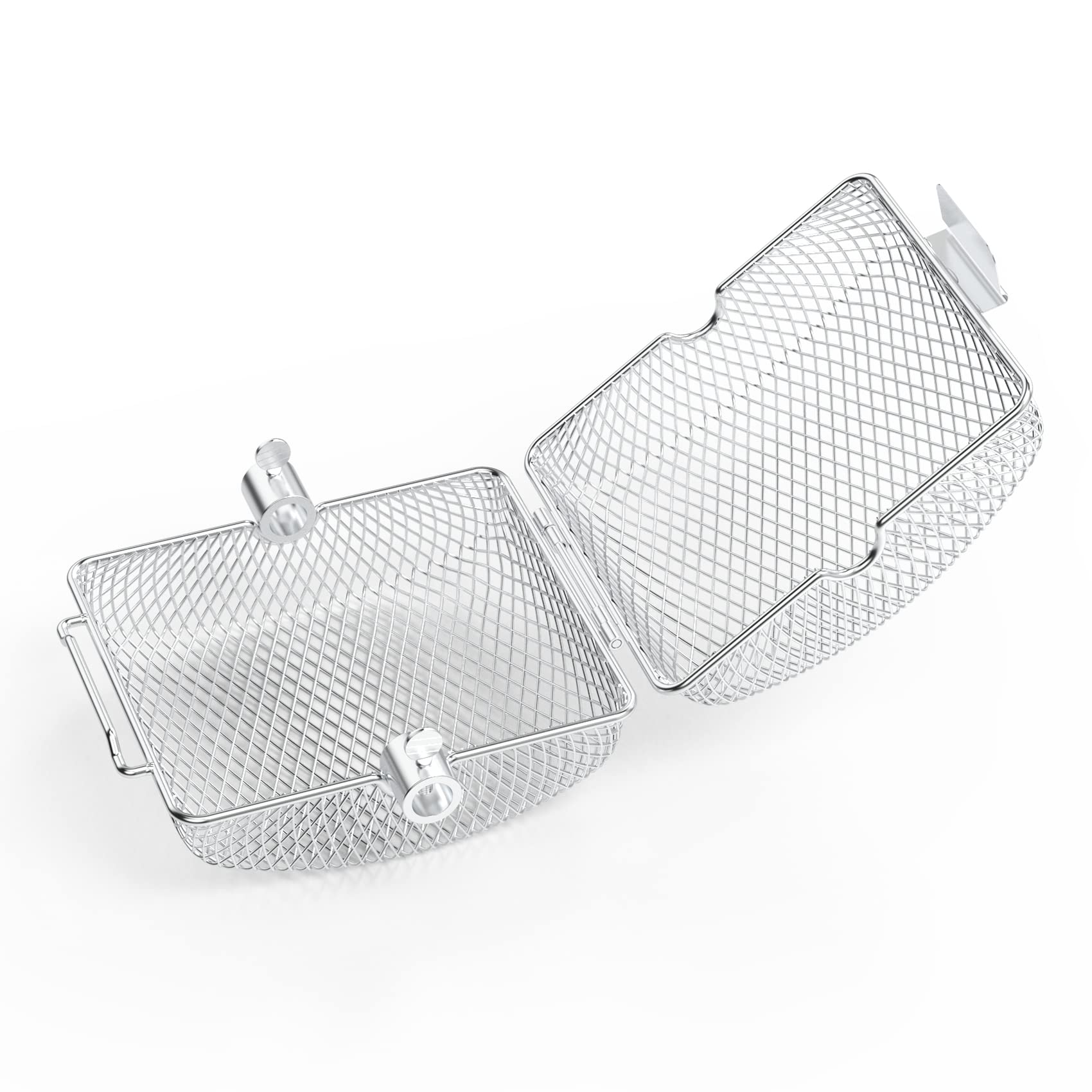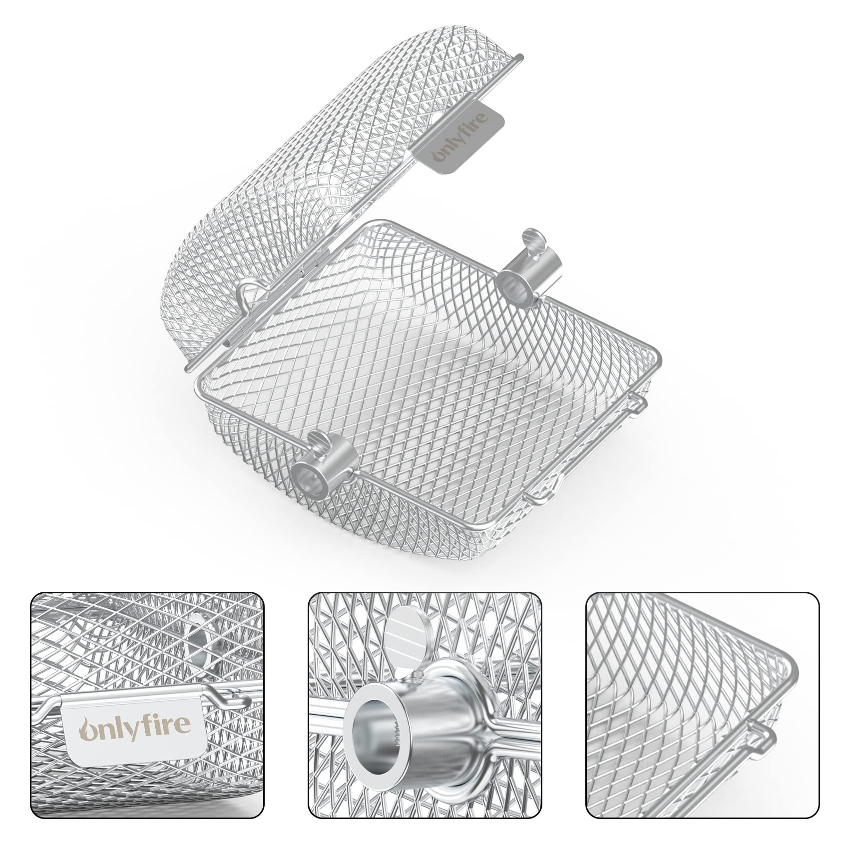["【Superior Material】: Made of high-quality food-grade stainless steel, no harmful chemicals are released at high temperatures to ensure your health, easy for simple usage.","【Suitable for Most Grills】: Fits 1/2\" hex, 3/8\" hex, 3/8\" square, and 5/16\" square skewer rods, can be used on most gas and charcoal grills.","【Cook Various Foods Simultaneously】: Three stainless steel baskets can be used simultaneously to cook different foods separately, preventing food from mixing.","【Firm Lock Design】: The buckle closure design ensures the basket is securely closed during cooking, preventing food from falling off. Once the food is roasted, simply open the buckles to easily unlock and remove the food.","【Multifunction】: Fine mesh grill basket, perfect for cooking small, finely chopped foods like french fries, seafood, chicken wings, vegetables, etc. It is the perfect cooking tool for camping, tailgating, family gatherings, and outdoor grilling"]