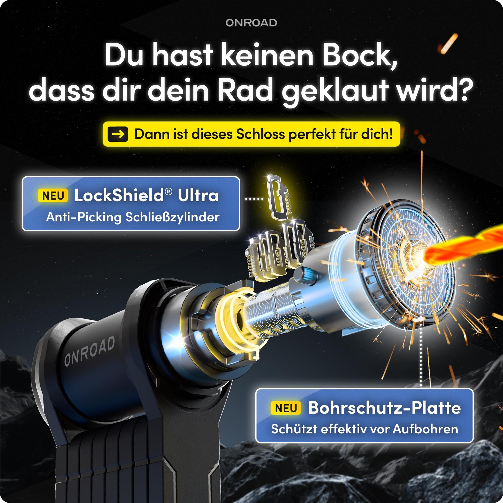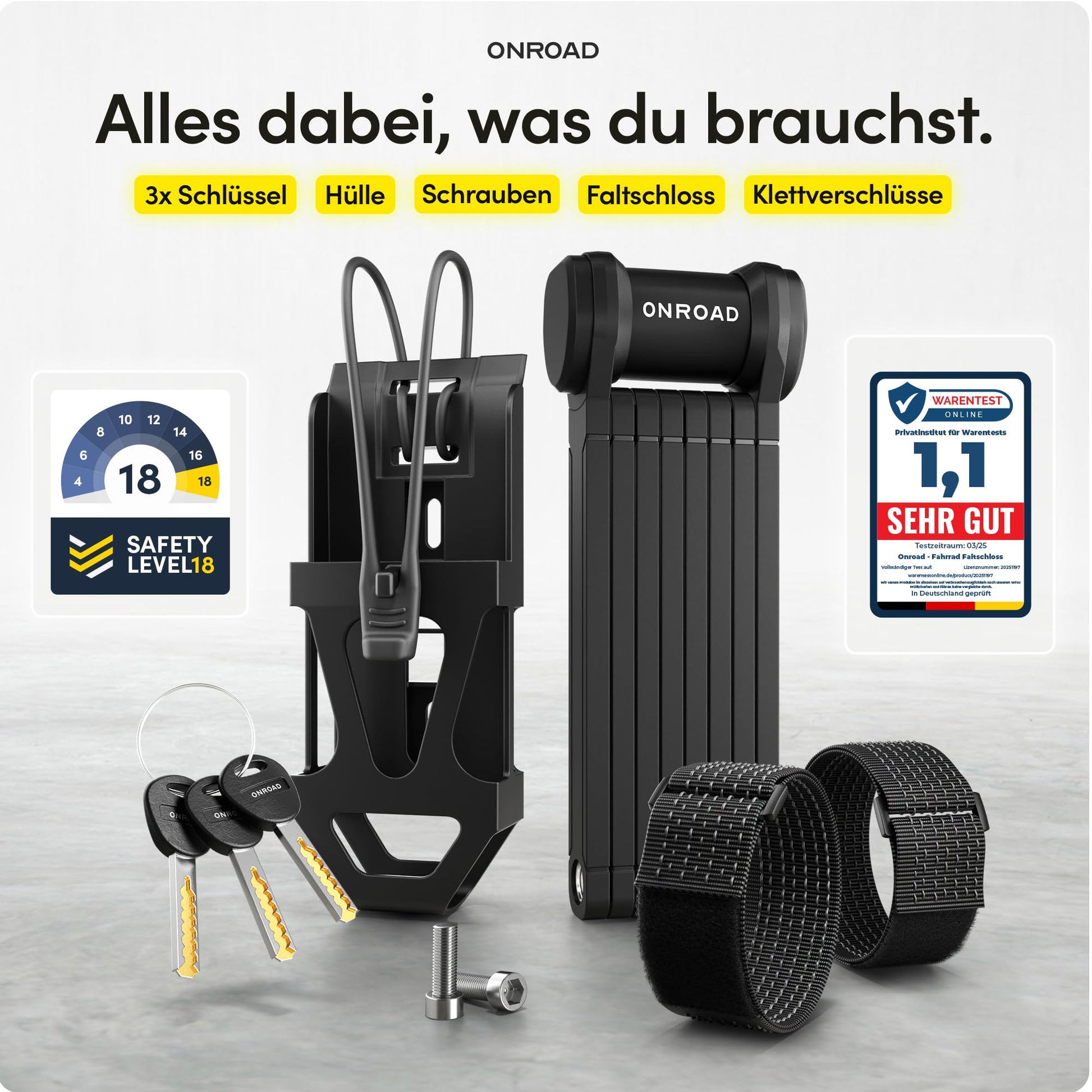 ["MAXIMUM SECURITY WITH ONLOCK - The Onroad folding lock Onlock provides reliable protection for bicycles, e-bikes, and e-scooters. The hardened steel segments resist cutting tools and ensure high resistance against break-in attempts.","ART CERTIFIED & EXTRA LONG: ONLOCK ULTRA - At 120 cm in length, the Onlock Ultra offers maximum flexibility and easily secures multiple bicycles or thicker frames. With ART certification, it meets the highest security standards and is ideal for high-quality bicycles and e-bikes.","EASY INSTALLATION - FLEXIBLE USAGE - Thanks to the included bracket, screws, and Velcro straps, you can easily attach the Onlock bike lock to the frame or another suitable location. Ideal for various types of bicycles and more.","WEATHER RESISTANT & DURABLE - Rain, snow, or heat - the Onlock bike lock withstands all weather conditions. The corrosion-resistant materials ensure a long lifespan and reliable protection, no matter where you park your bike.","INCLUDES 3 KEYS - ALWAYS HAVE A SPARE - No need to worry if a key is lost. The Onlock lock comes with three high-quality keys."]