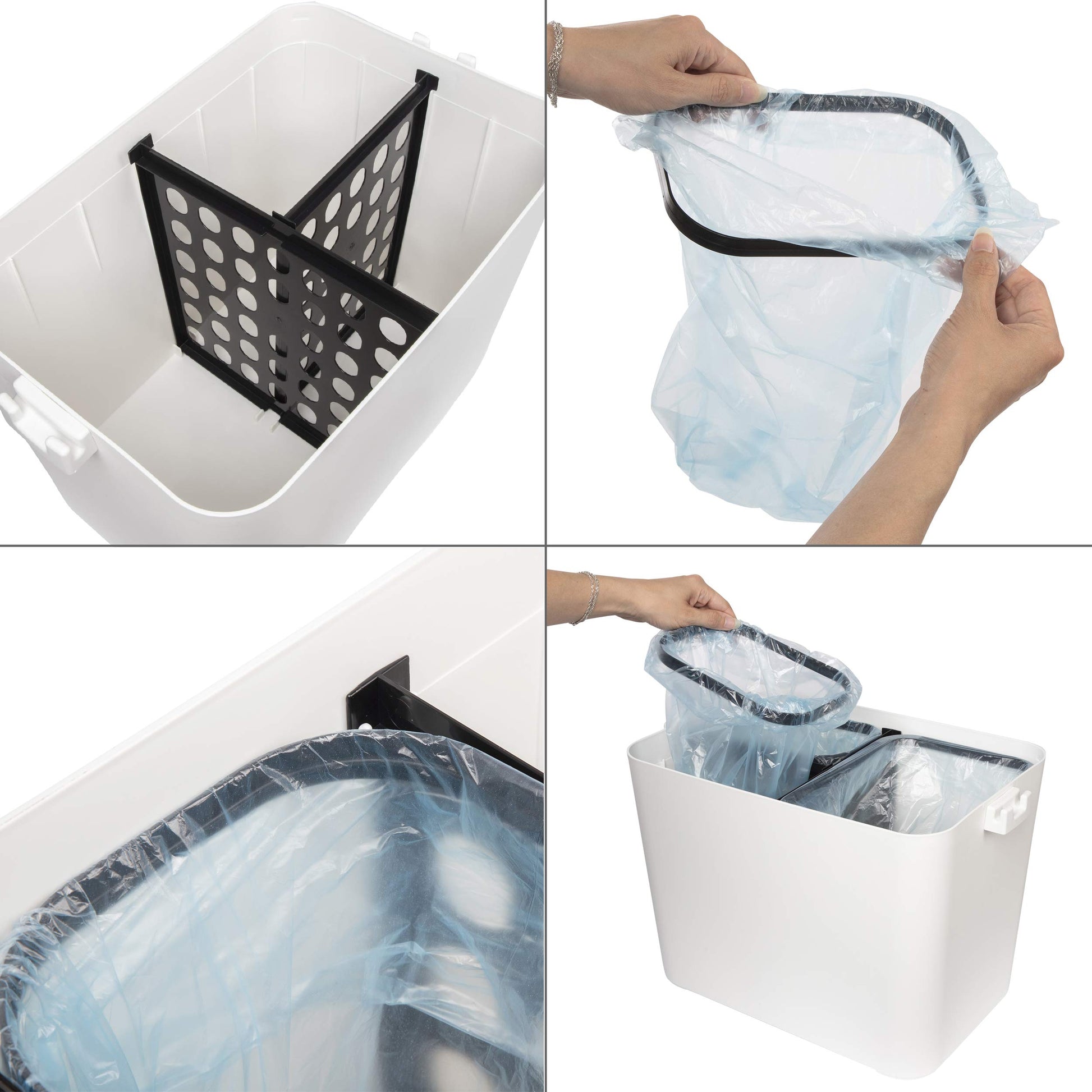 ["Space-saving Recycling Waste Separation System for Kitchen, Bathroom, and more","Clearly separated compartments make separating waste easy","Compartments of the trash can be opened separately, effectively sealing in unpleasant odors","Containers can be easily opened with a push button and lifted with small handles on the side","Inside the trash cans are rings to secure trash bags and prevent them from slipping"]